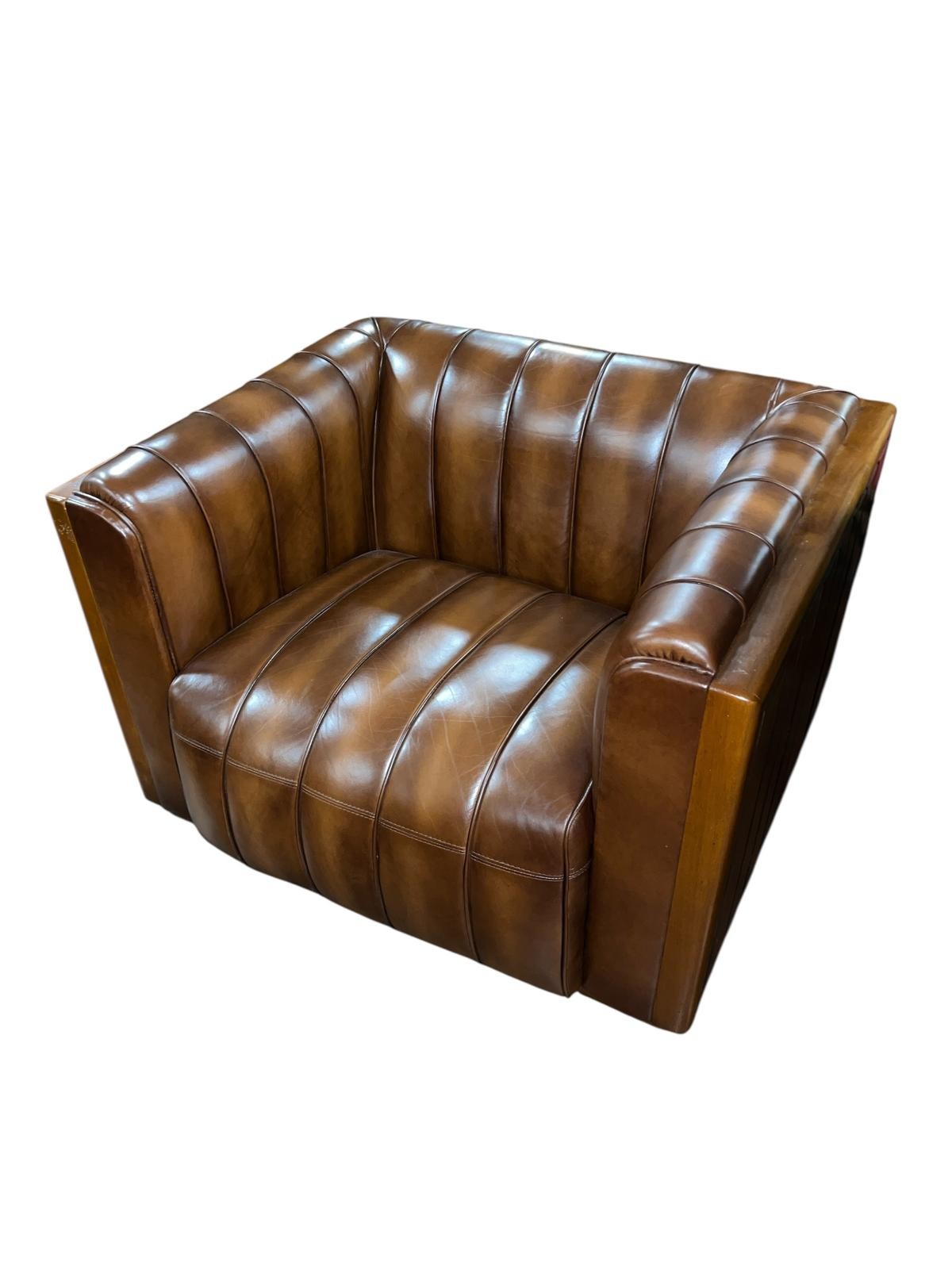 A FINE ART DECO STYLE CHERRYWOOD AND HIDE UPHOLSTERED ARMCHAIR of rectangular form with hide upholstered back and seat on moulded legs 94cm (w) x 76cm (d)