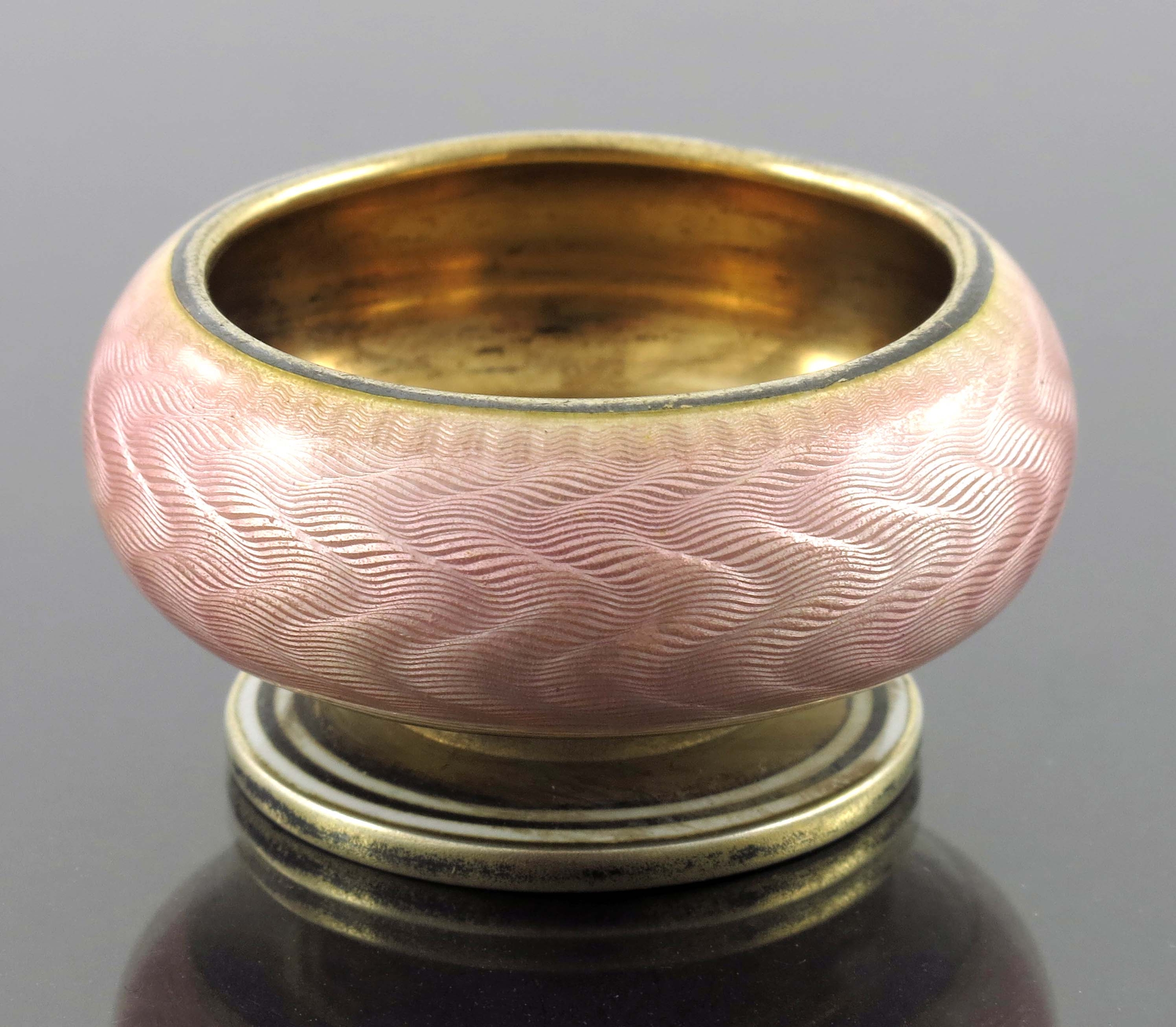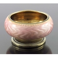 David Andersen, a Norwegian silver gilt and enamelled salt cellar, Oslo circa 1900, pedestal squat ovoid form, pink guilloche enamel, 4cm diameter, 0.99ozt