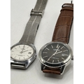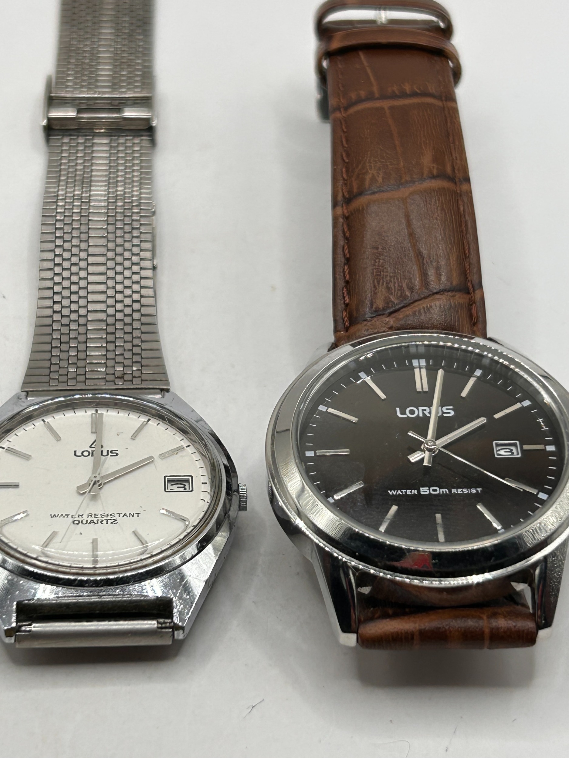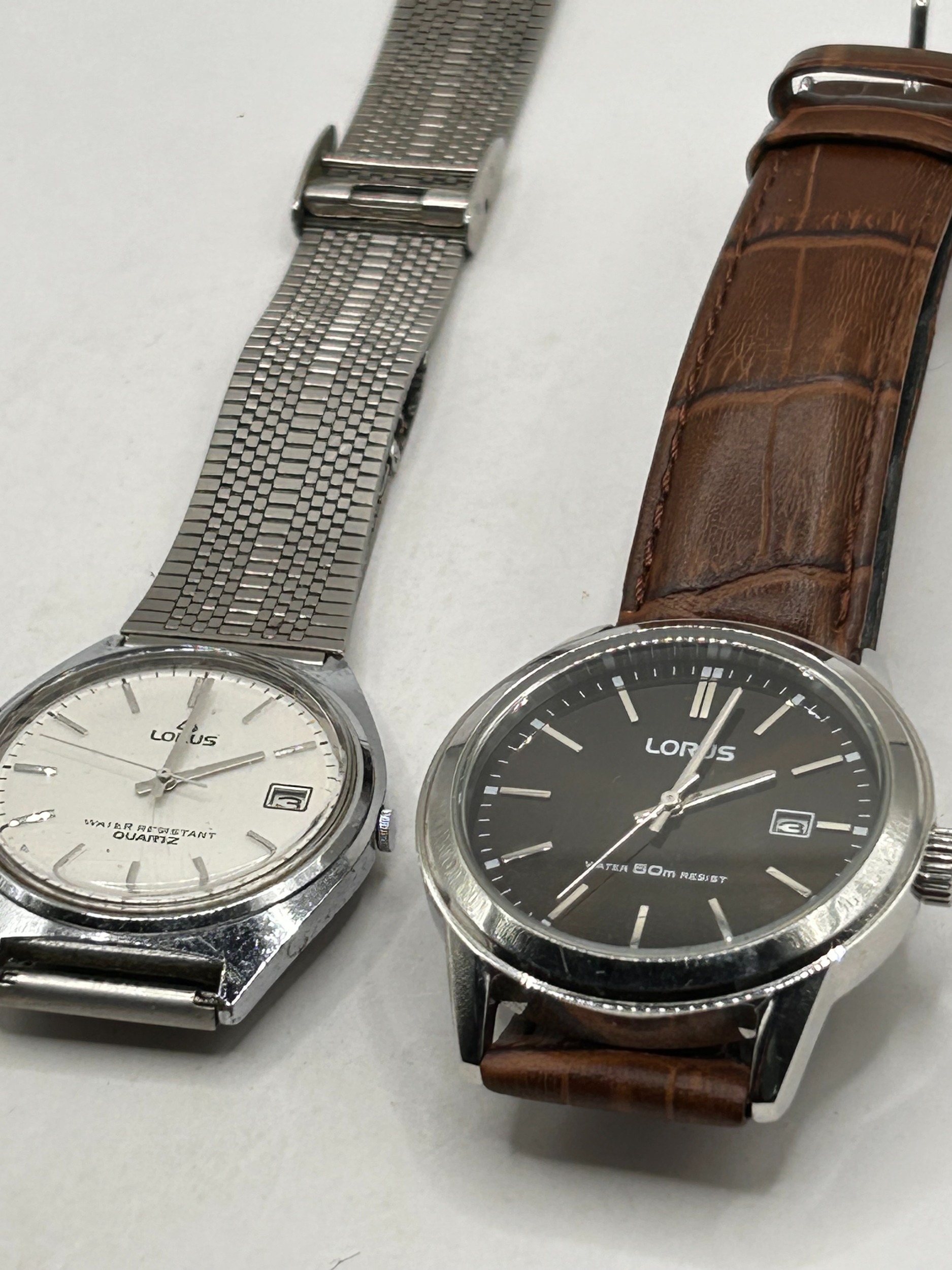 A pair of contemporary Lorus quartz wristwatches. The first watch, identified via web consensus as the Lorus Men's Analogue Model RH925BX9, features a round stainless steel case, a dark brown or black dial marked LORUS and WATER 50M RESIST, and a date window at 3 o'clock. This watch is secured by a brown leather strap with a crocodile pattern embossing. The second watch features a silver-tone octagonal case with a white dial marked LORUS and WATER RESISTANT QUARTZ, displaying a date aperture at 3 o’clock, and is fitted with a silver-tone metal mesh bracelet. Both watches utilize analogue displays and quartz movements.