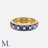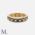 An Enamel And Diamond Ring in 18 carat yellow gold, of geometric design, decorated with black enamel and punctuated by round cut diamonds totalling approximately 0.16 carats. Marked 750 for 18 carat gold.