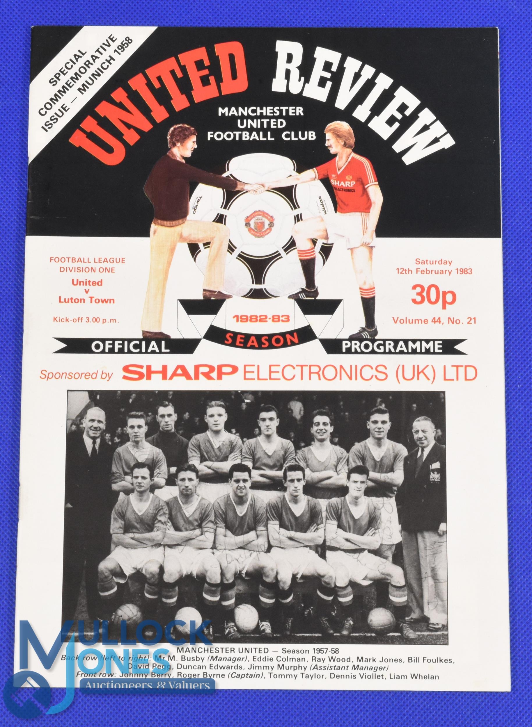 POSTPONED 1982/83 Special Commemorative Issue (25 years after the disaster) Manchester Utd v Luton Town match programme No. 21 dated 12 February 1983; good. (1)