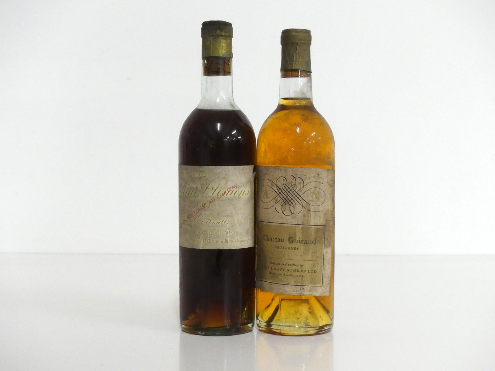 1 bt Ch. Climens 1962 Haut Barsac 1er Cru ts, aged label, sl crusted foil 1 bt Ch. Guiraud Vintage Unknown Sauternes i.n, EB Army & Navy Stores Ltd, bs, sl loose label Above 2 bottles