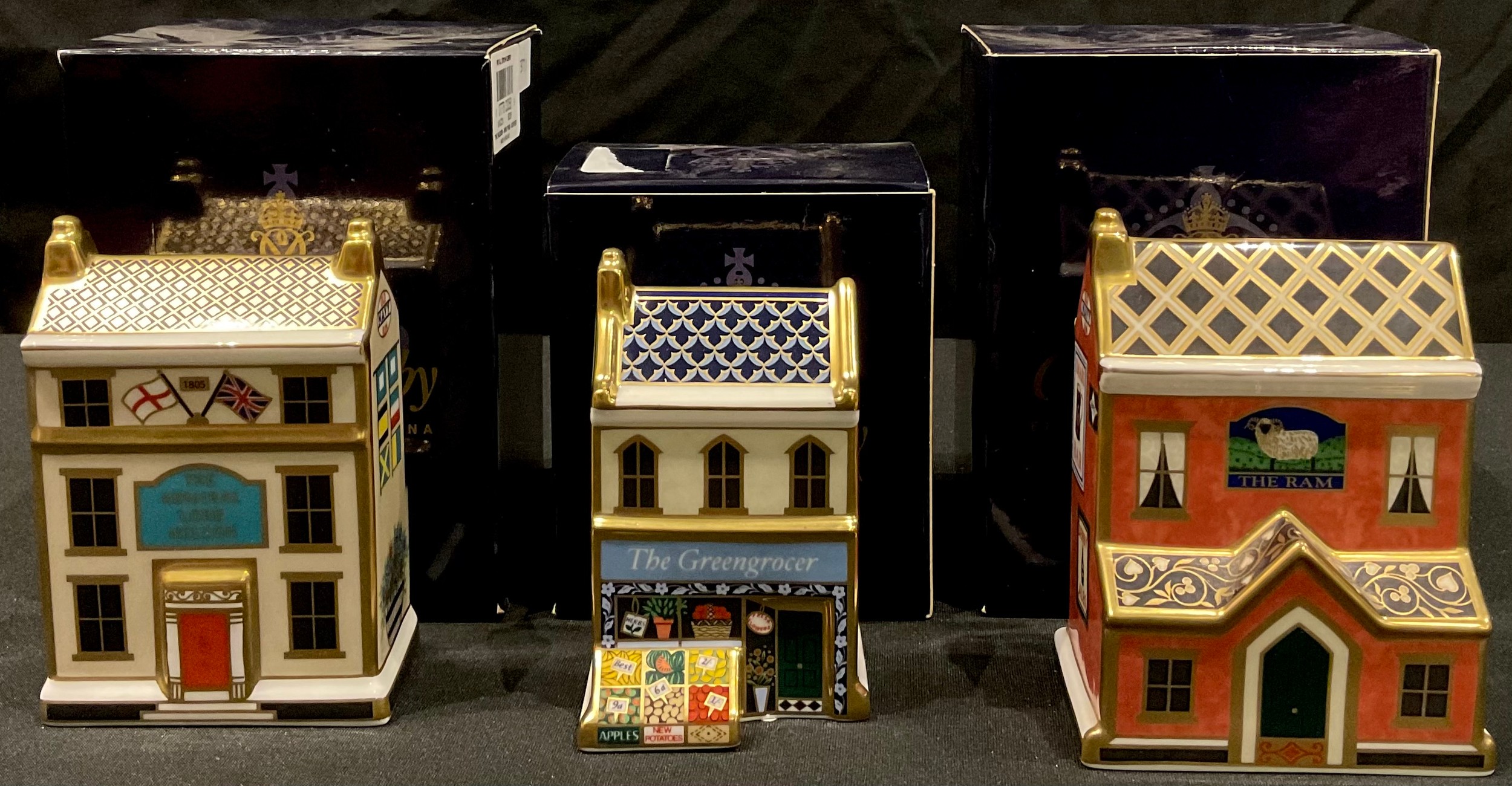 A Royal Crown Derby model The Admiral Lord Nelson, commemorating the bicentenary of the Battle of Trafalgar and Life of Nelson, 371/950, Goviers of Sidmouth, certificate; others The Ram Public House; The Greengrocers Shop, all boxed (3)