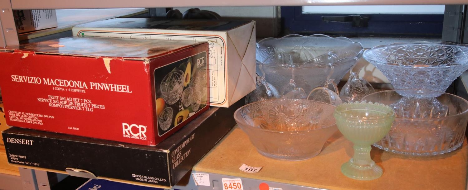 Shelf of mixed glassware including twelve piece punch bowl set and a boxed pump hot/cold beverage dispenser. Not available for in-house P&P, contact Paul O'Hea at Mailboxes on 01925 659133