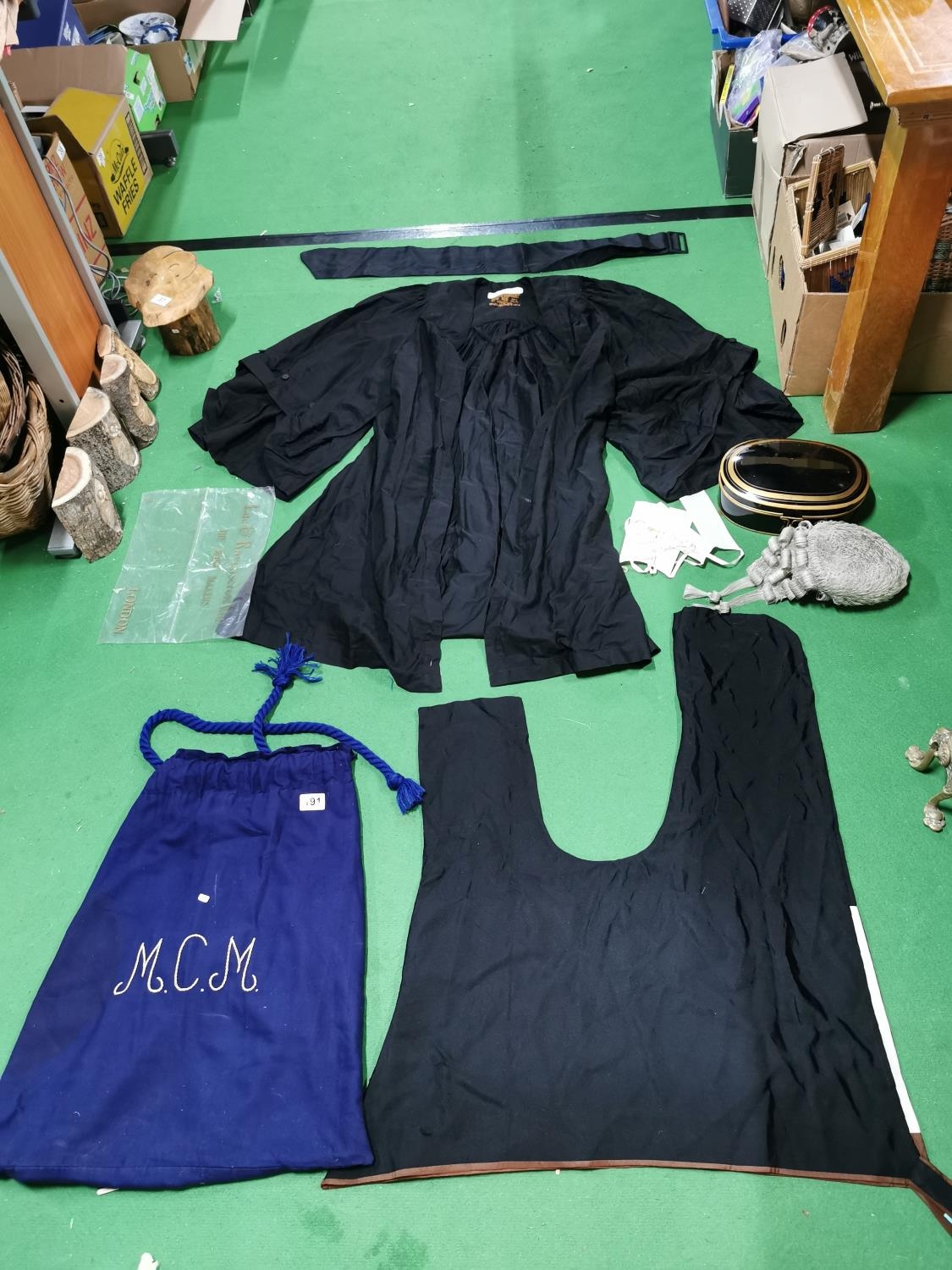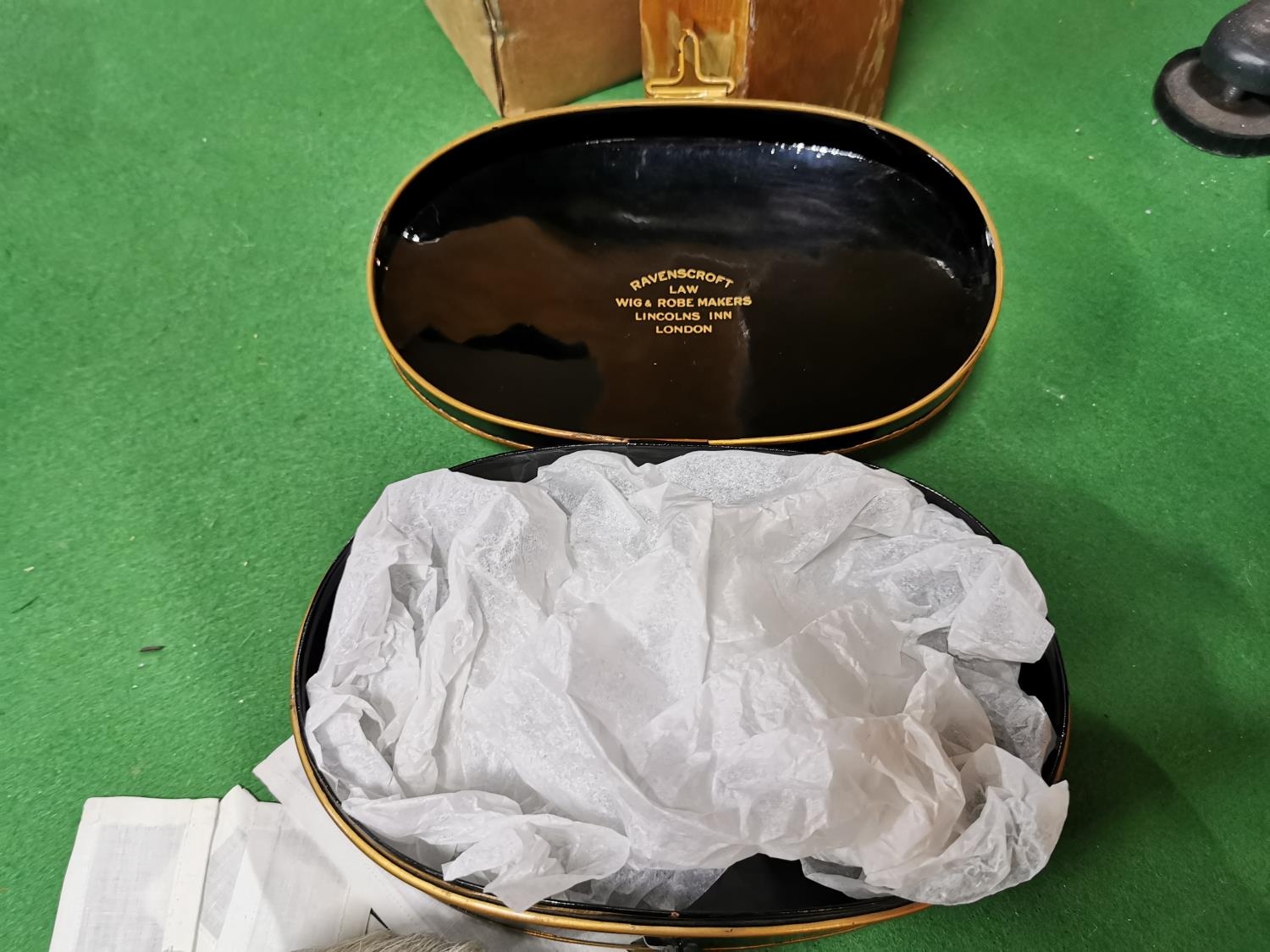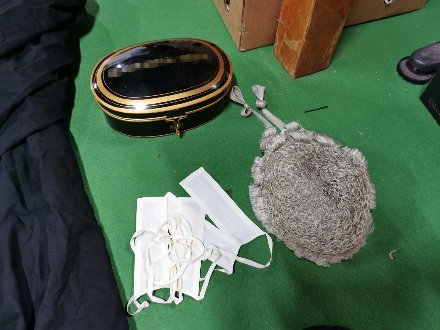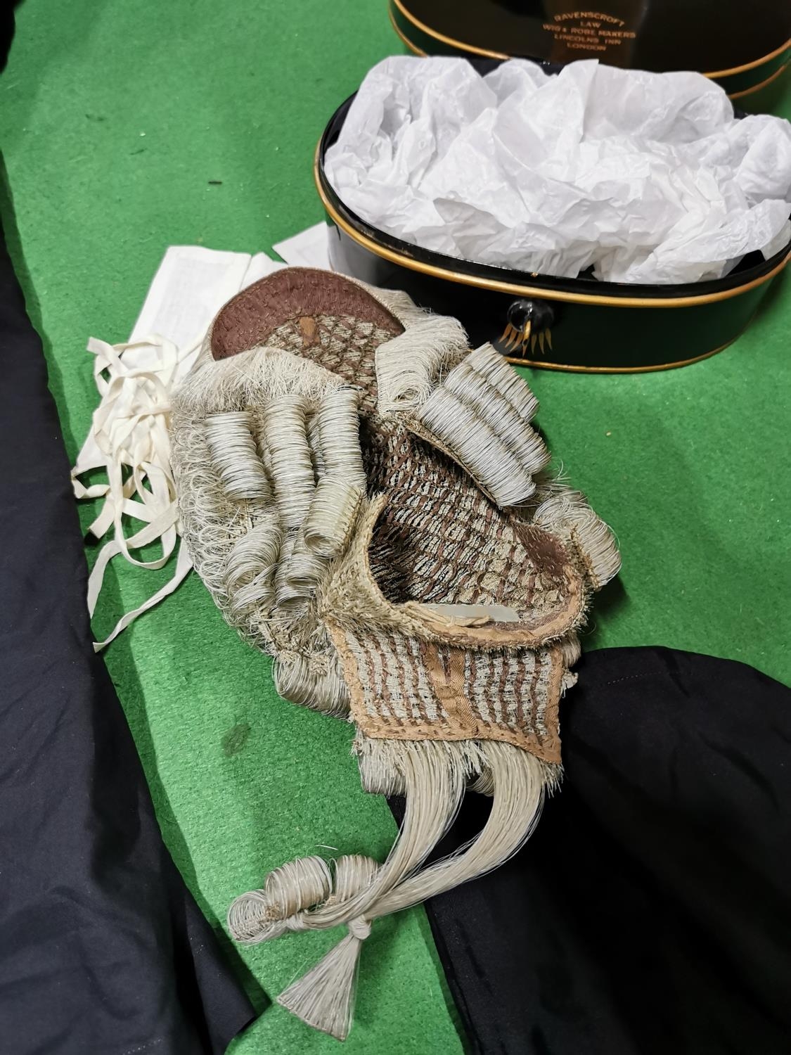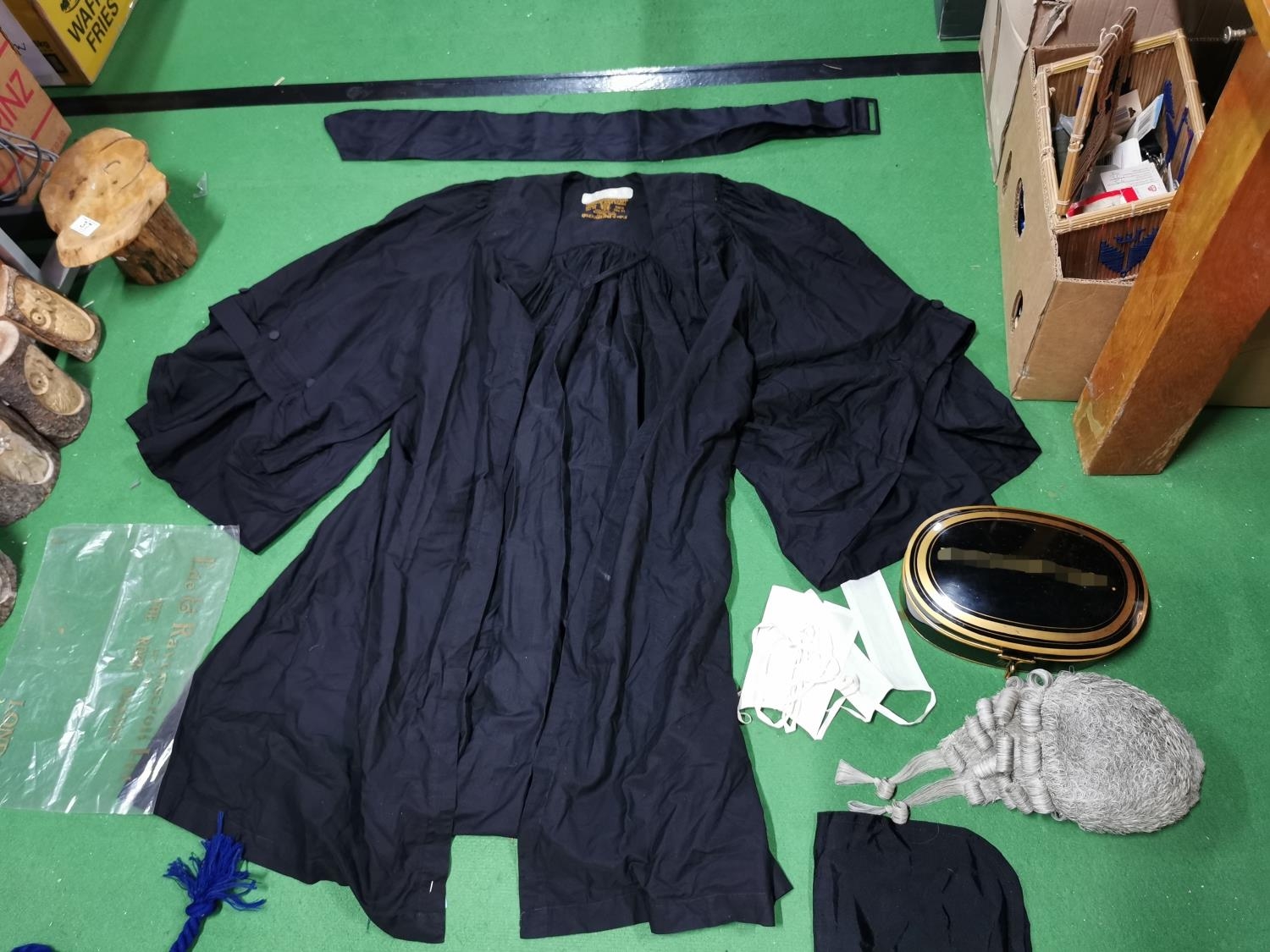 Good vintage set of Barristers robes and wig in its original tin by Ravencroft all complete
