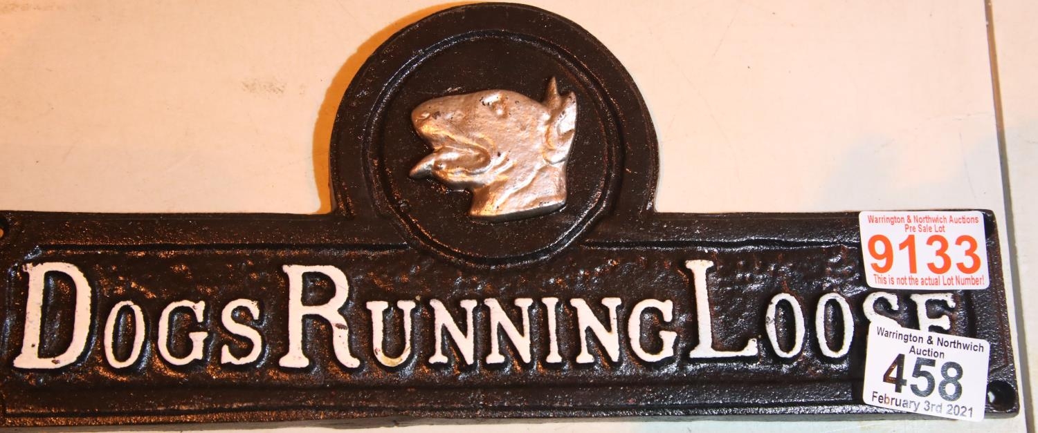 Cast iron Dogs Running Loose sign, L: 32 cm. P&P Group 1 (£14+VAT for the first lot and £1+VAT for subsequent lots)