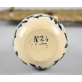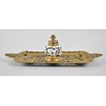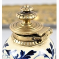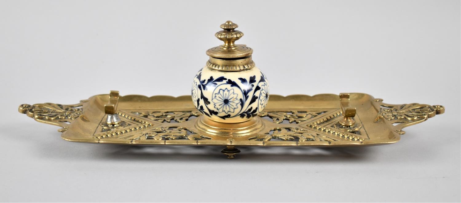 A Late 19th Century French Pierced Brass Desktop Inkstand, in the Form of a Two Handled Tray with Central Blue and White Globular Inkwell, 36cm Wide