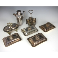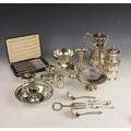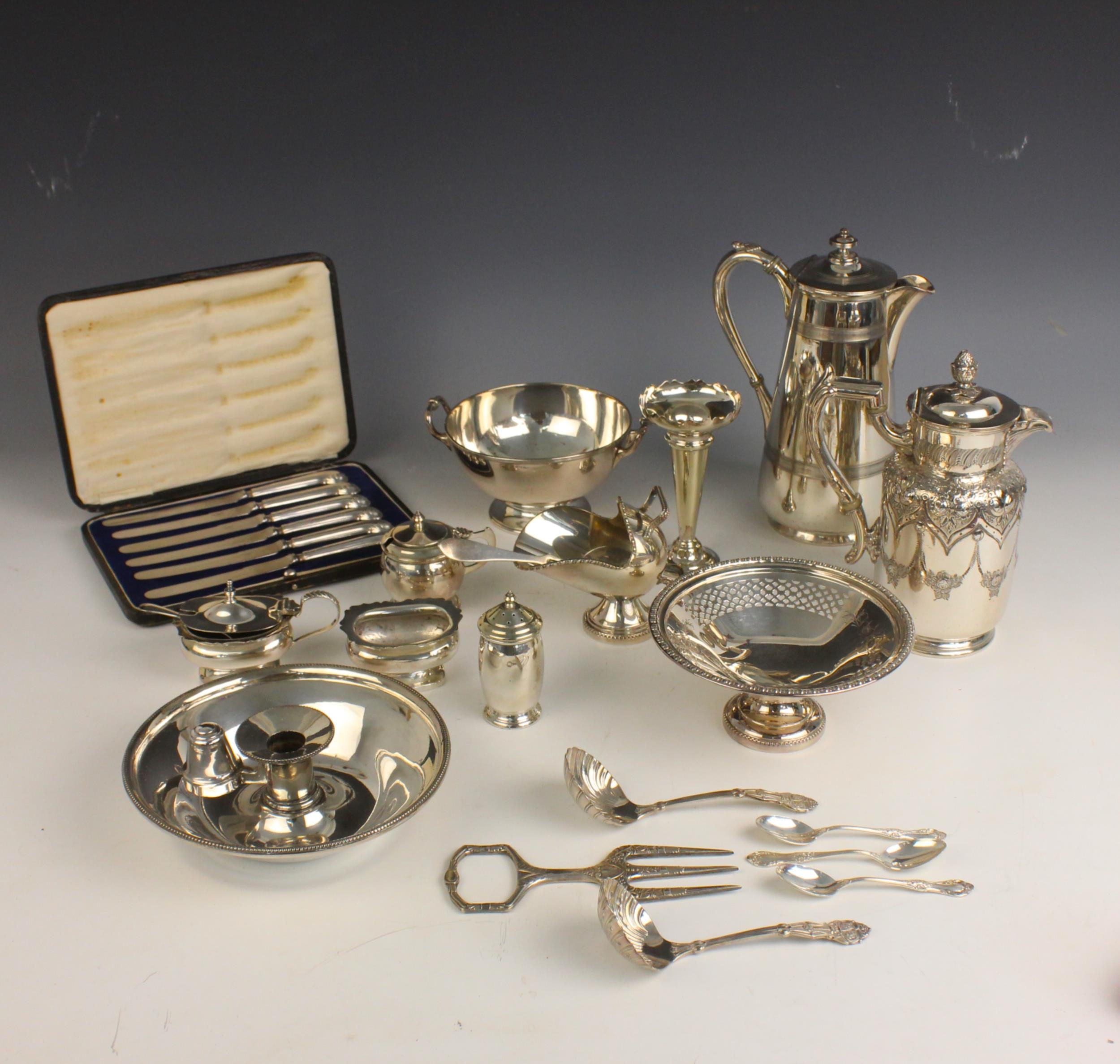 A selection of silver and silver plated flatware, to include a set of six silver handled butterknives with case, a canteen containing an assortment of EPNS cutlery, a silver plated hot water jug, and further silver plated items (Qty) (at fault)
