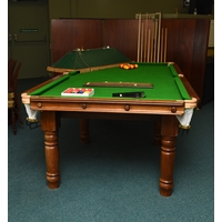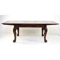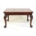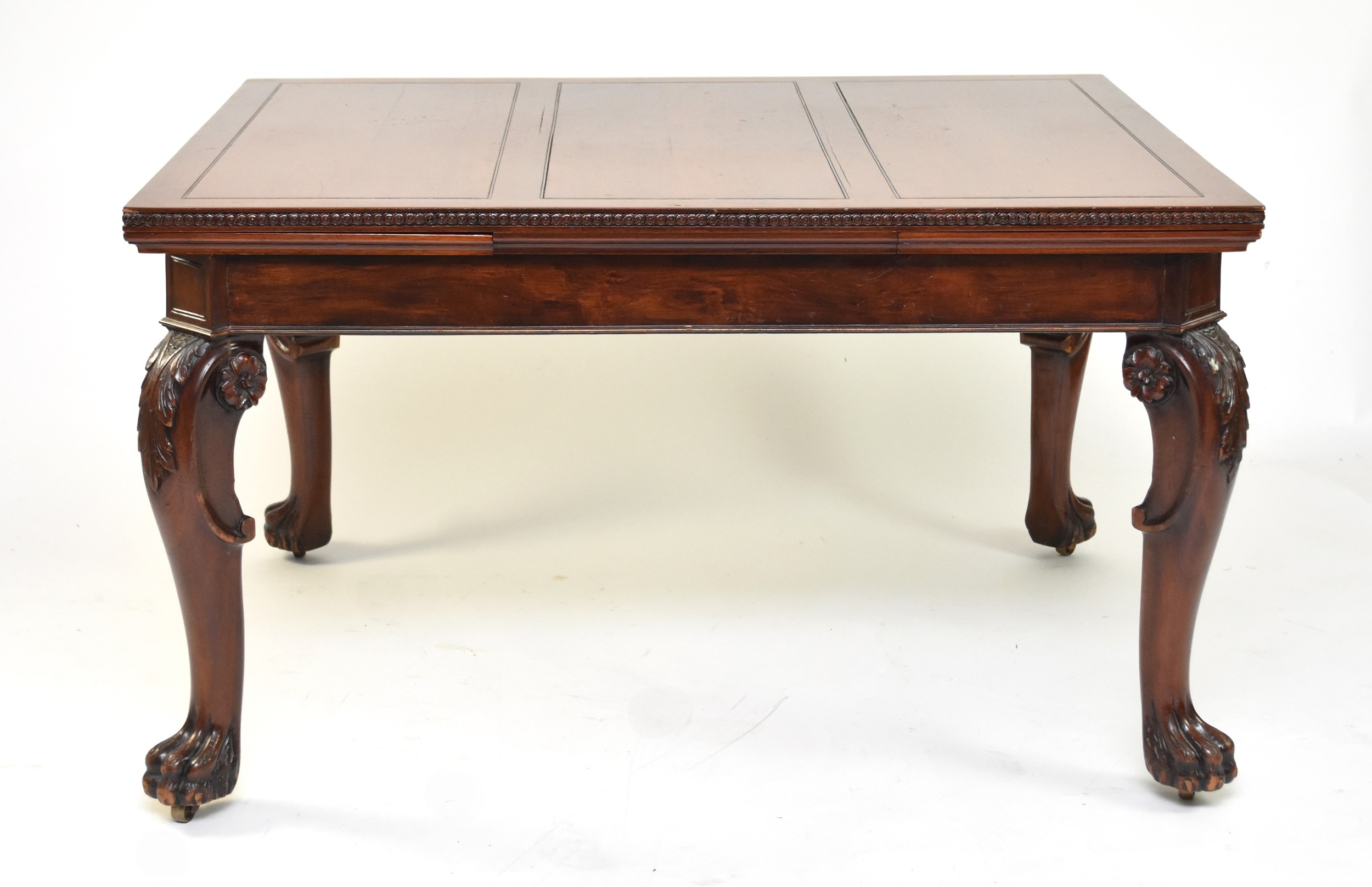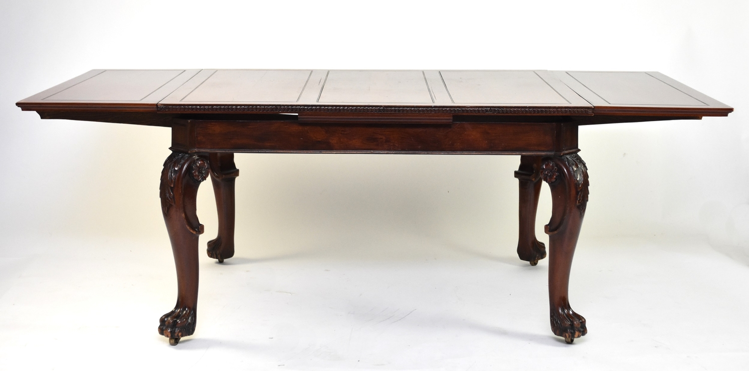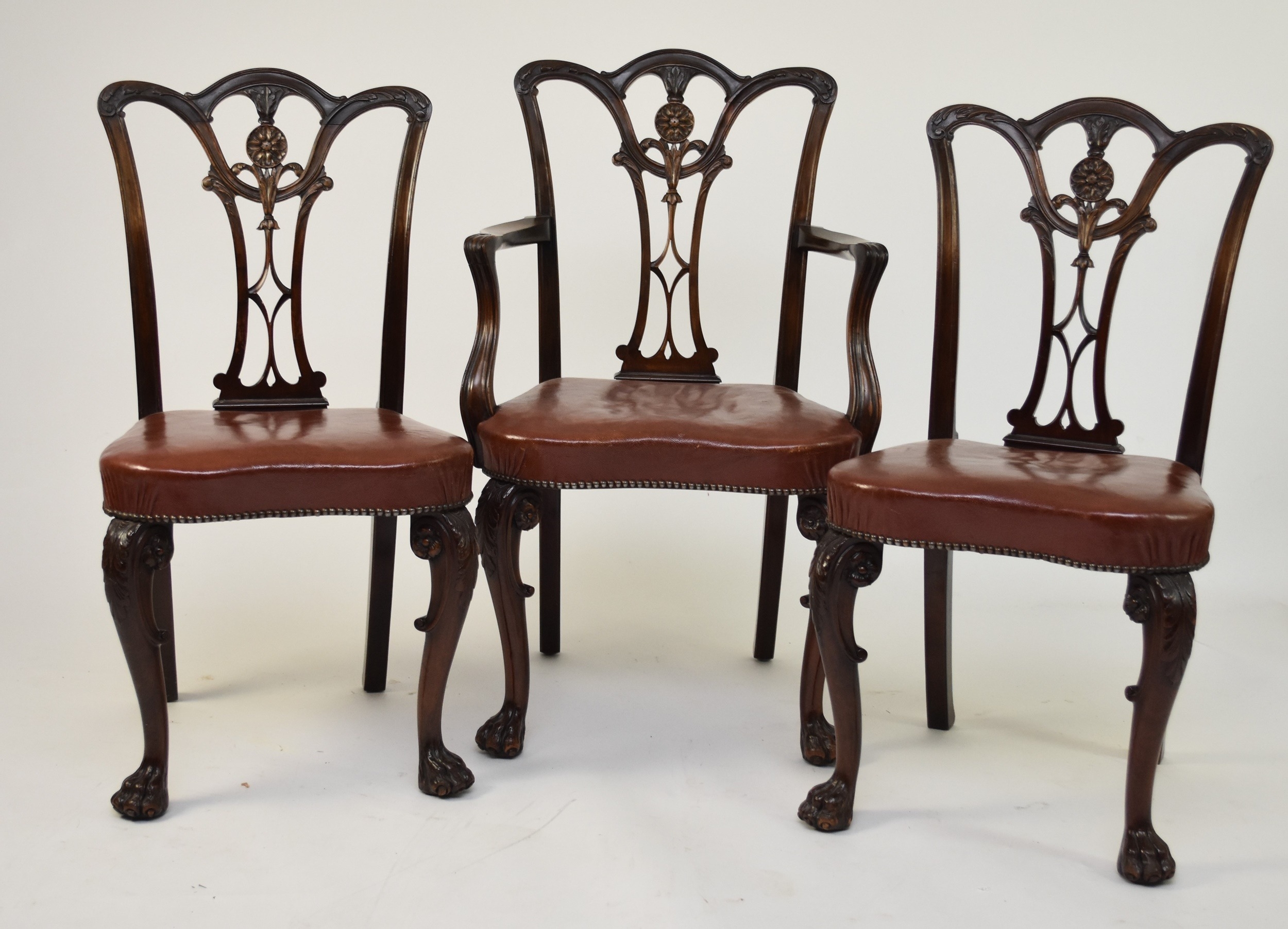 A mahogany draw-leaf dining table, early 20th century The top with guilloche moulded edge above a plain frieze with canted corners, raised on leaf-capped cabriole supports with claw feet and brass castors, 211cm long (129cm closed) x 107cm deep x 75cm high, together with a set of six (4+2) mahogany Chippendale style dining chairs With pierced and carved splats, tan leather stuff-over seats, raised on leaf-capped cabriole front supports with claw feet, comprising four standard chairs and two carvers, seat height 47cm (7) Condition:Minor cosmetic marks and signs of use. All sturdy. Upholstery good. No worm.