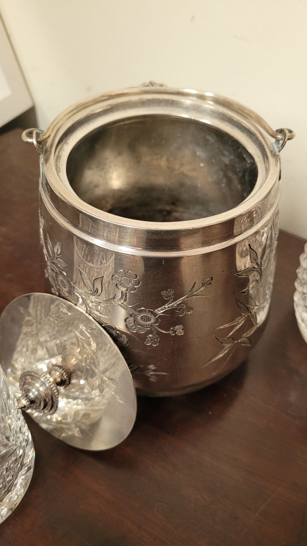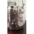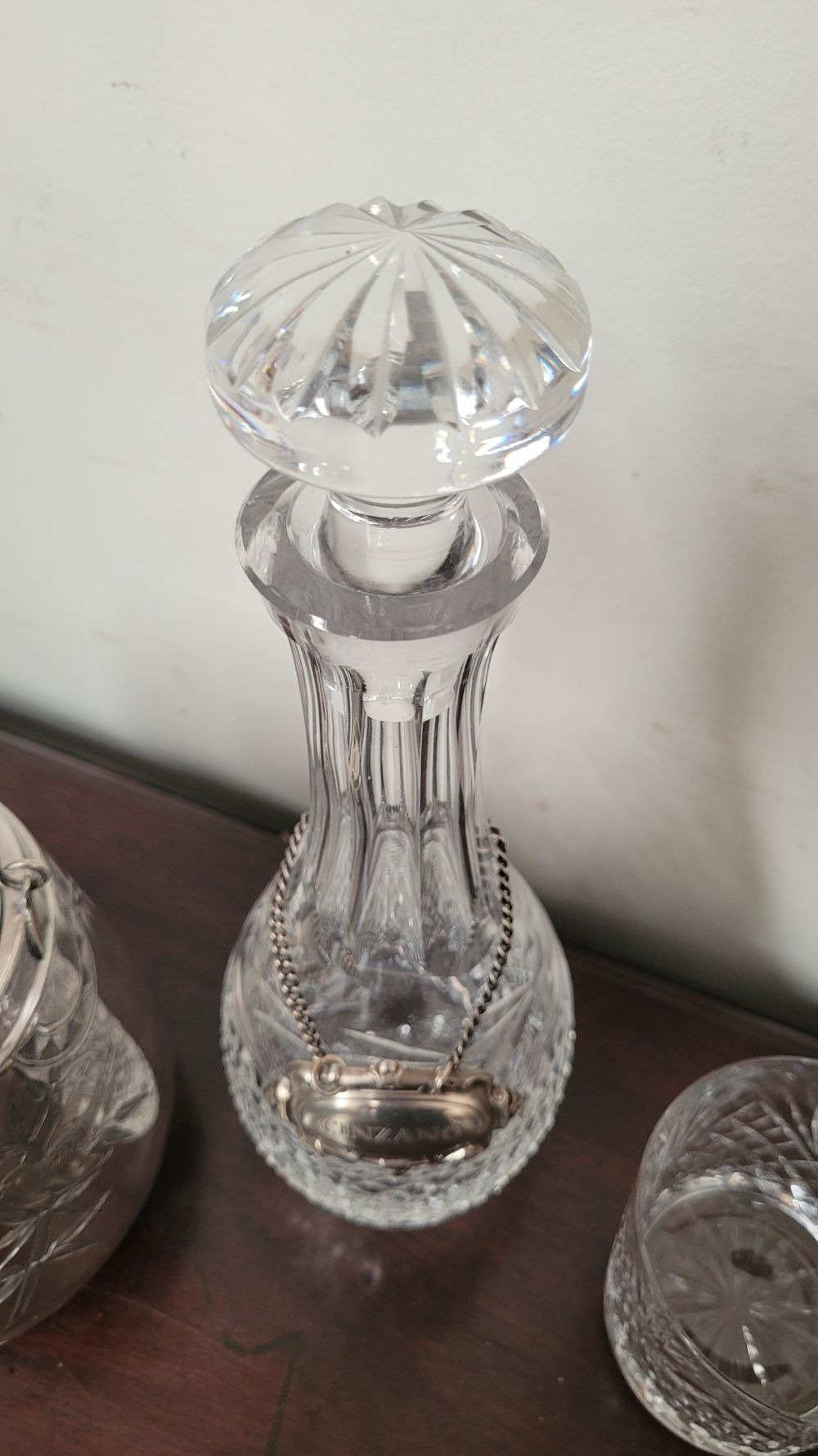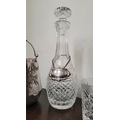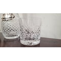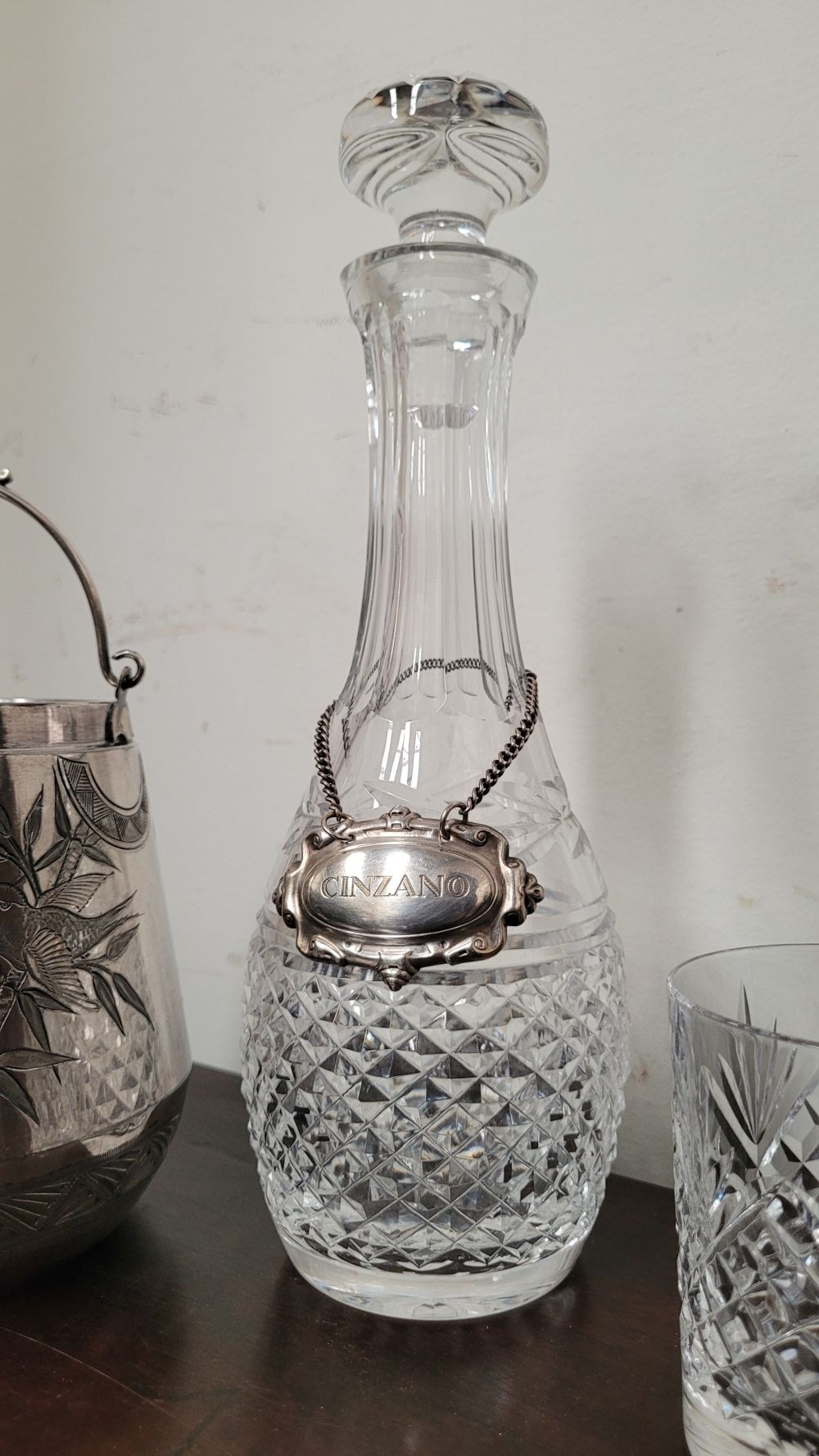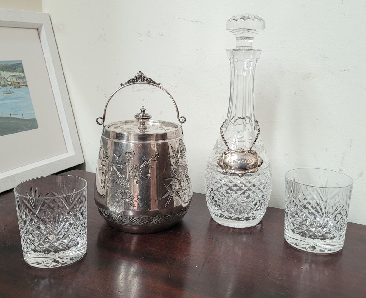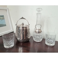 A WATERFORD CRYSTAL DECANTER, along with a pair of glasses and a lovely silver plate ice container – decorated with engraved bird & floral decoration with a swing handle and lid. The decanter complete with stopper and label for Cinzano, Waterford acid mark to the underside of the bottle.