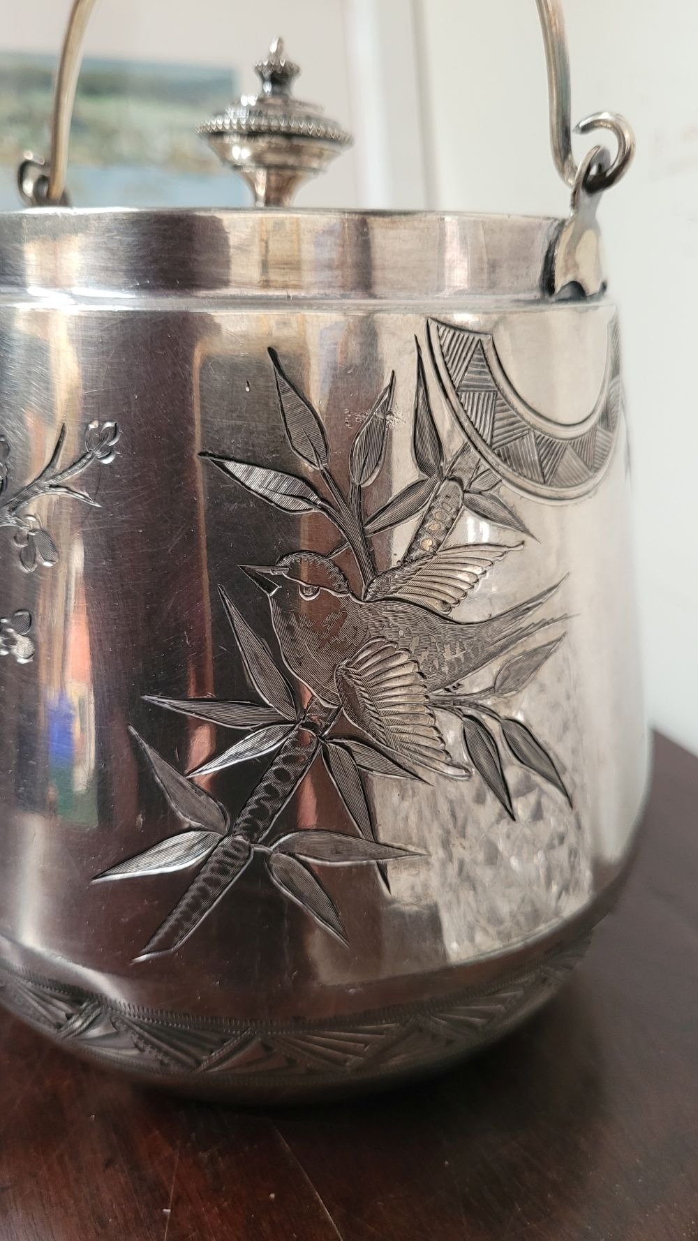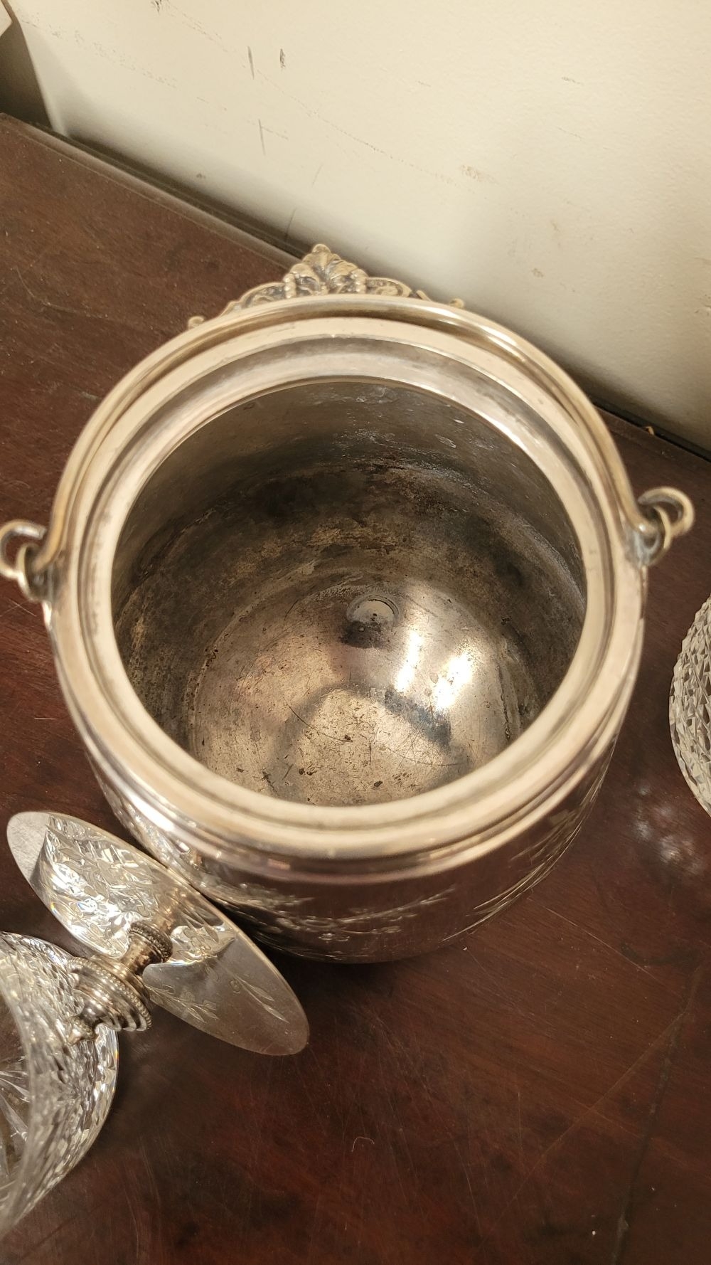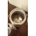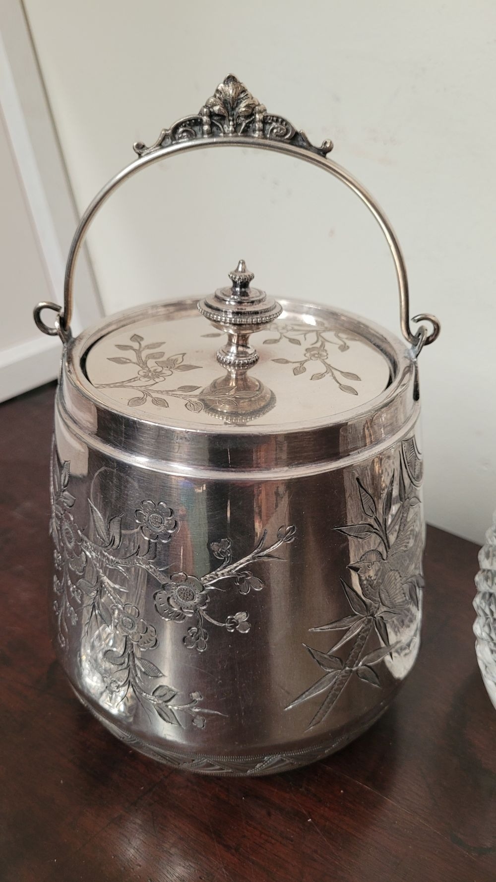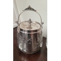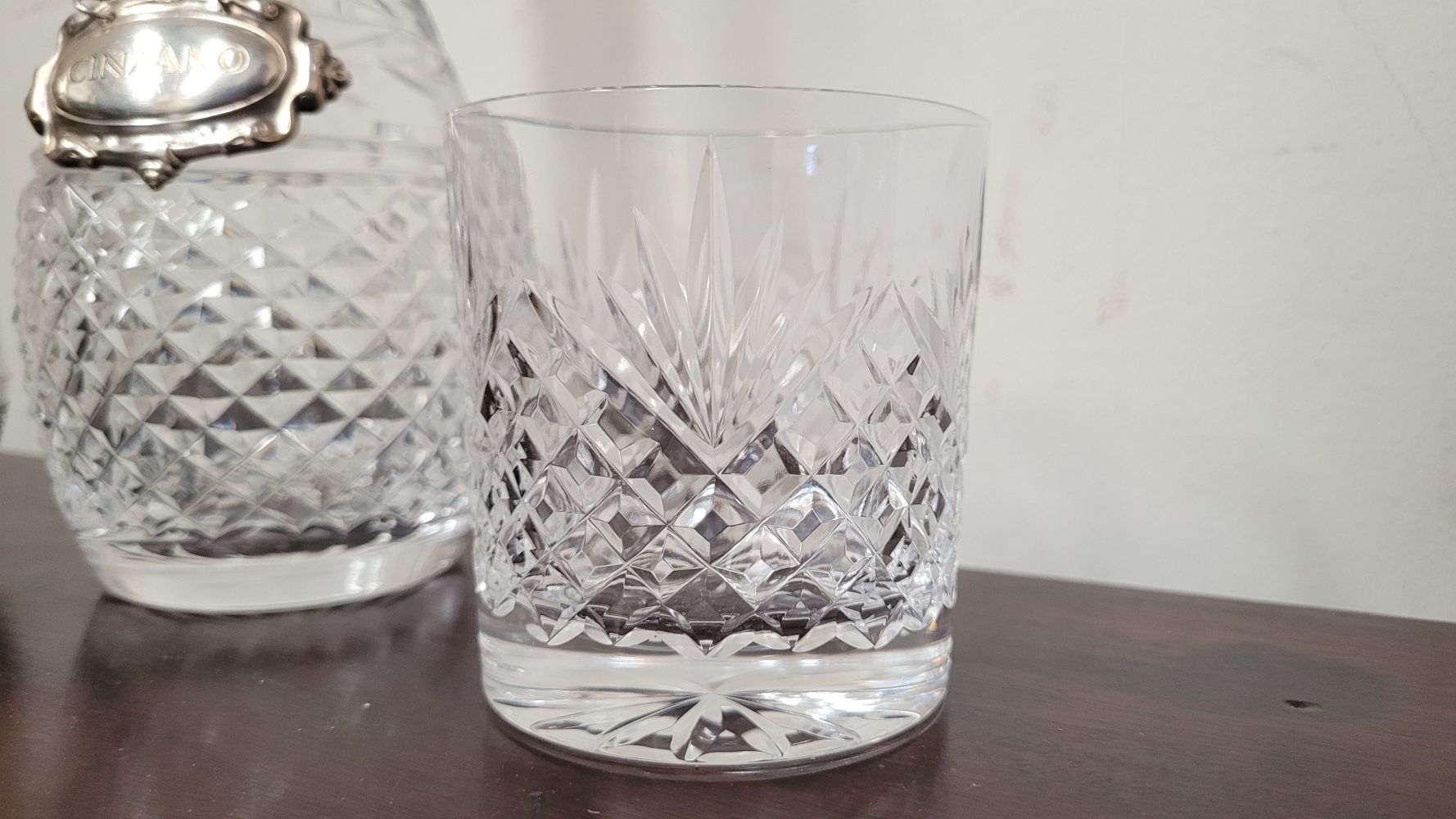 A WATERFORD CRYSTAL DECANTER, along with a pair of glasses and a lovely silver plate ice container – decorated with engraved bird & floral decoration with a swing handle and lid. The decanter complete with stopper and label for Cinzano, Waterford acid mark to the underside of the bottle.