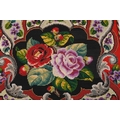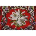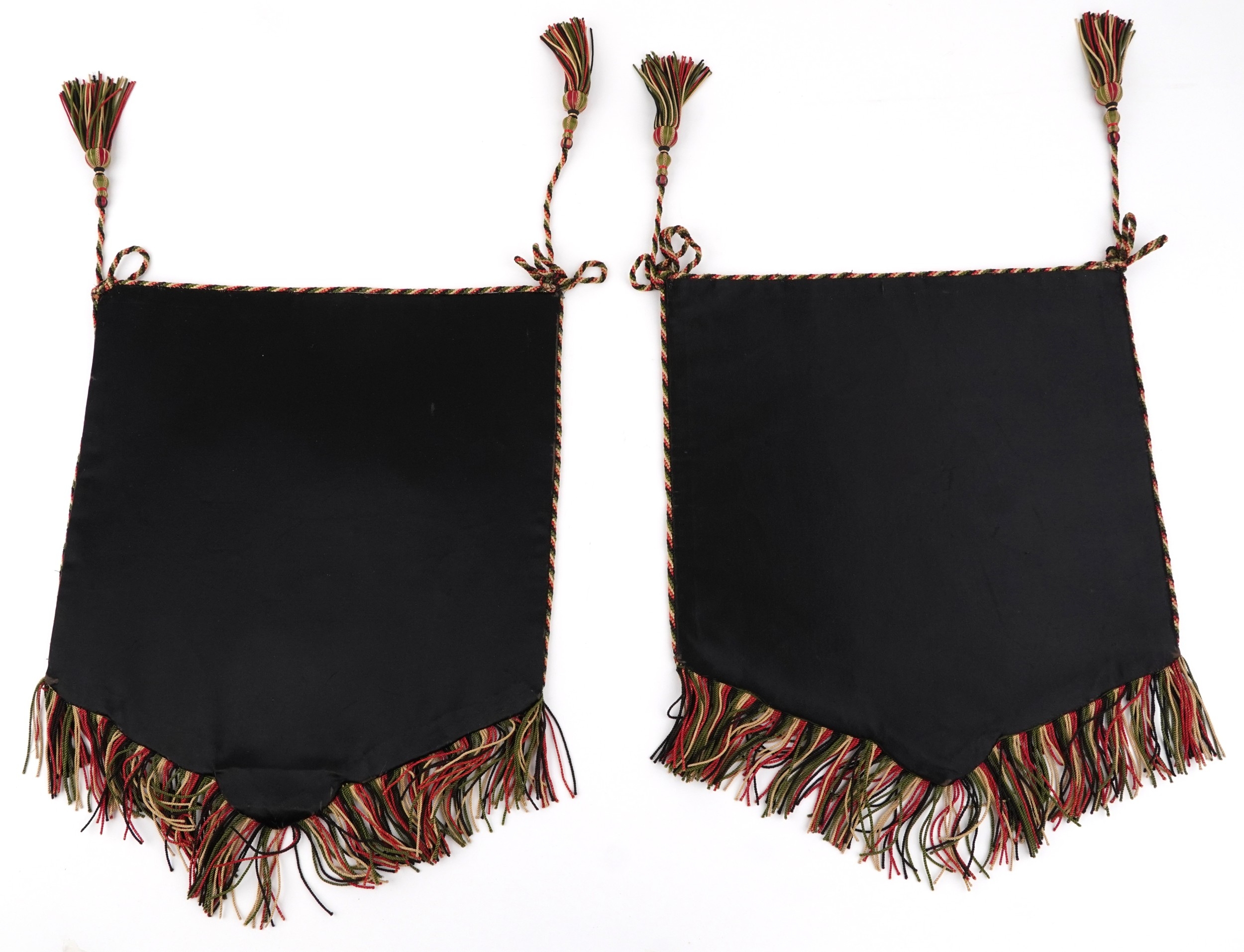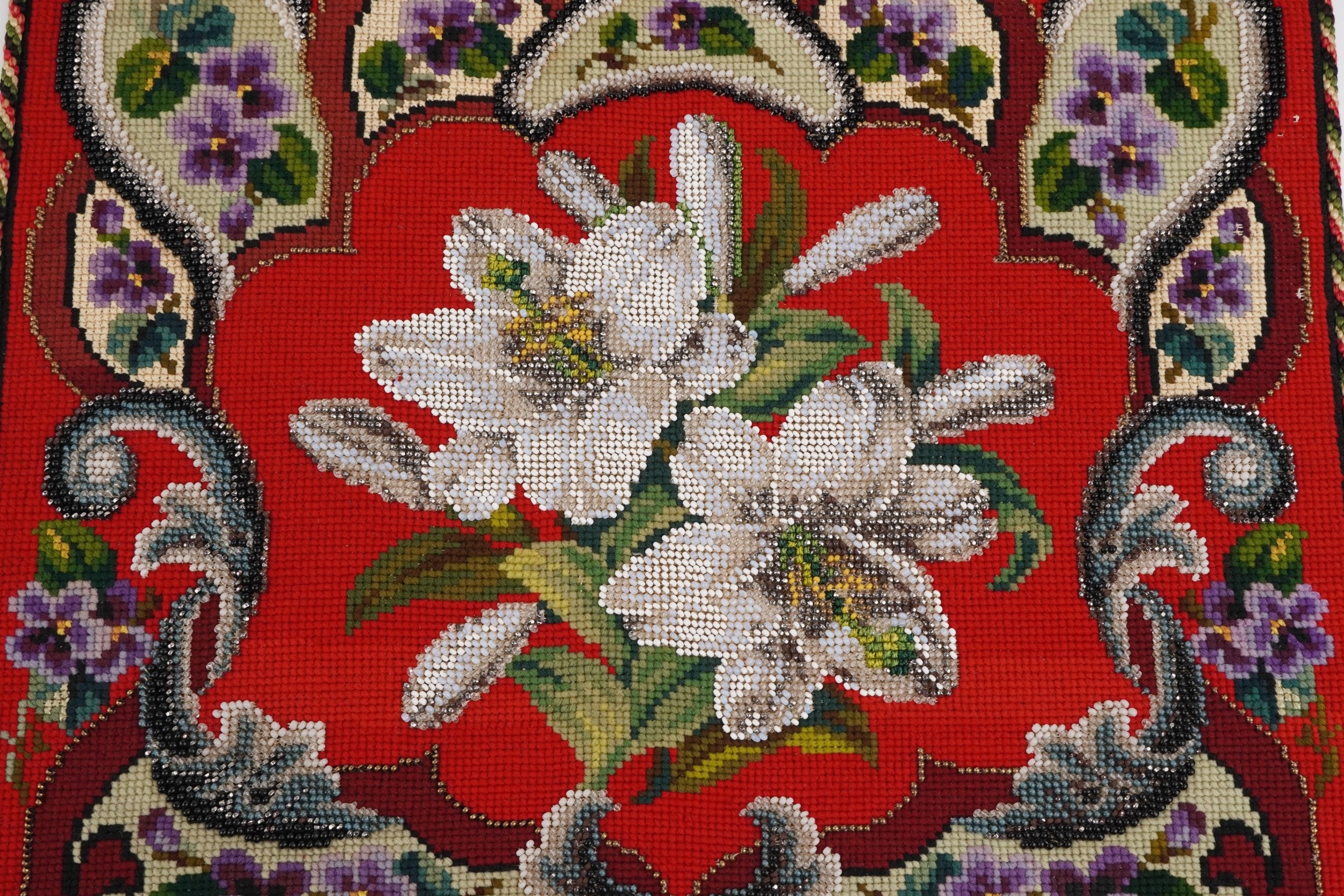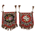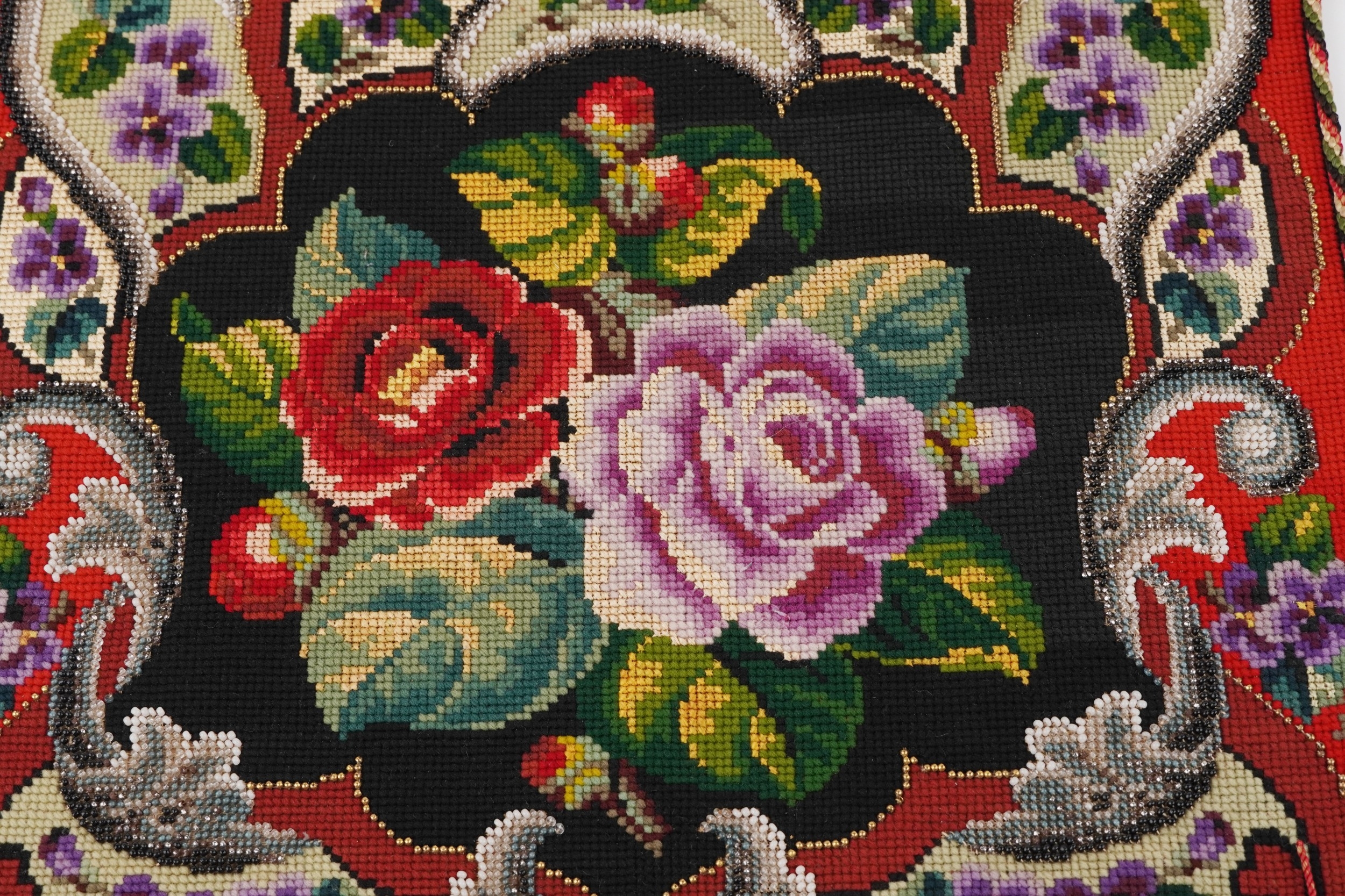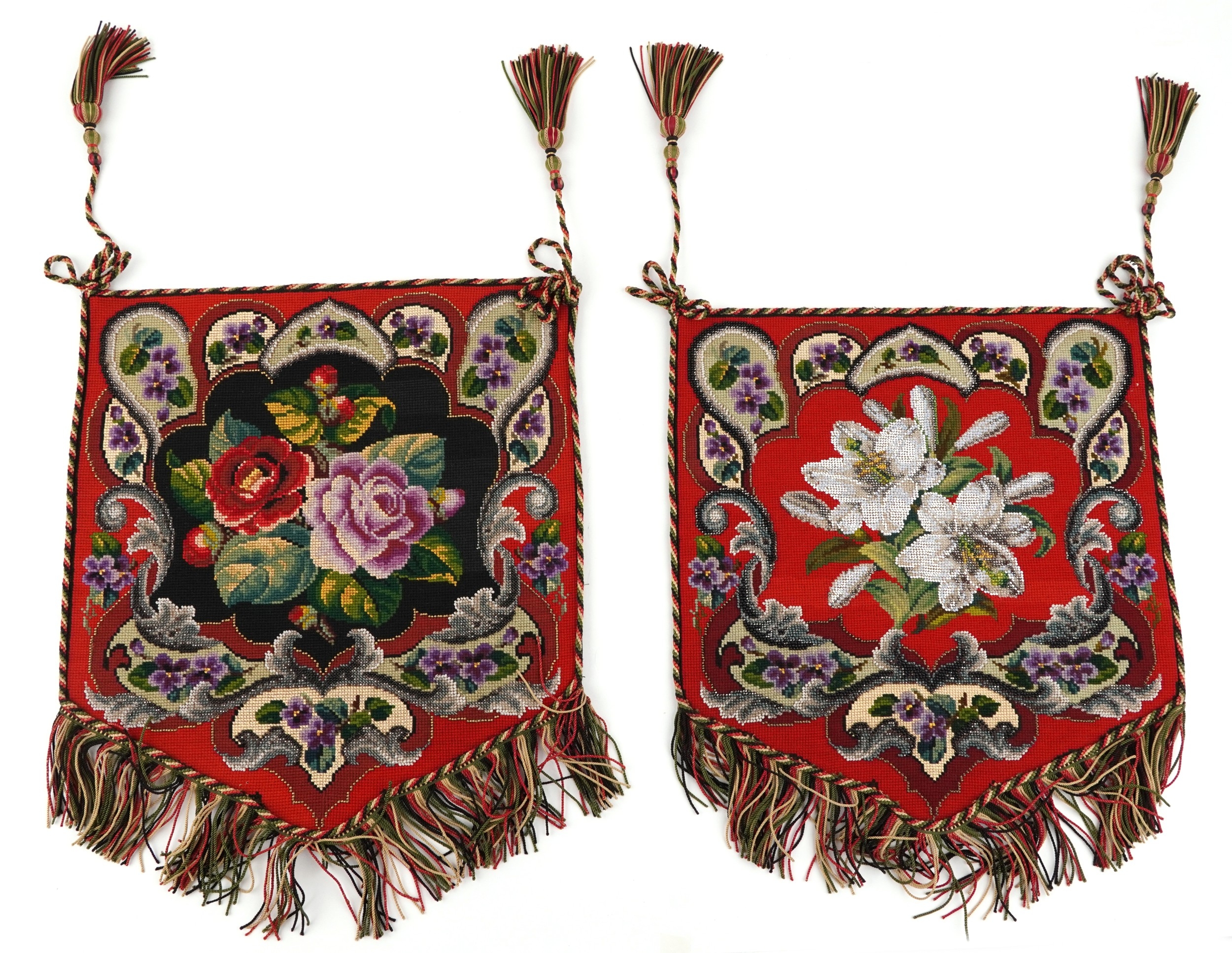 A pair of mid 20th century embroidery and beadwork pole screen panels with floral decoration, 49cm x 44cm.