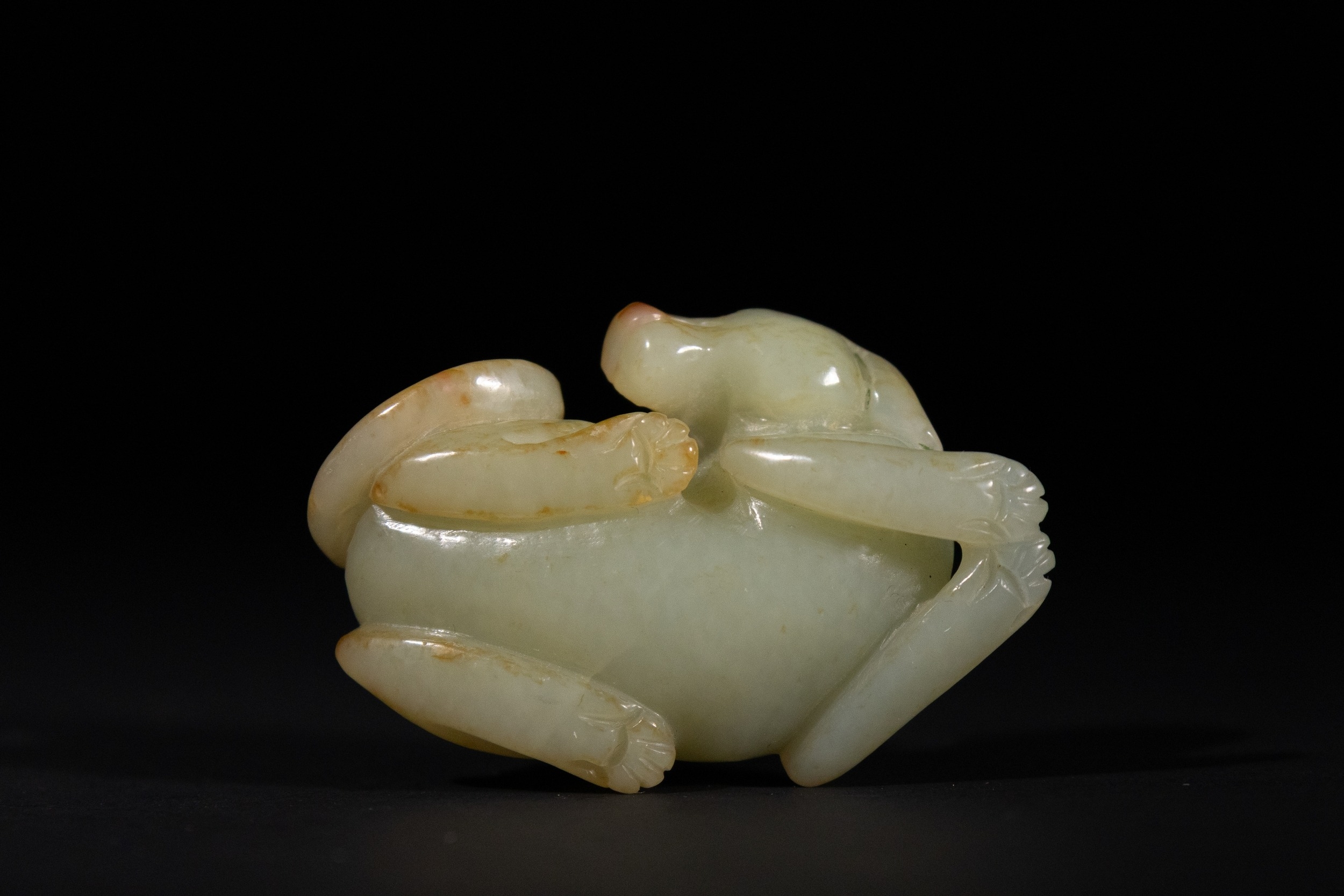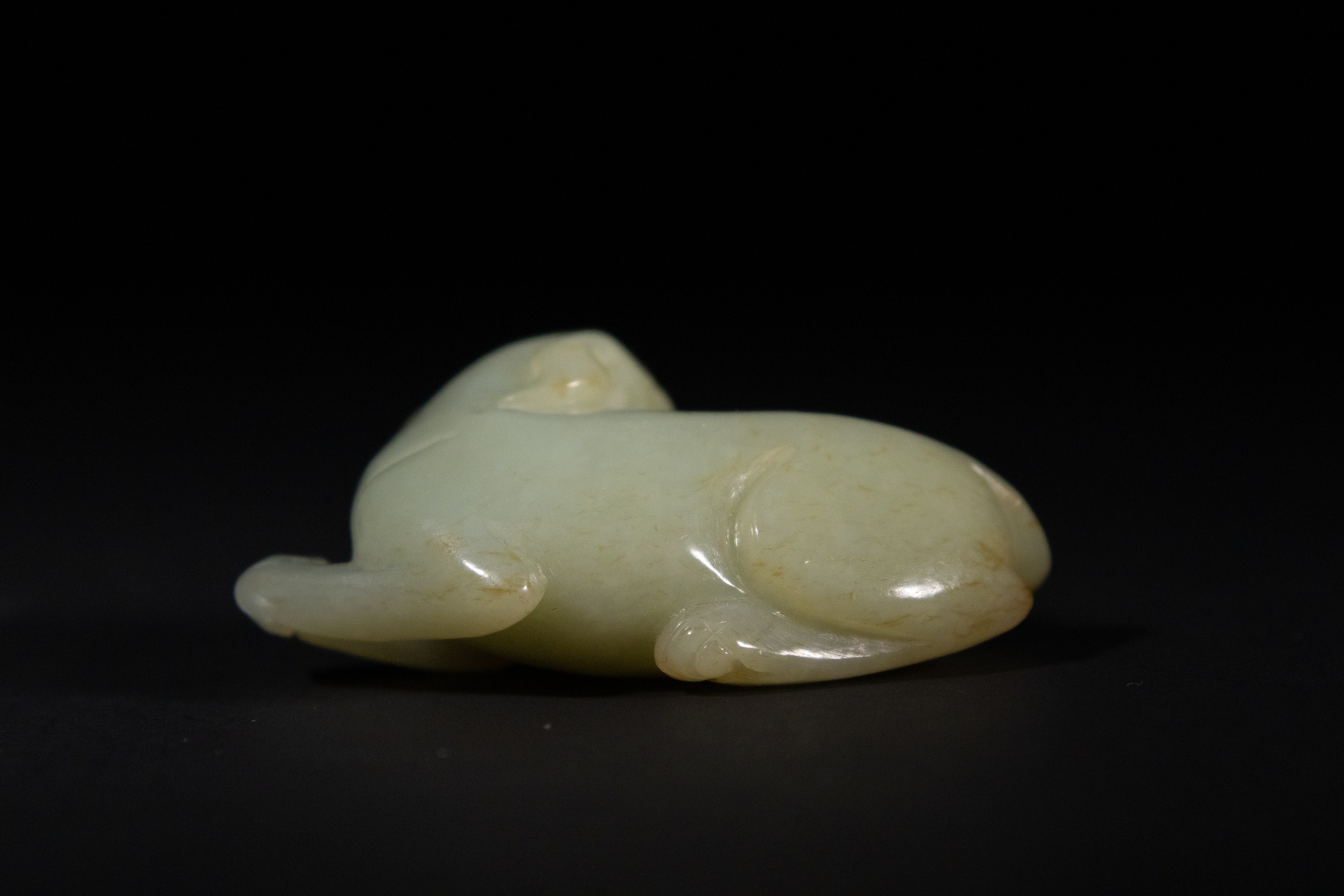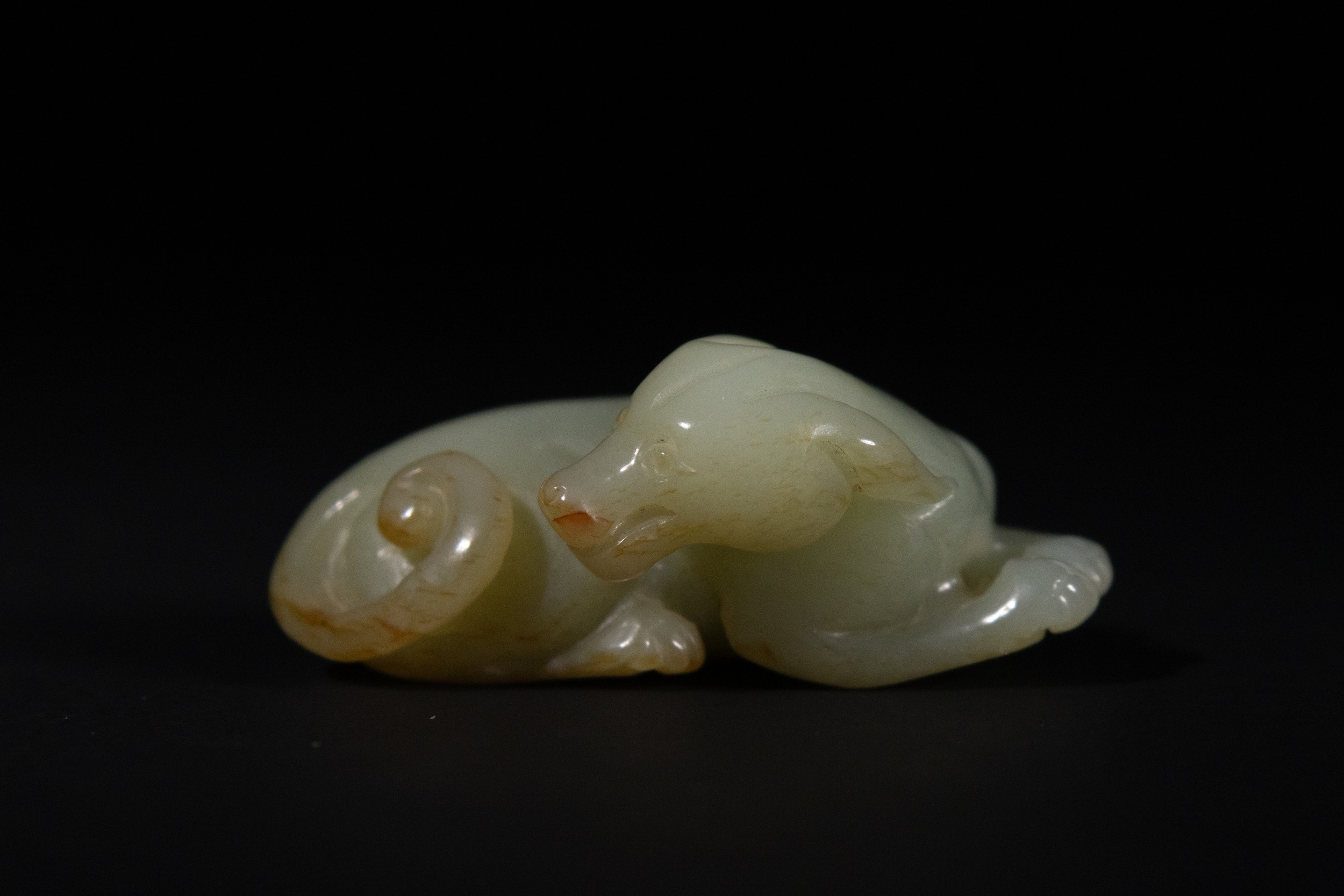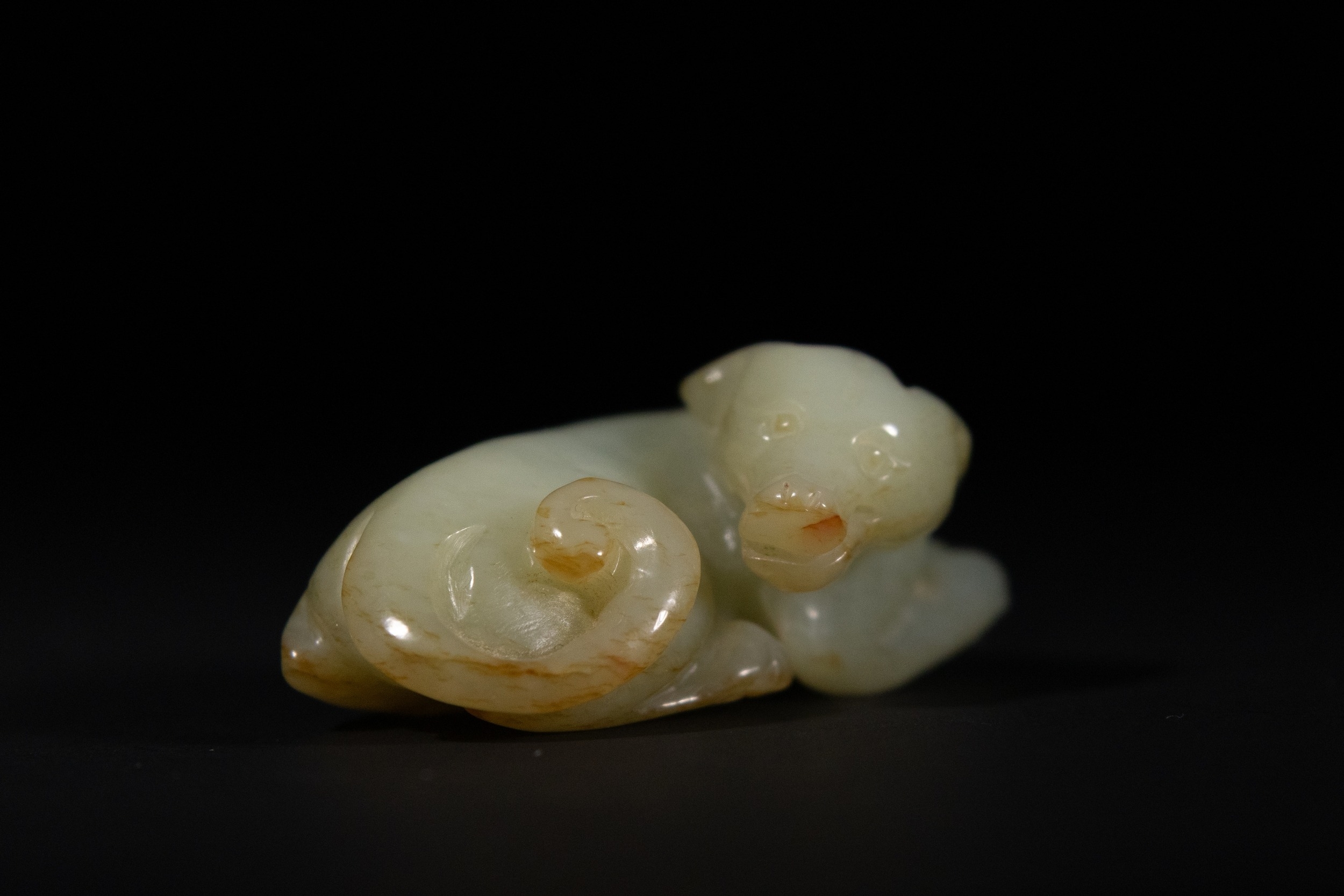 The pale celadon jade carving depicts a mythical beast in a recumbent posture, with its body curled and its tail tightly coiled alongside the flank. The head is turned slightly to the side, featuring rounded ears, a pronounced snout, and incised facial detailing.