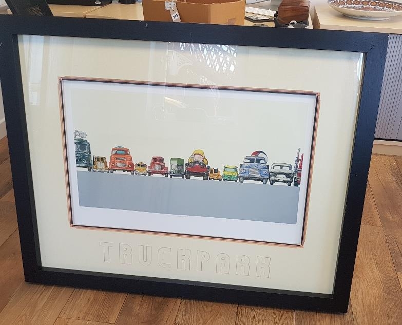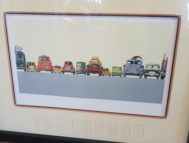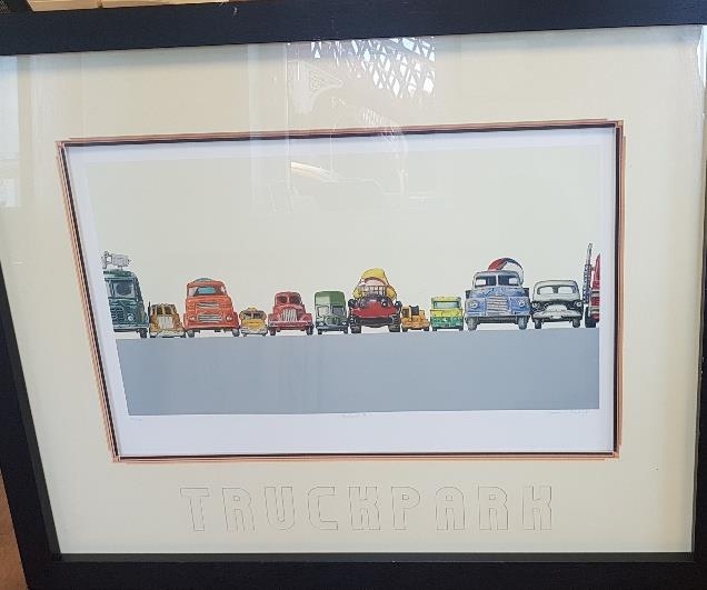 Large Framed Jeremy Dickinson Limited Edition Truckpark 2 Print, signed and numbered. Measures 46 inches x 36 inches (not suitable for postage)