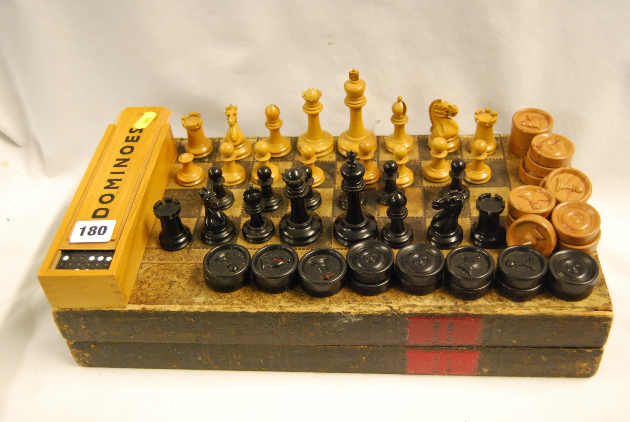 CARVED WOOD CHESS SET (2 PAWNS MISSING, 1 A/F), SET OF DRAUGHTS & DOMINOES WITH CHESS BOARD BOX