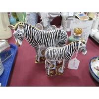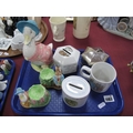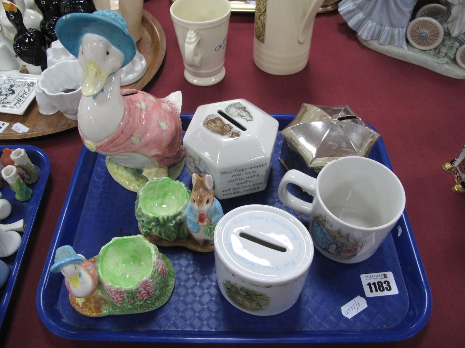 Beatrix Potter - 1998 Enesco Jemima Puddleduck, Enesco egg cups, Wedgwood octagonal money box, Wedgwood oval money box (no stoppers) mug etc (damages): One Tray.