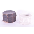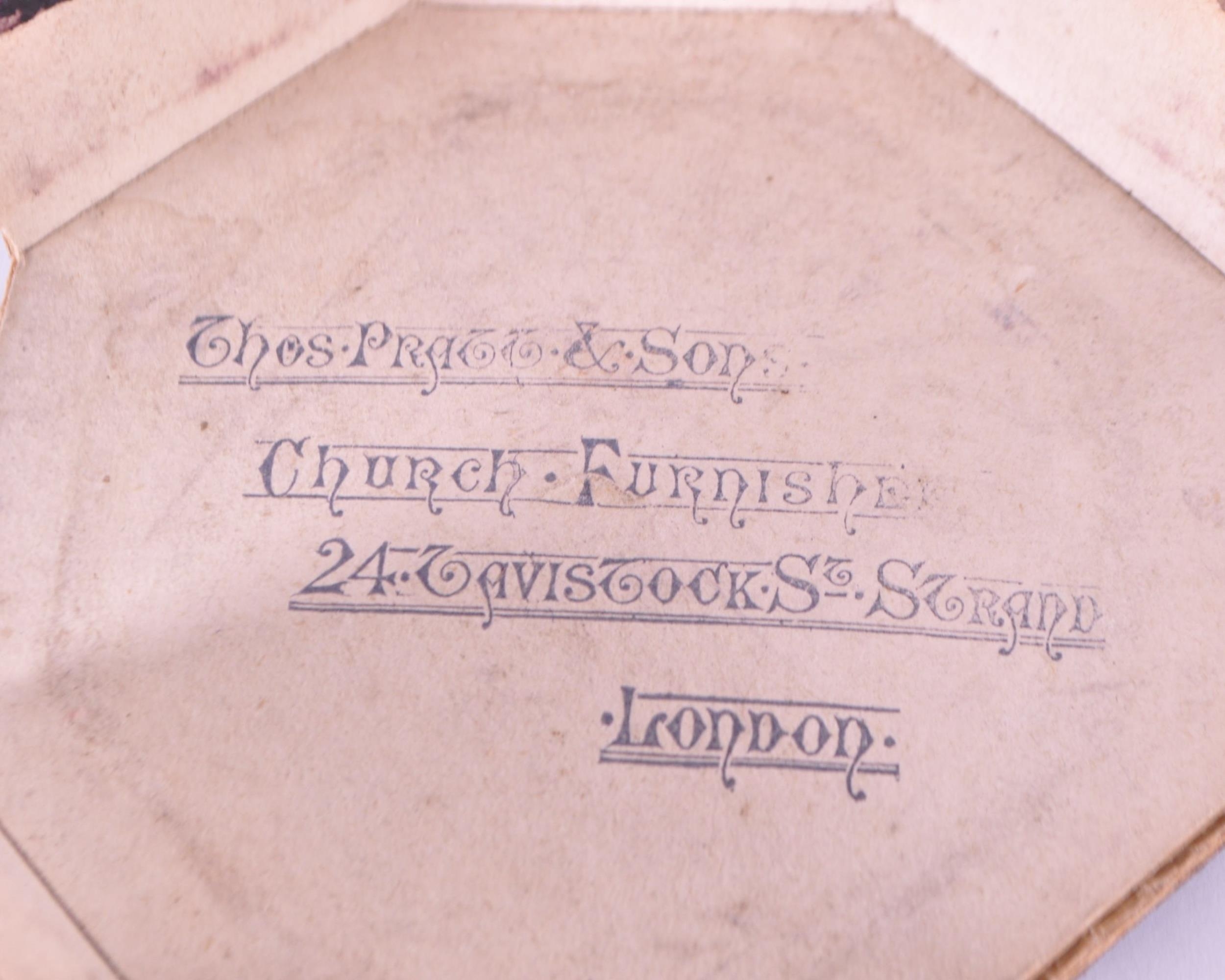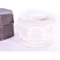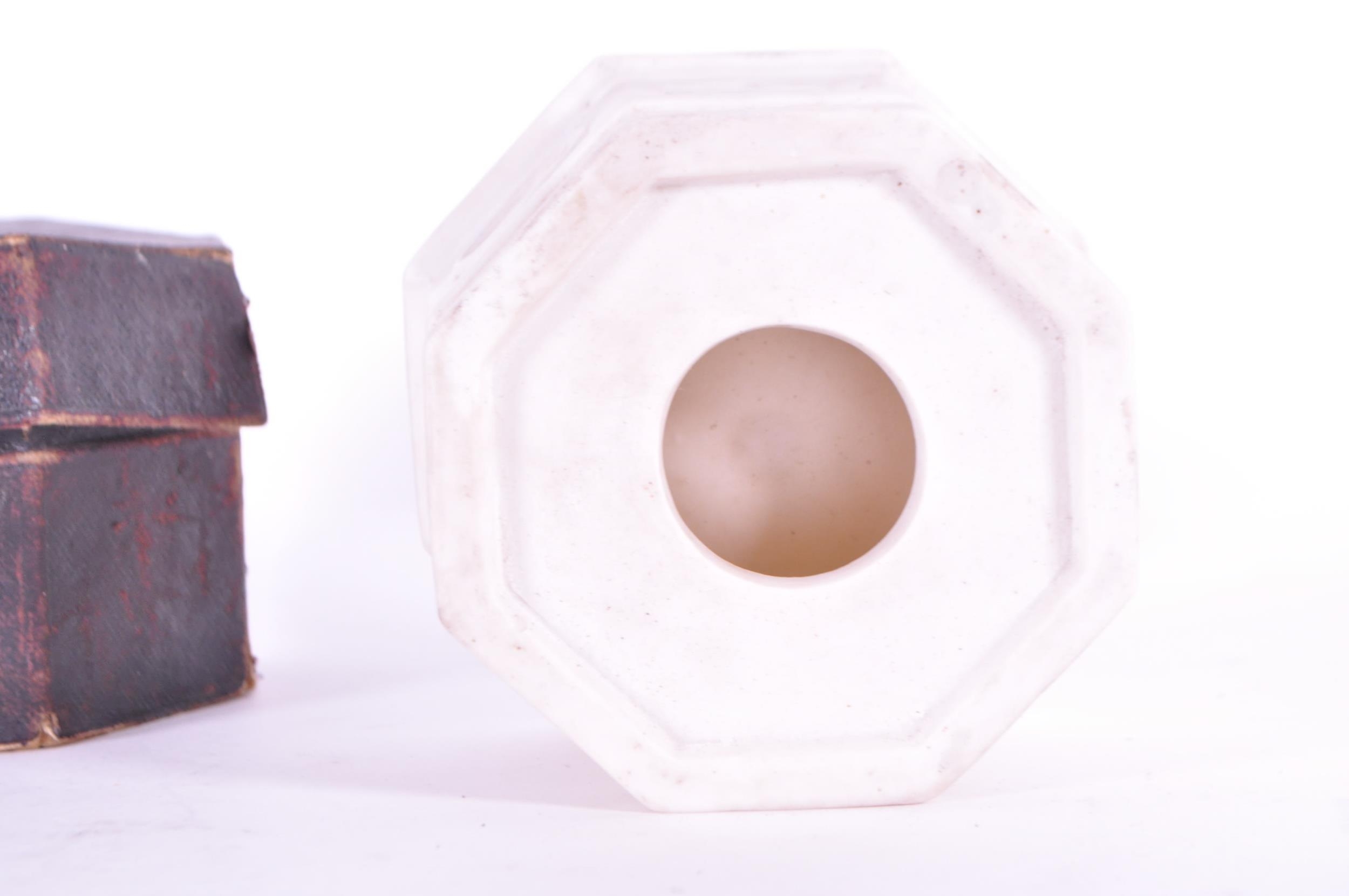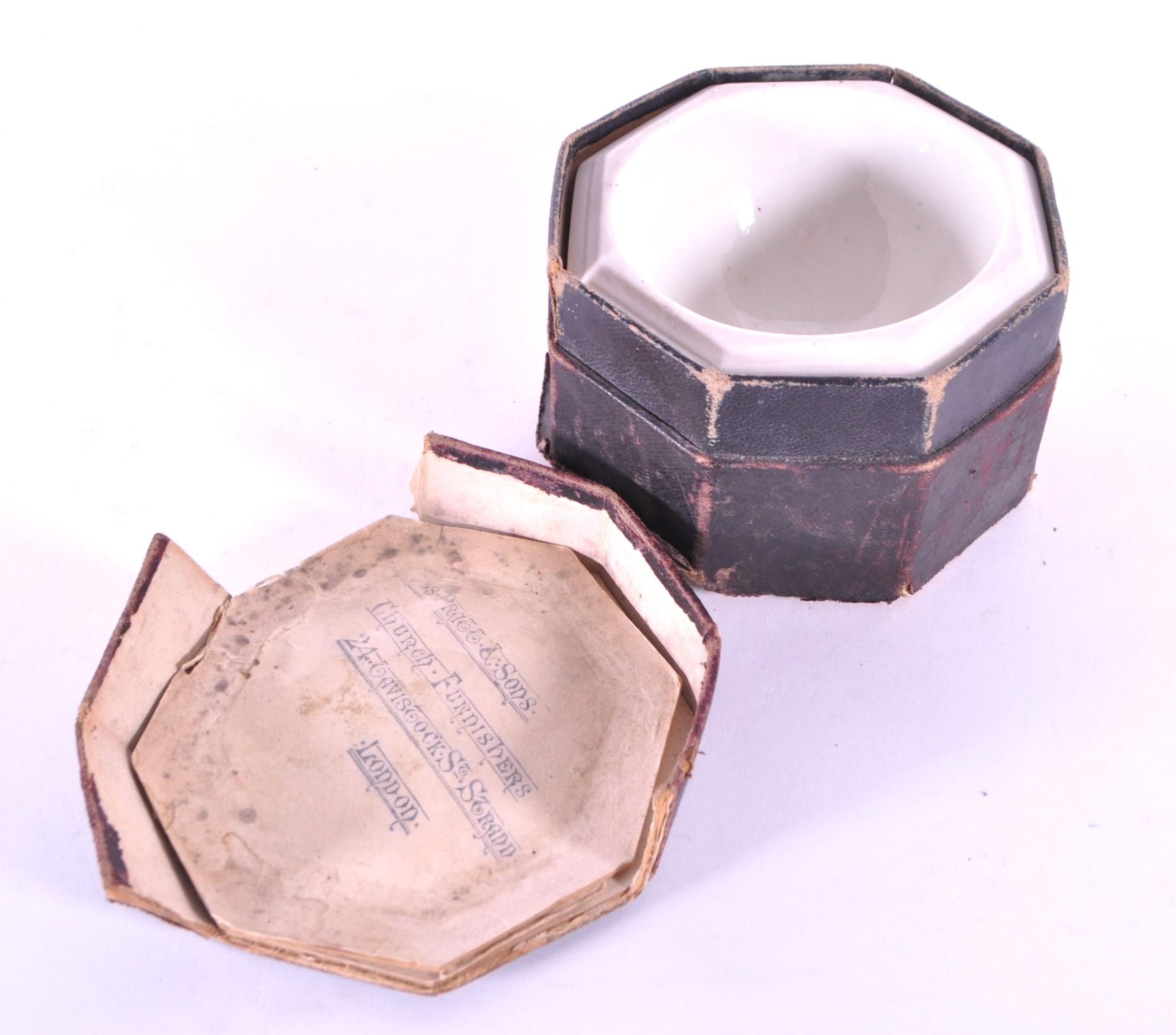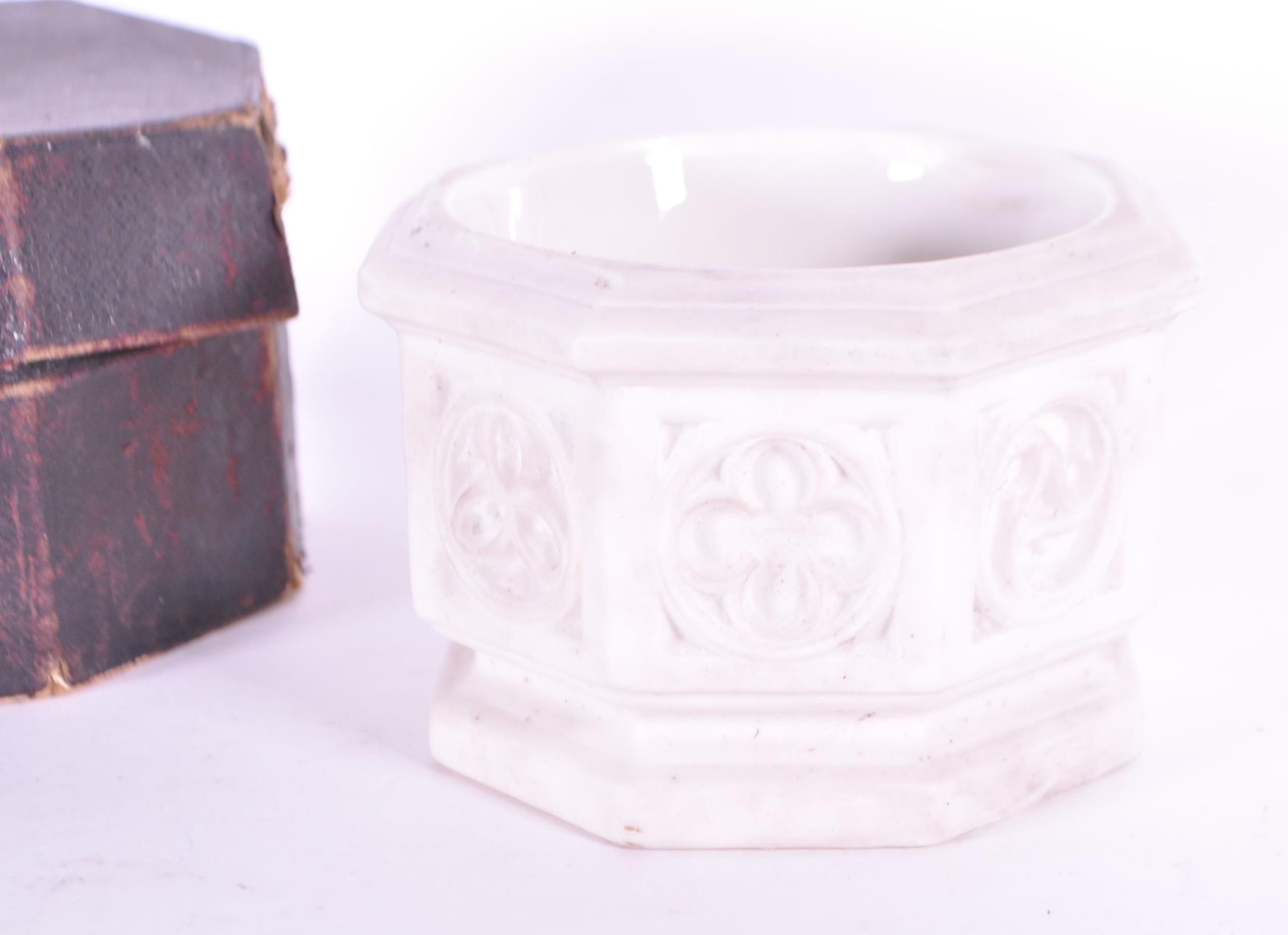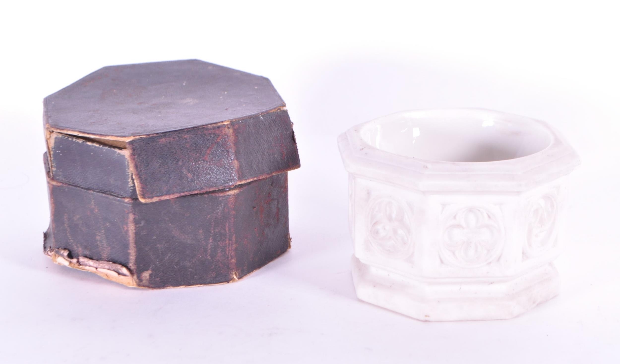 Thomas Pratt & Sons - Late 19th century Parian gothic traveling font housed within the original box. From Church Furnishers, 24 Tavistock St Strand, London. Measuring approx. 8cm x 11.5cm.