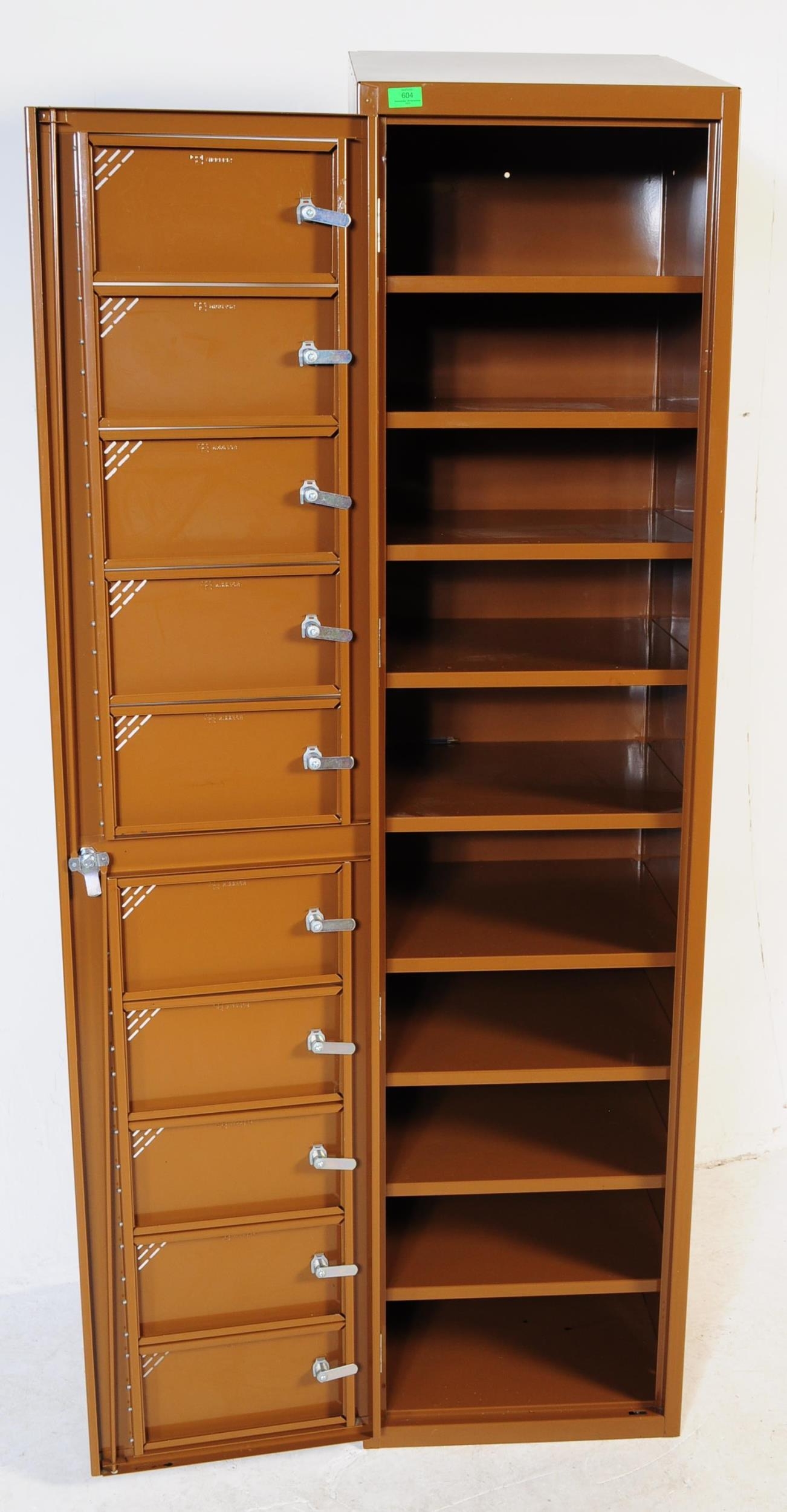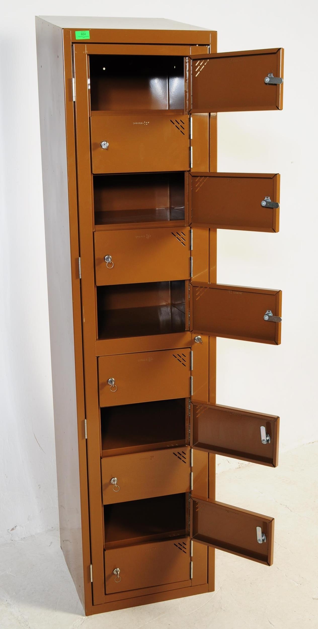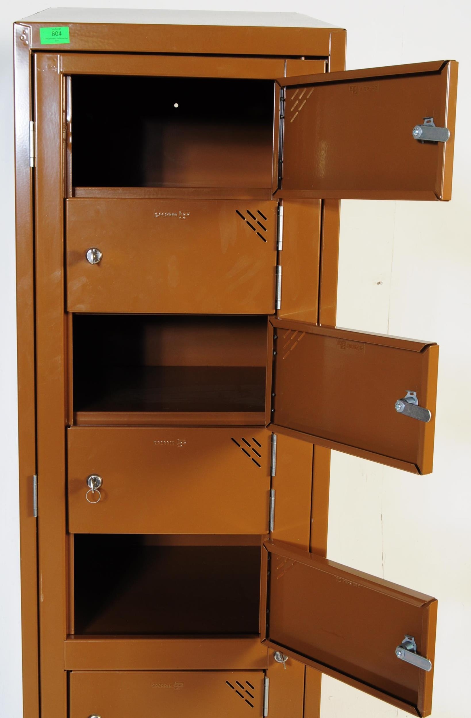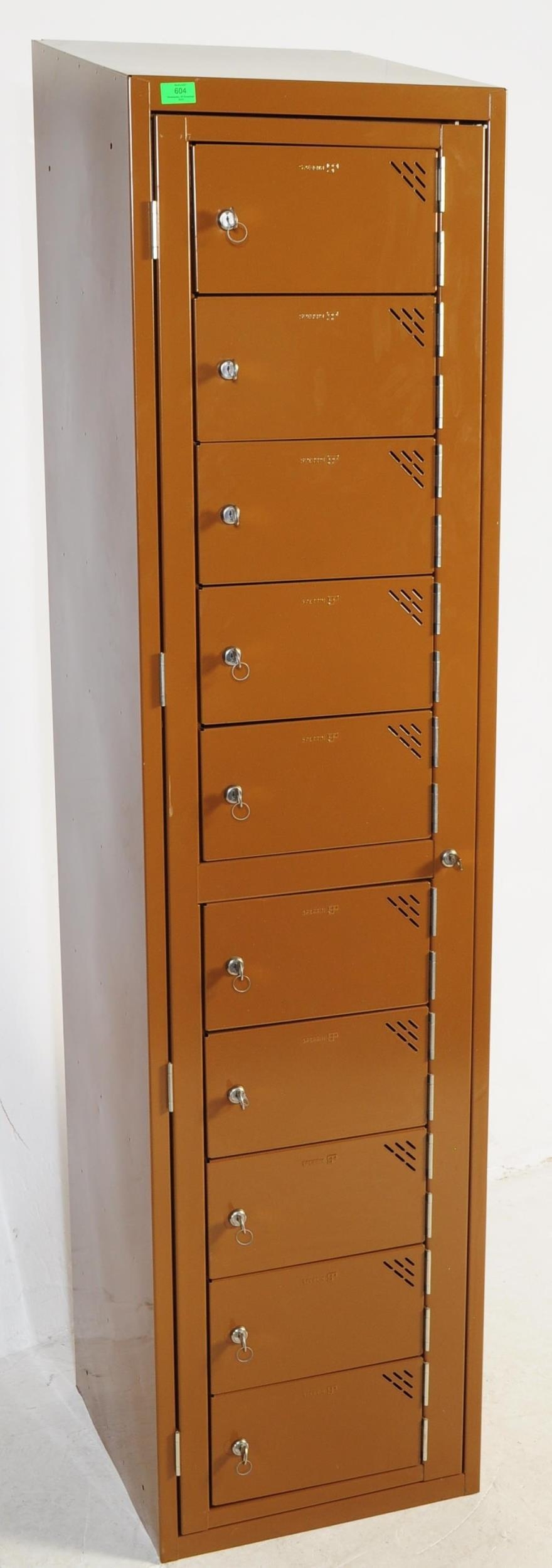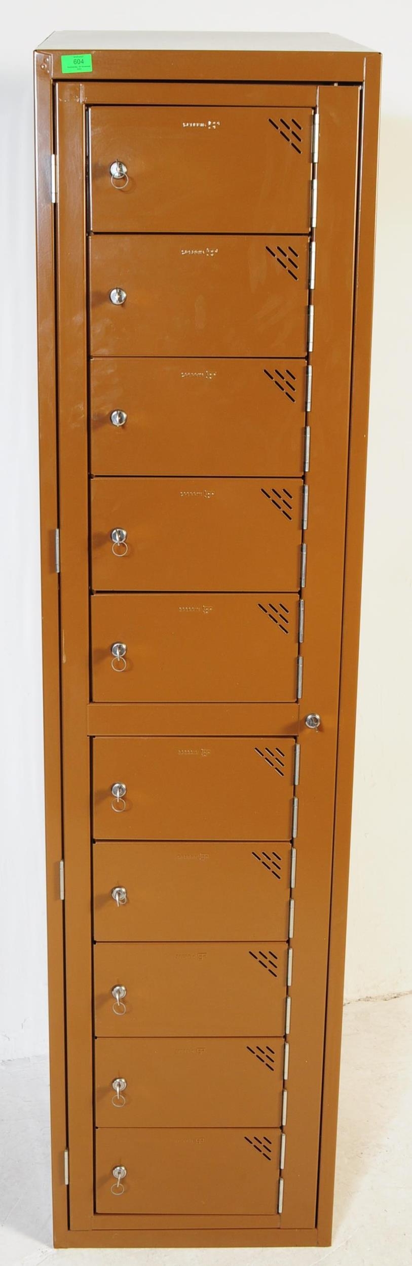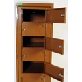 A contemporary Sperrin SP upright metal pedestal locker cabinet. Industrial form with brown enamel painted finish to the metal body. Each door with key. Brown colourway