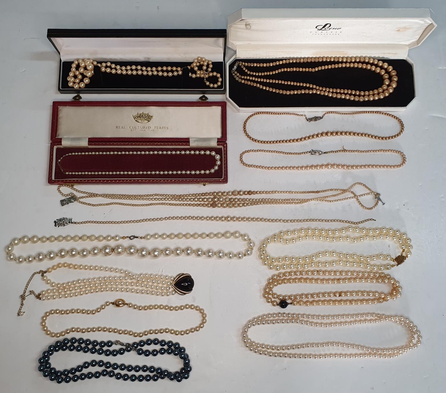 Large quantity of ladies vintage pearl necklaces' including a cased example with a 9ct gold clasp and others with silver clasps (Qty)