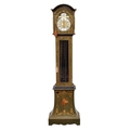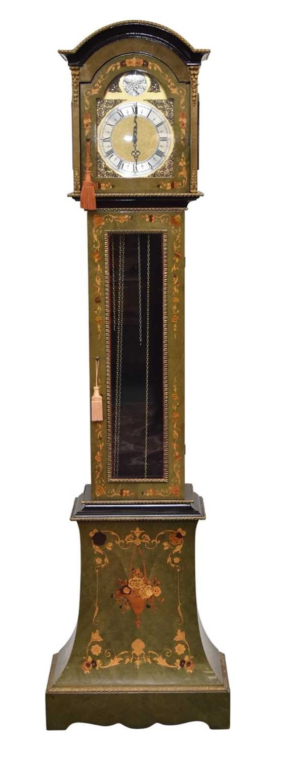 A Franz Hermle stained walnut and marquetry longcase clock The Regency style case stained pale green with gilt-metal mounts and inlaid with marquetry flowers and foliage, the 9.75 inch arched brass dial with silvered Roman chapter and moulded spandrels, the weight-driven movement musical quarter striking on eight rods. With three polished weights and pendulum. 55cm wide x 26cm deep x 204cm high