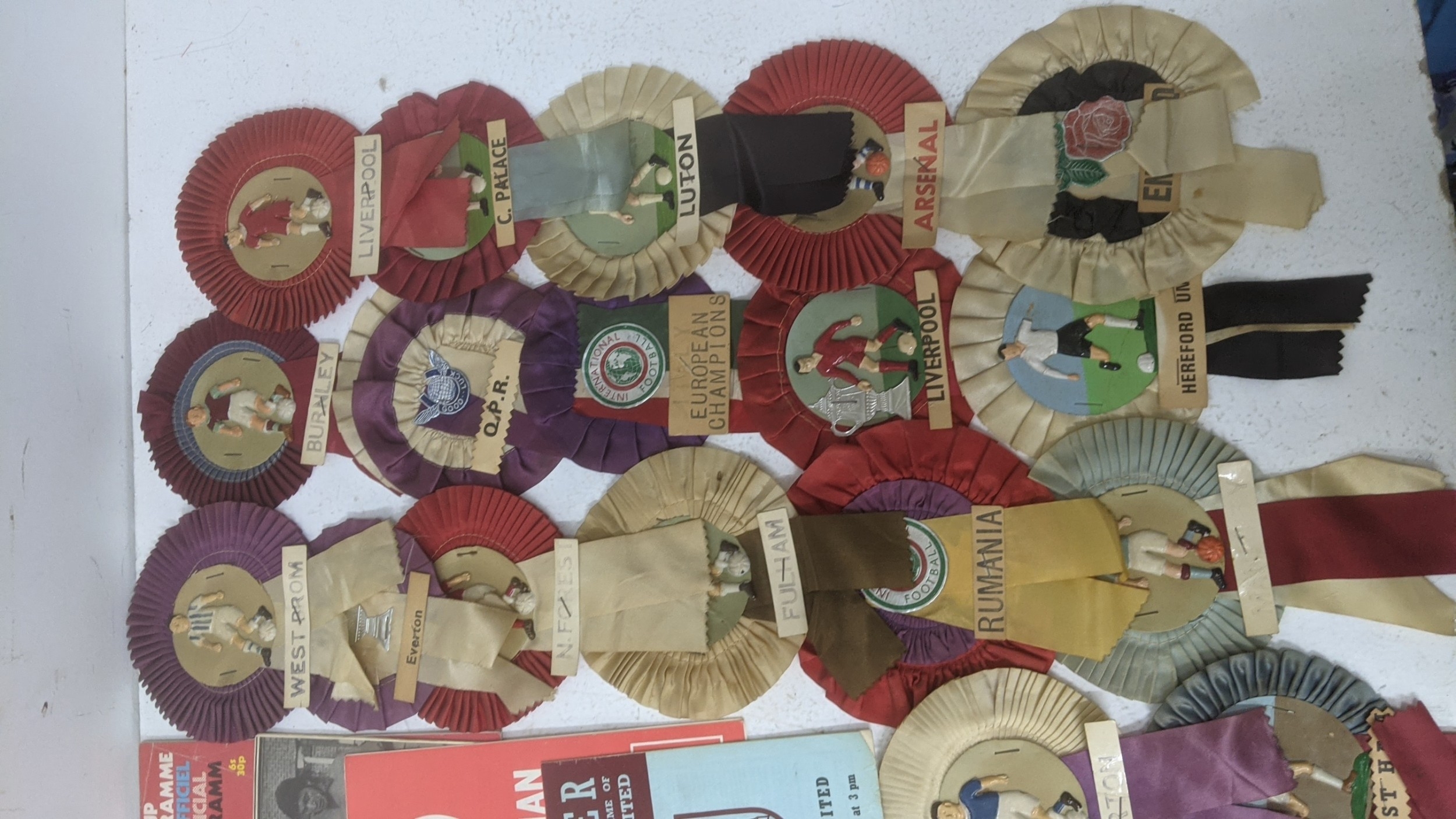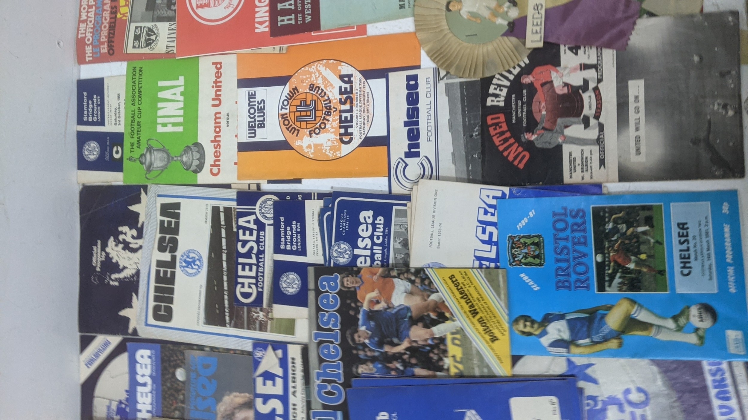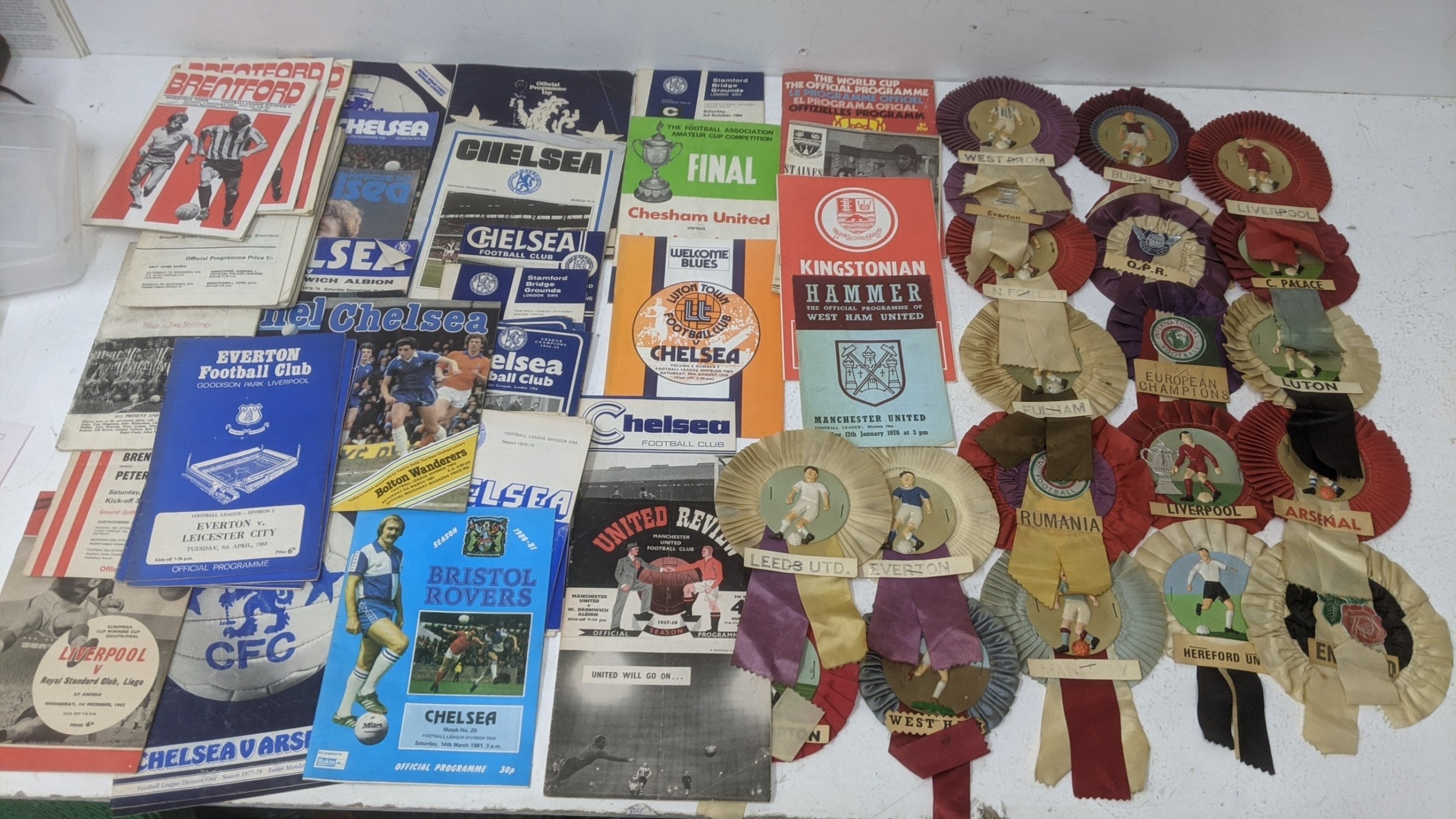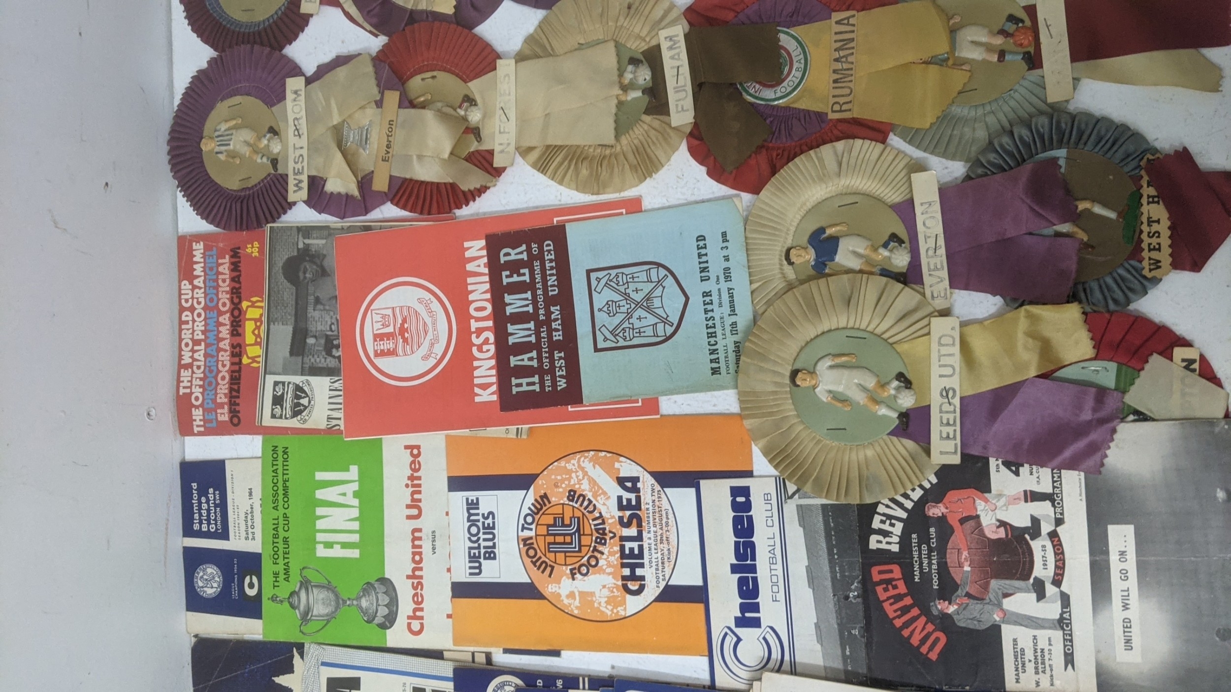 1950s and later football programmes to include Manchester United 5 March 1958, Chelsea, West Ham, Luton Town v Chelsea, Chesham v Leytonstone 1968, Kingstonian, World Cup Mexico 1970, and 1960s rosettes Location:GR