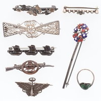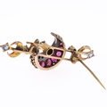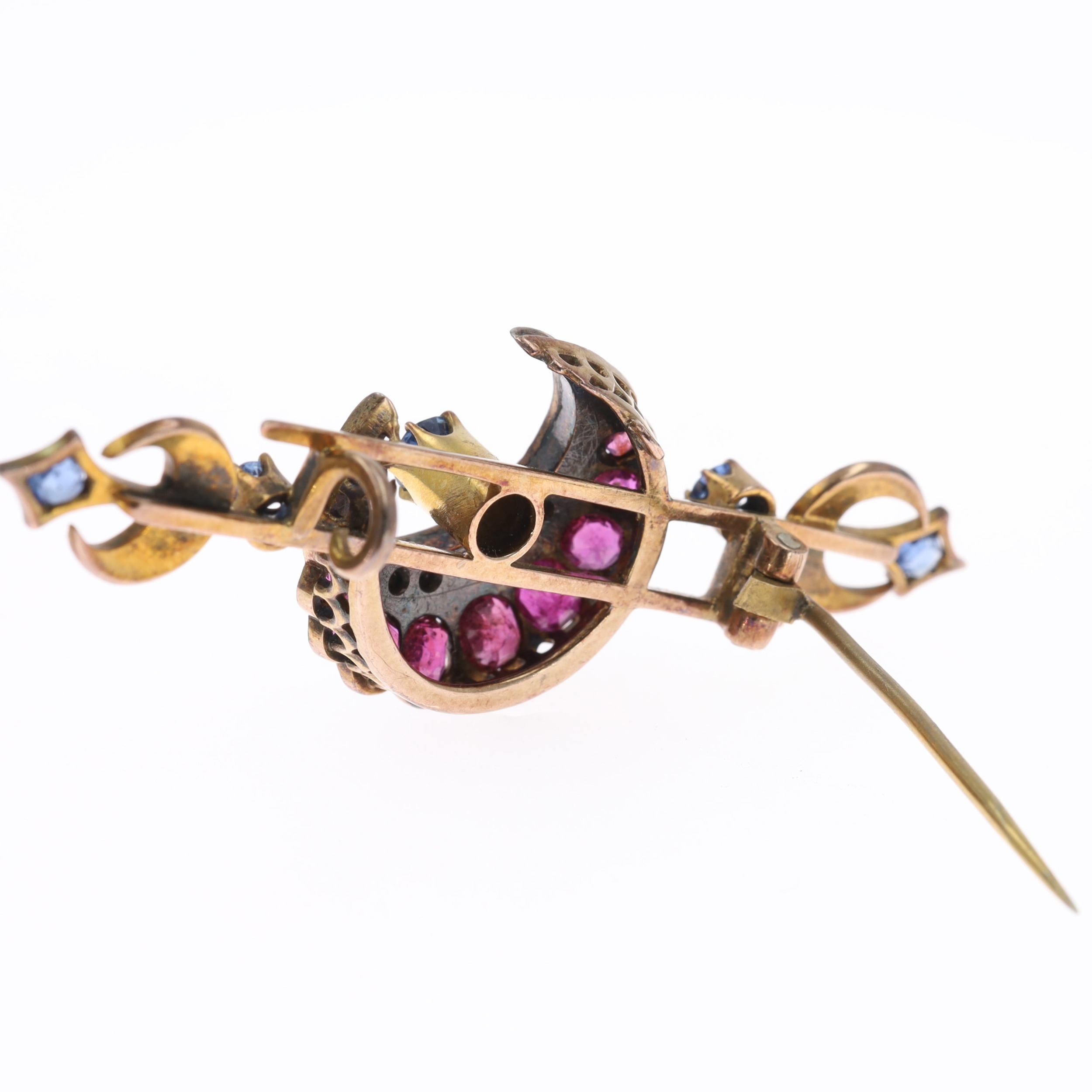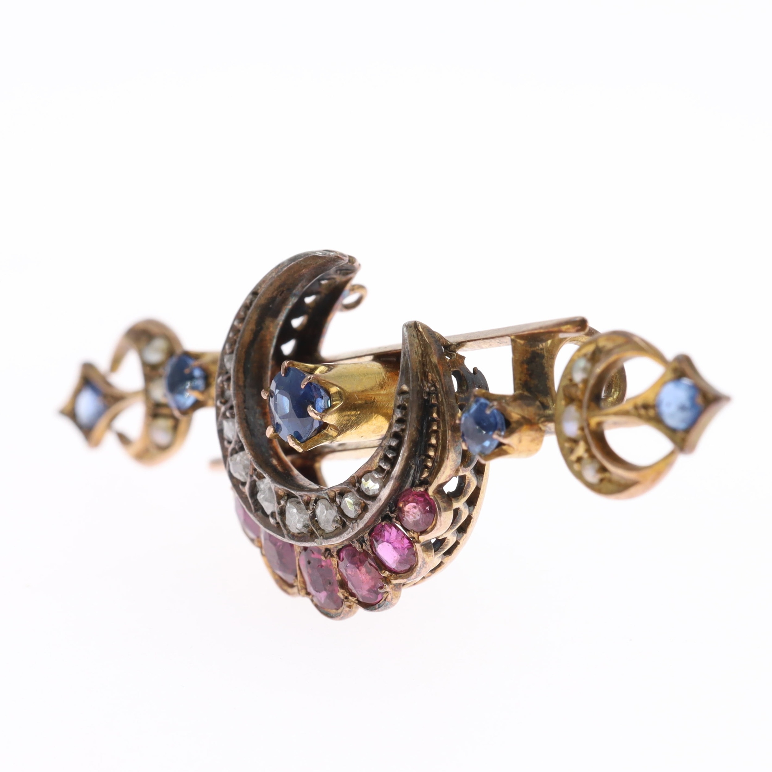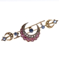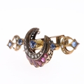Victorian Diamond, Sapphire and Ruby Gold Crescent Moon Brooch