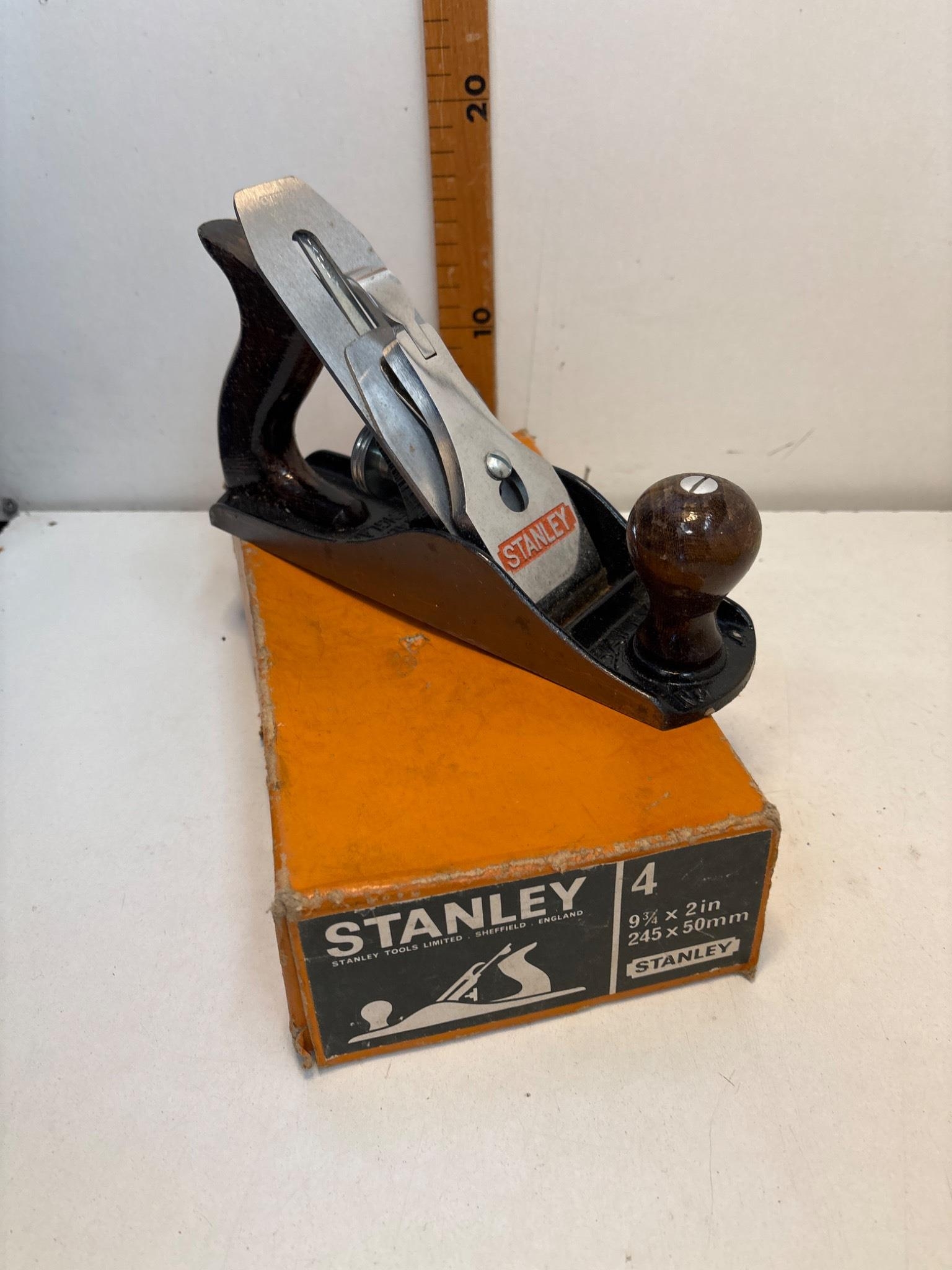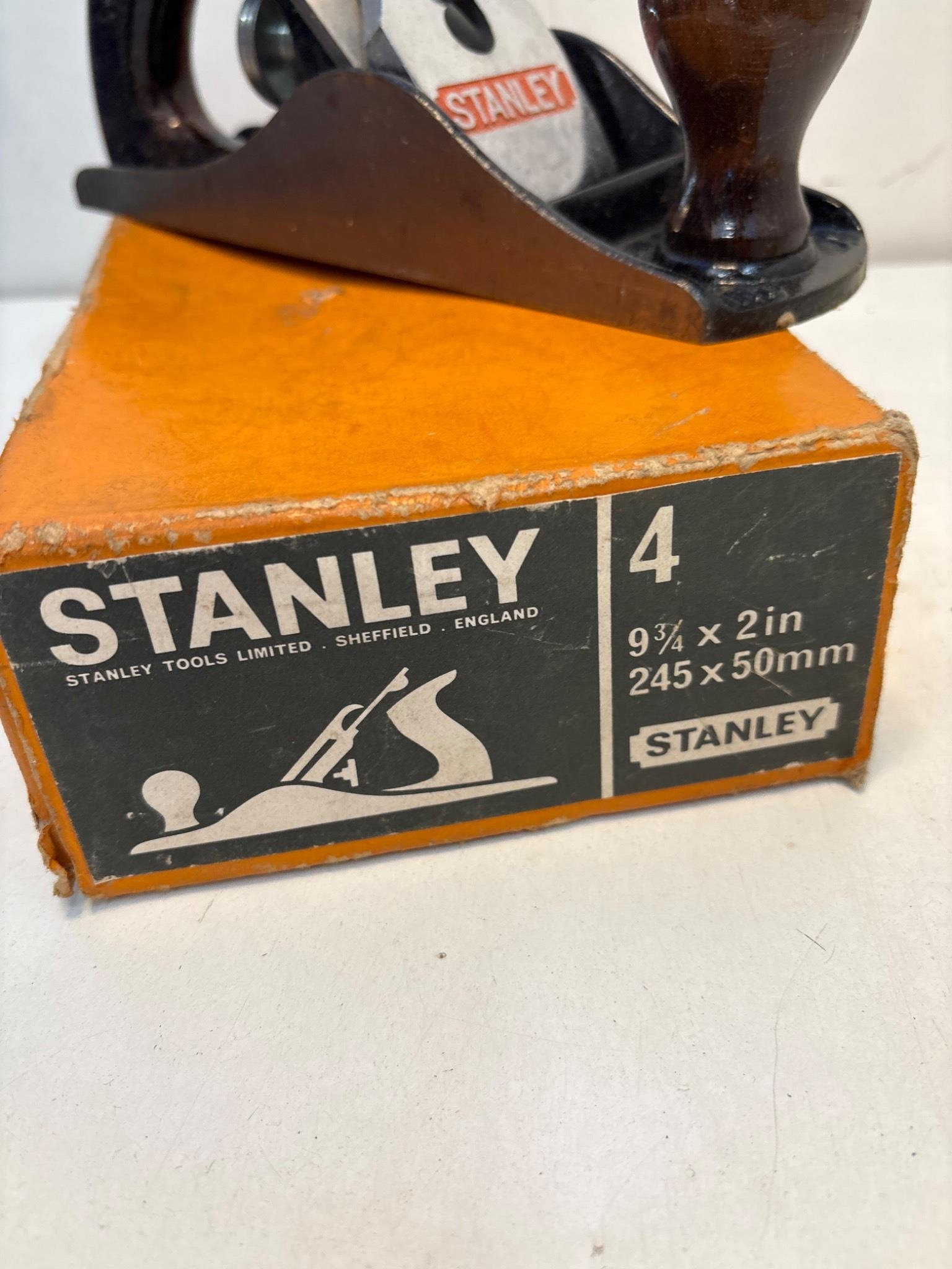 Stanley No. 4 hand plane with original box, 9.5 x 2 inches.