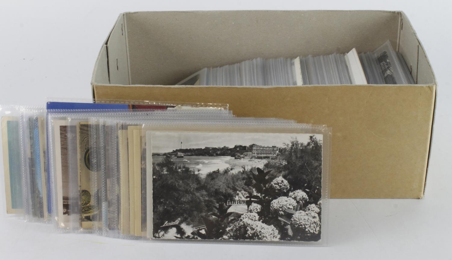 Shoebox of mixed old Foreign postcards in sleeves (100's)