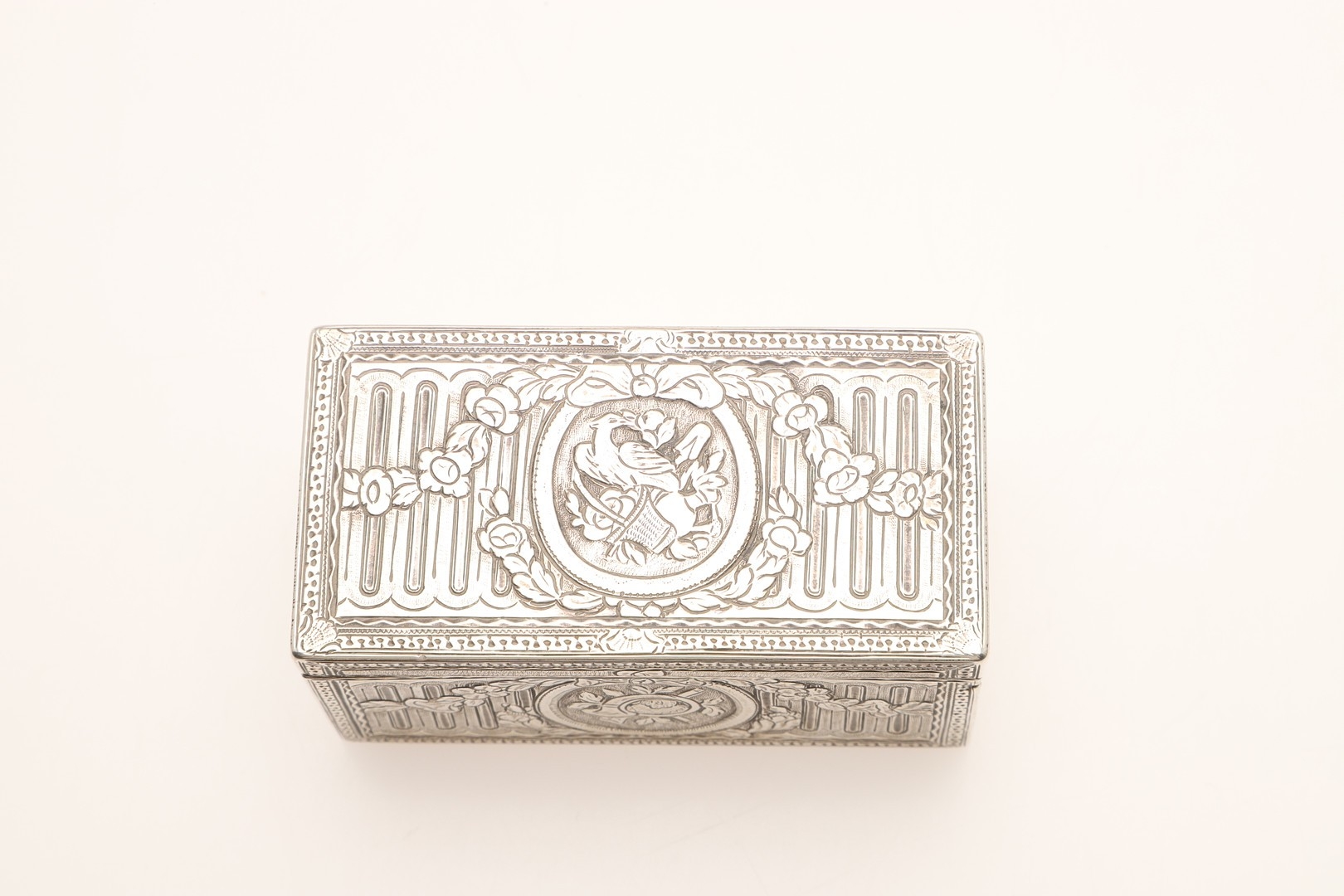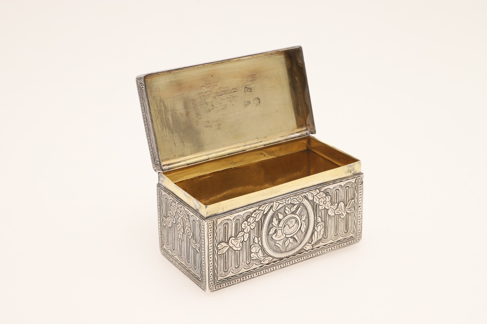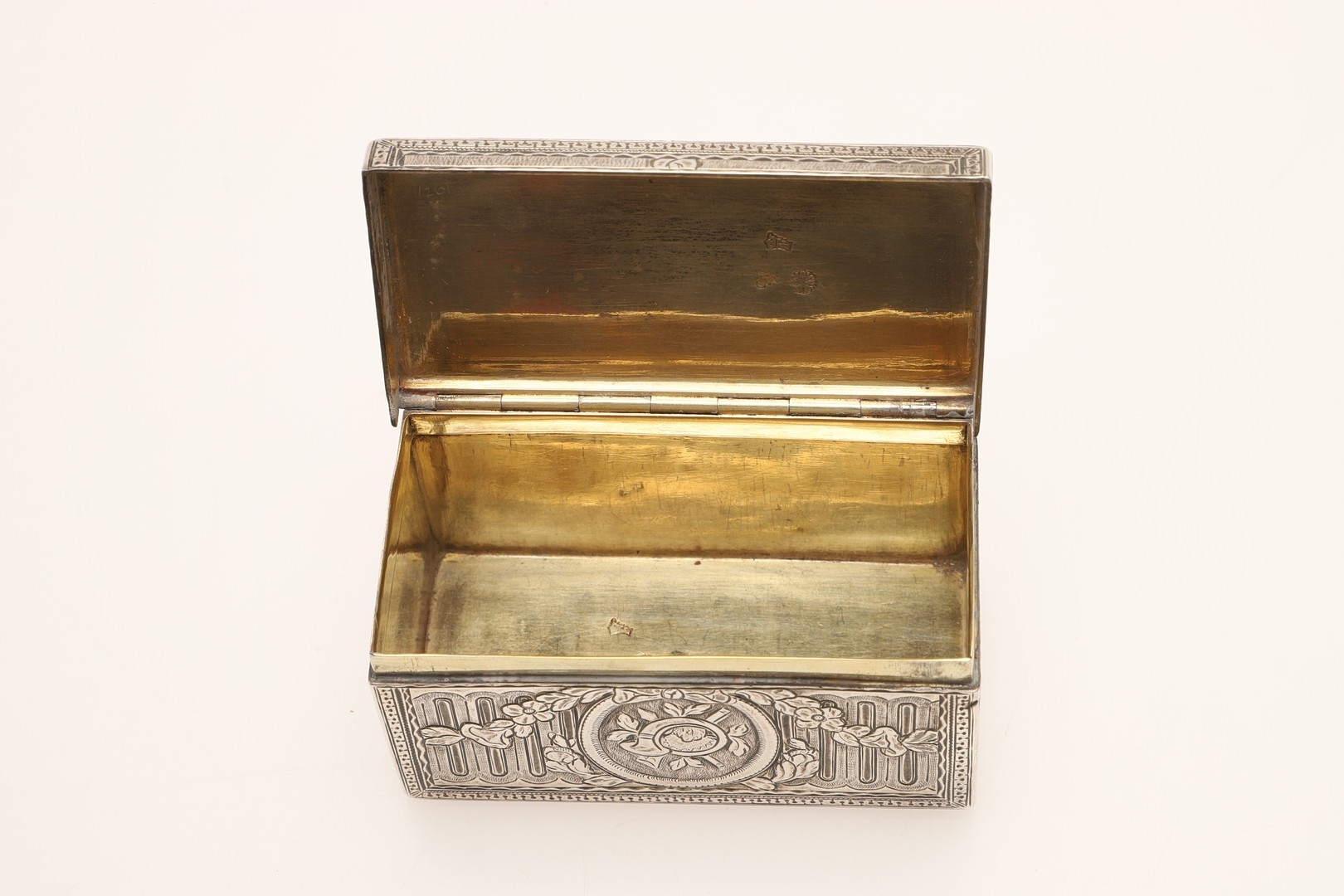 A FRENCH SILVER SNUFF BOX. Rectangular form, with floral and bird medallions between garlands of flowers on a fluted background. Gilded interior, Hallmarked probably Paris, 1769. Height 4cm x Width 8cm x Depth 4cm. Weight 3.6ozt.