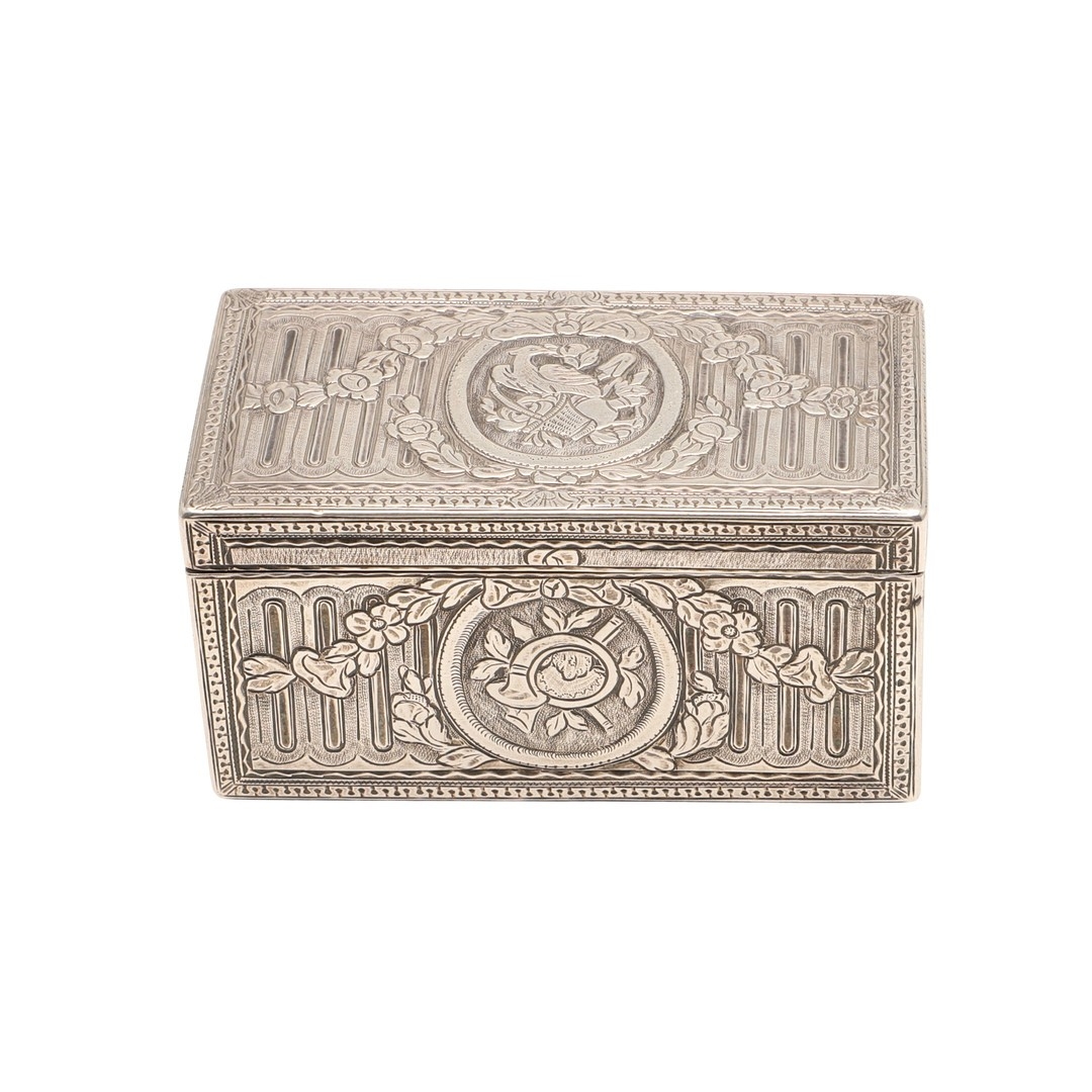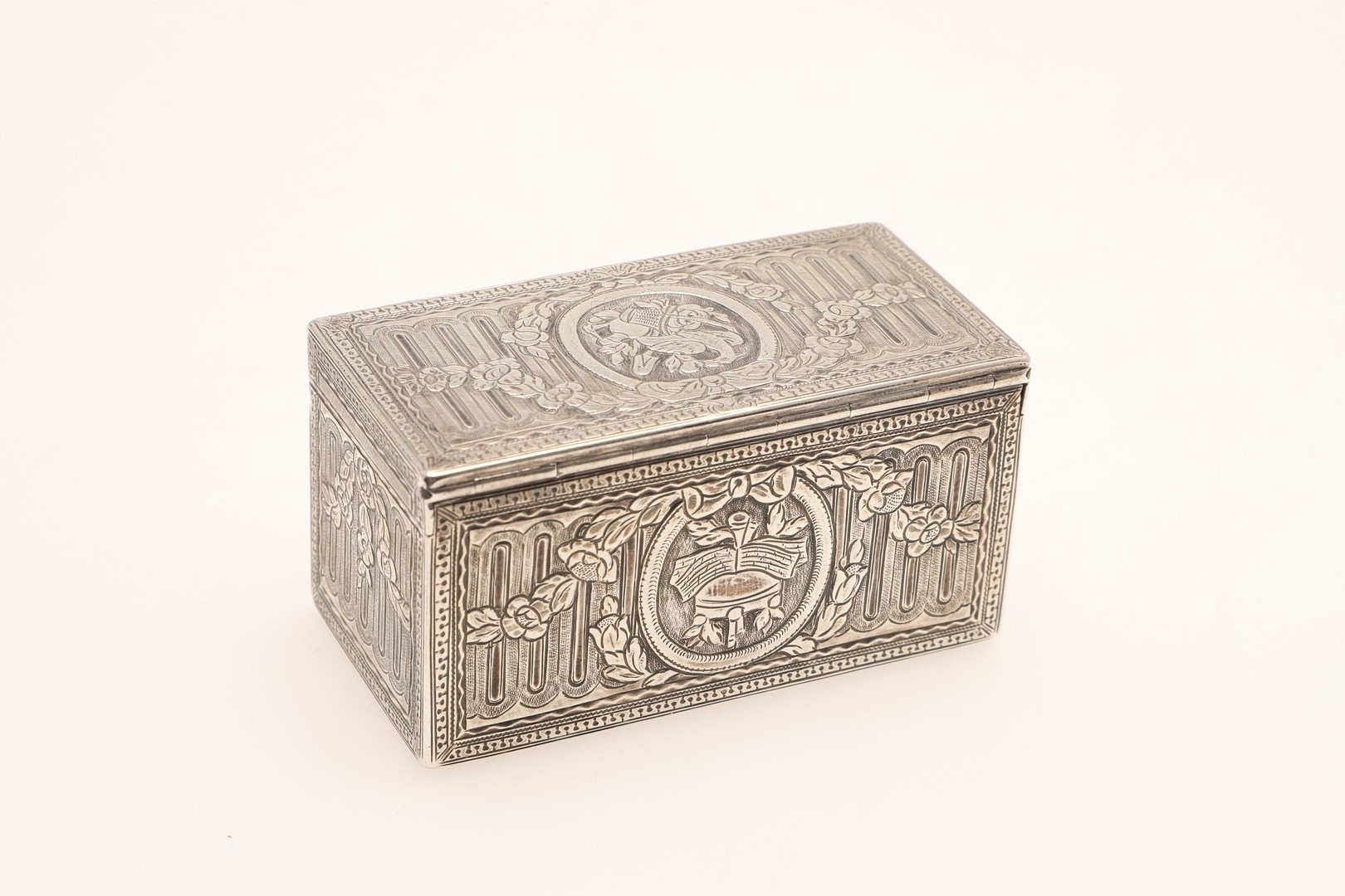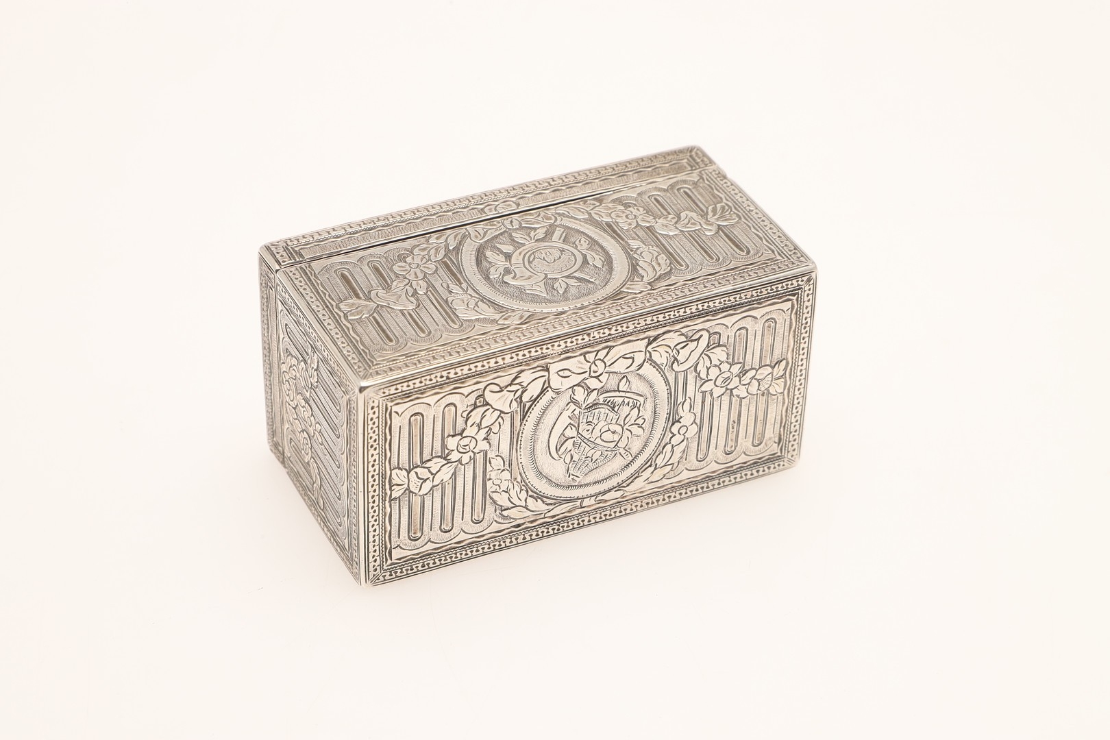 A FRENCH SILVER SNUFF BOX. Rectangular form, with floral and bird medallions between garlands of flowers on a fluted background. Gilded interior, Hallmarked probably Paris, 1769. Height 4cm x Width 8cm x Depth 4cm. Weight 3.6ozt.