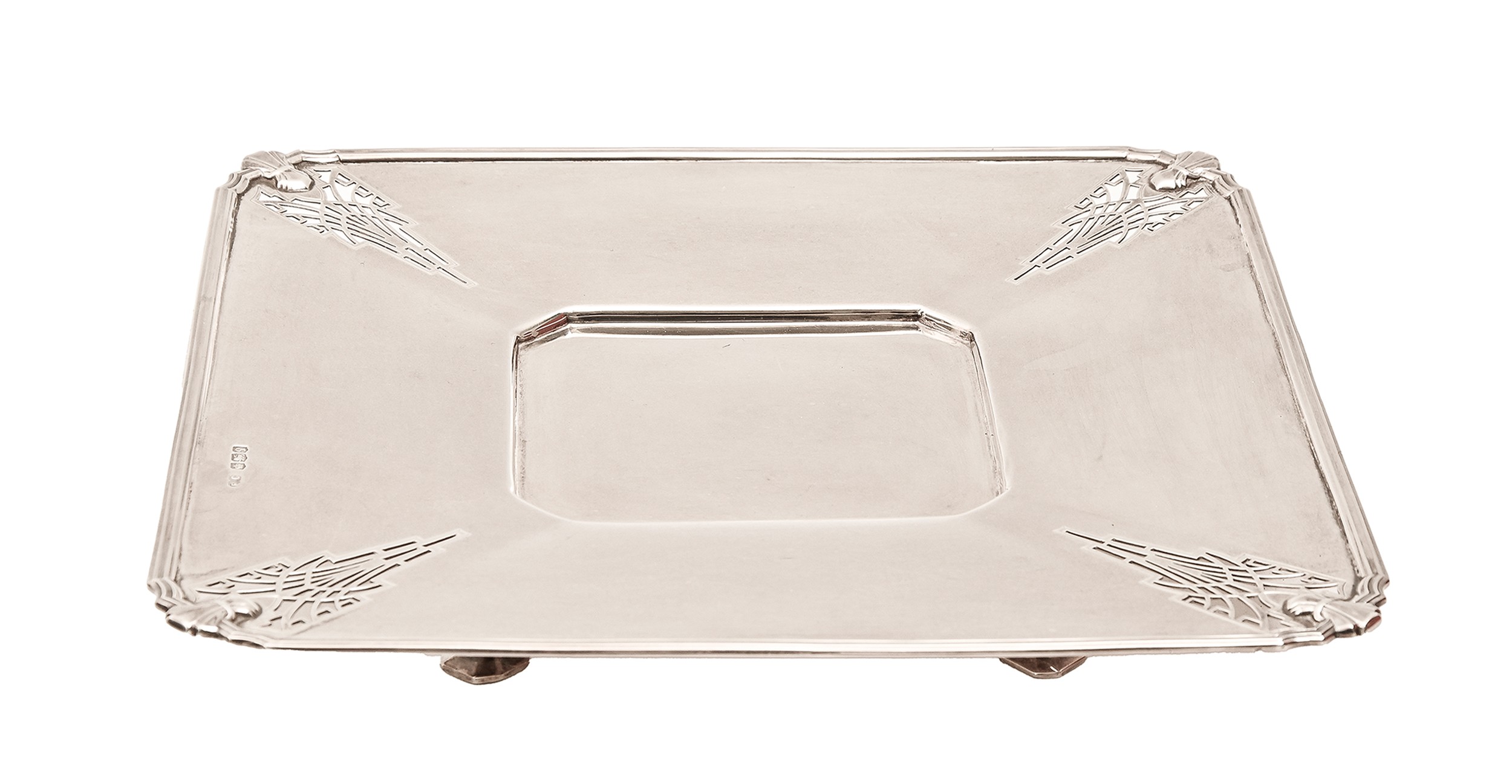 A George V art deco silver cake stand, on four feet, 24 x 24cm, by Frank Cobb & Co Ltd, Sheffield 1933 and marked RD 767397, 20oz 8dwt