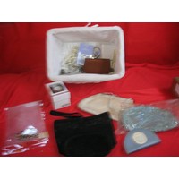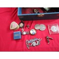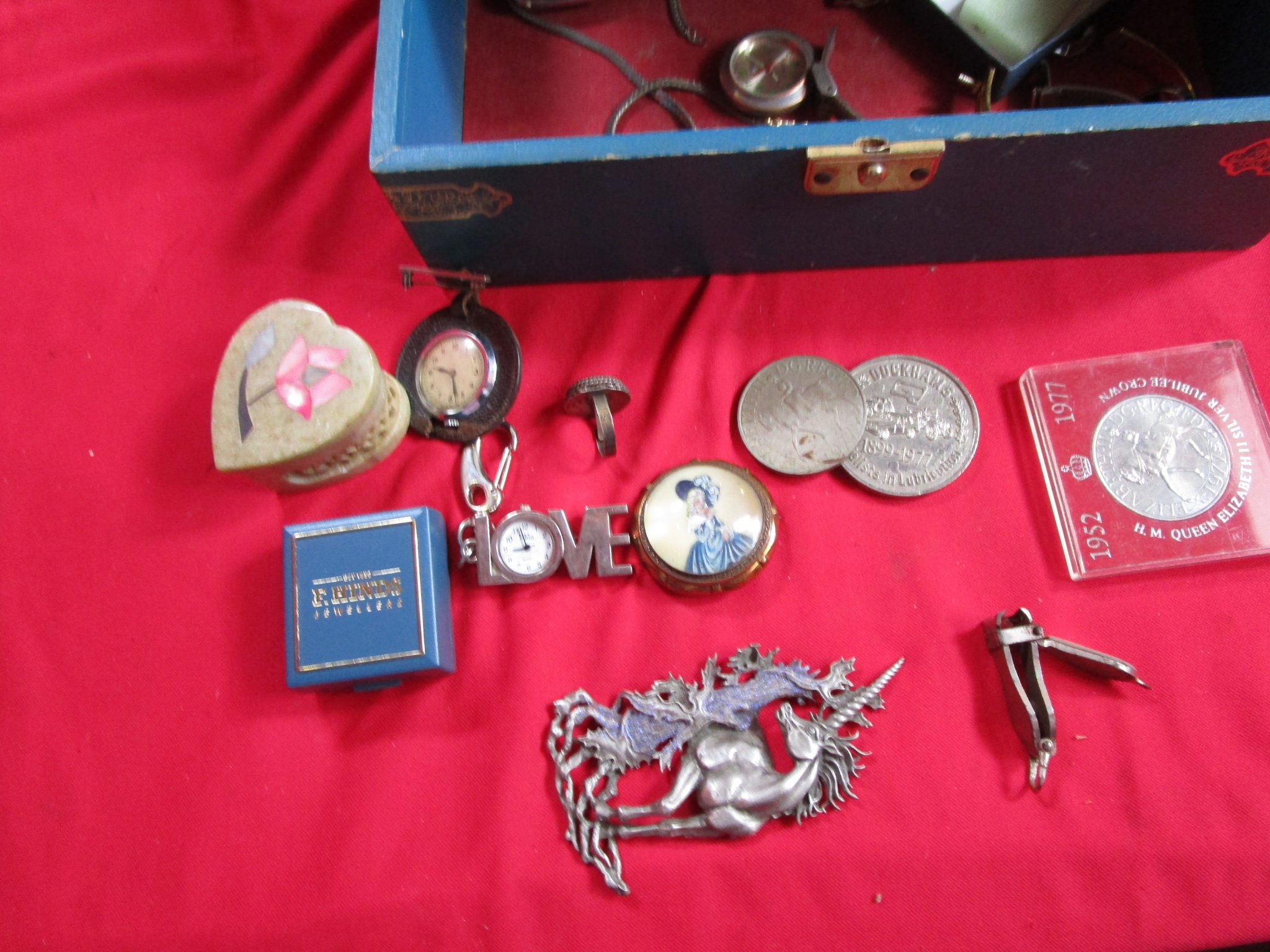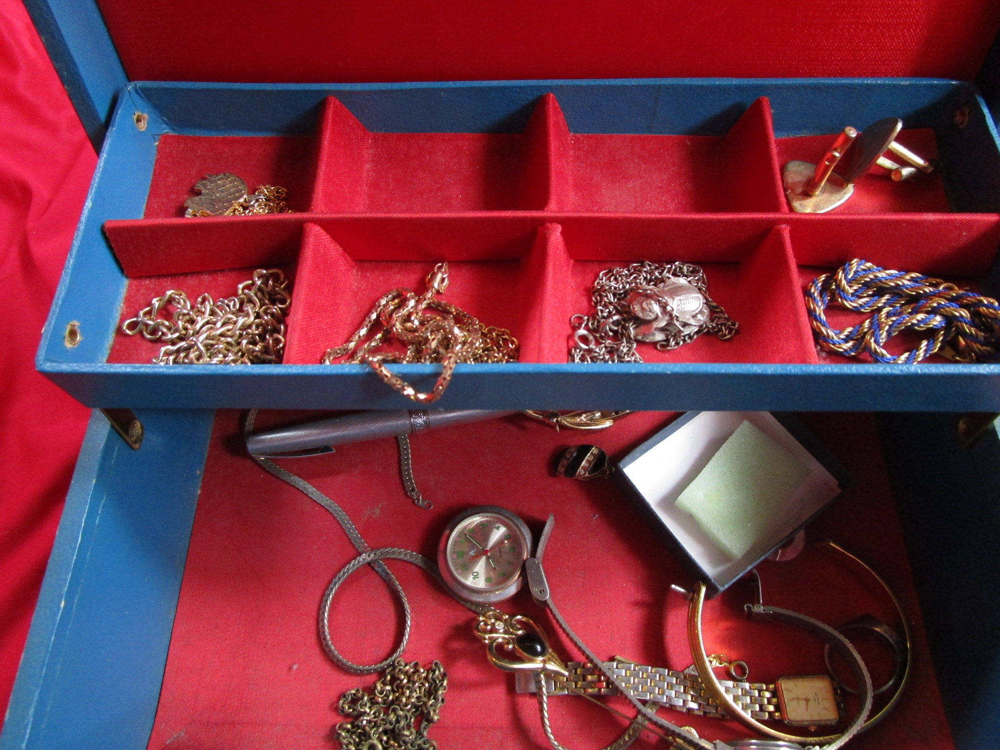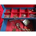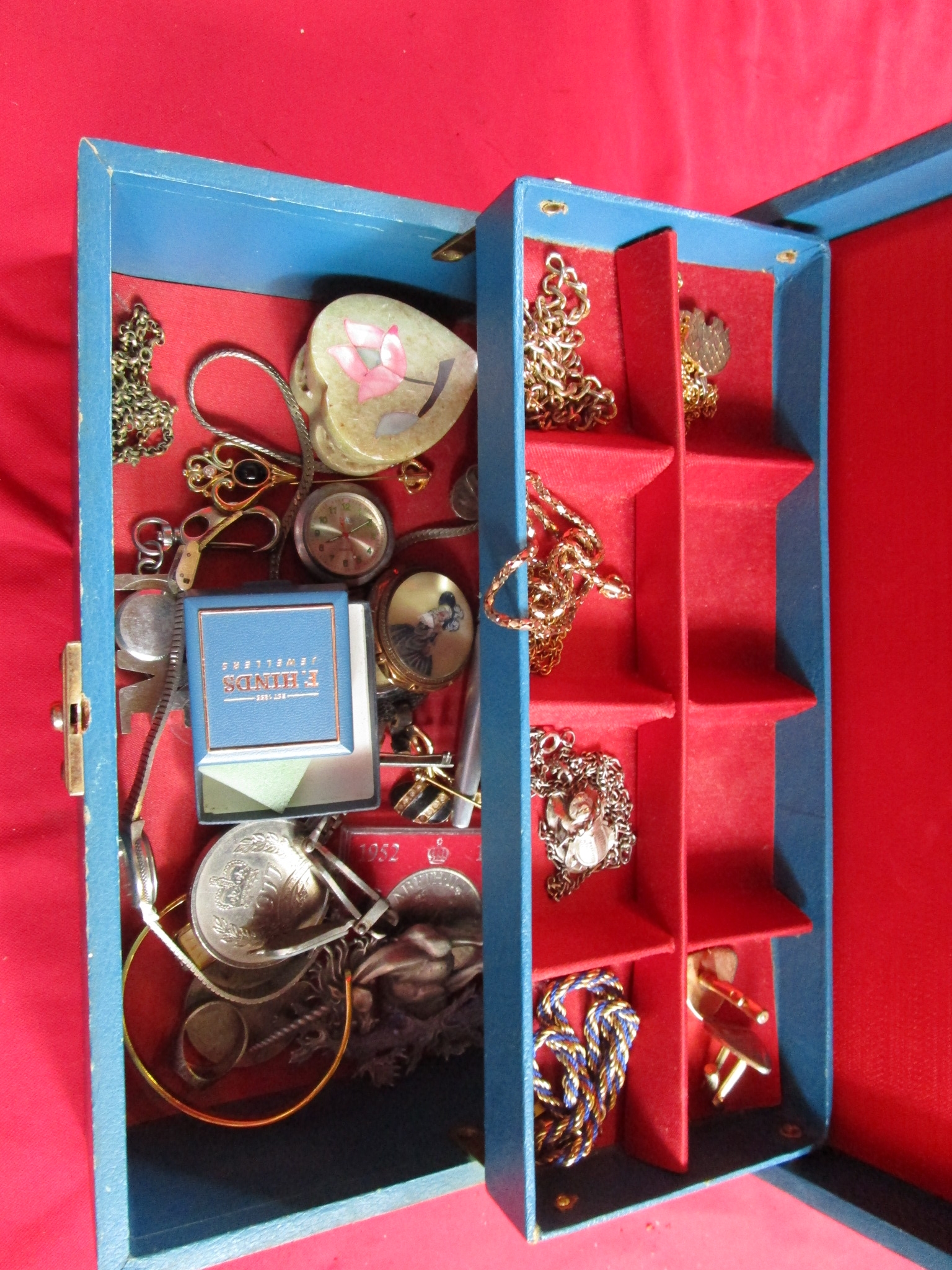 A Jewellery box of costume jewellery including a silver ring with the stone removed and a couple of silver jubilee crowns .
