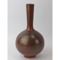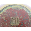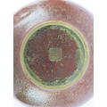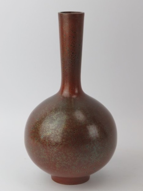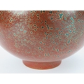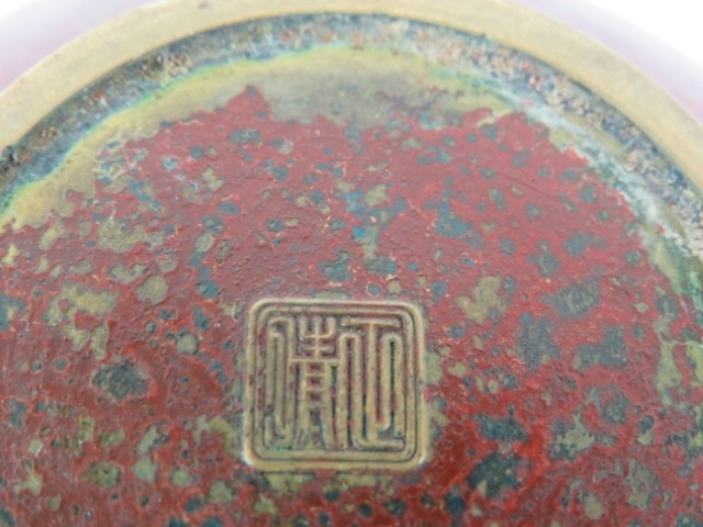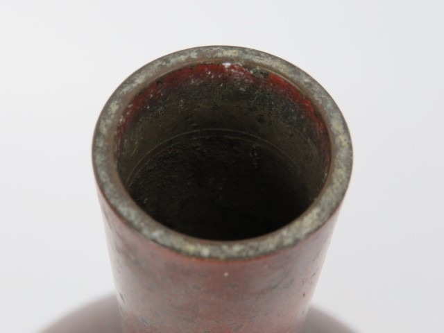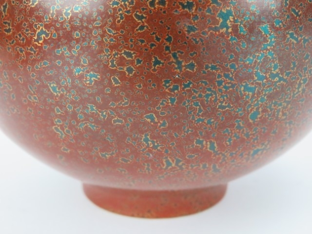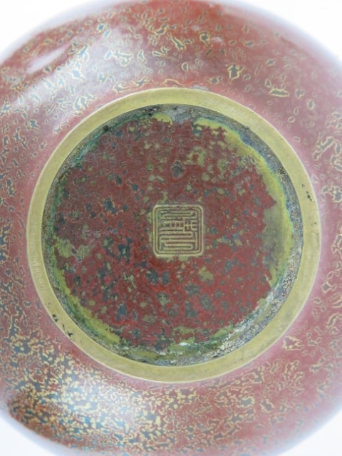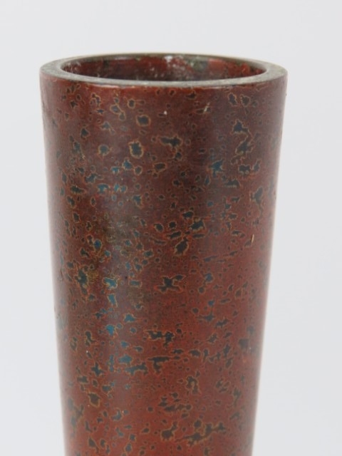 A rare Japanese gilt splashed bronze vase, probably Meiji period. Zhuanshu style script mark beneath as illustrated. Unusual fired lacquer technique to the surface. 21.3 cm height.