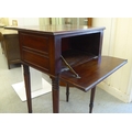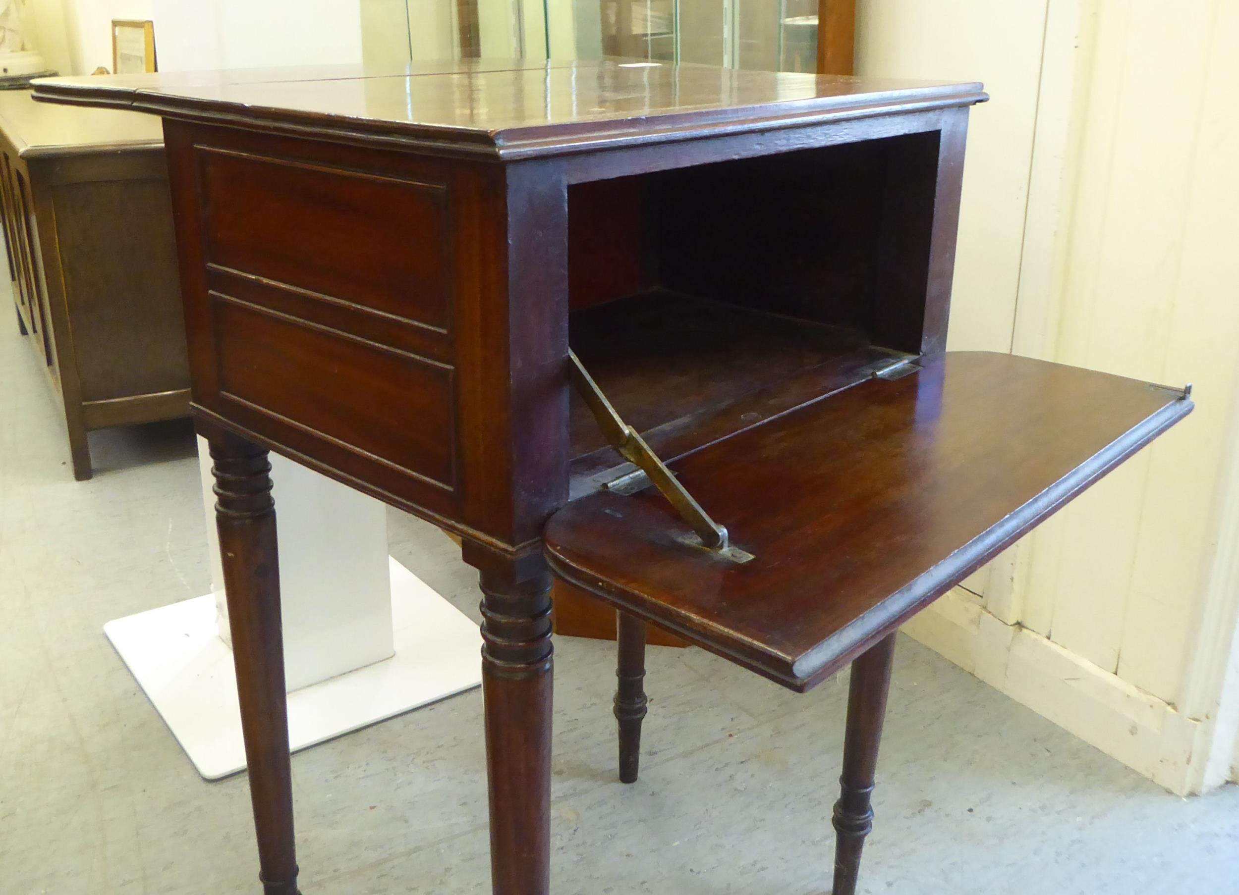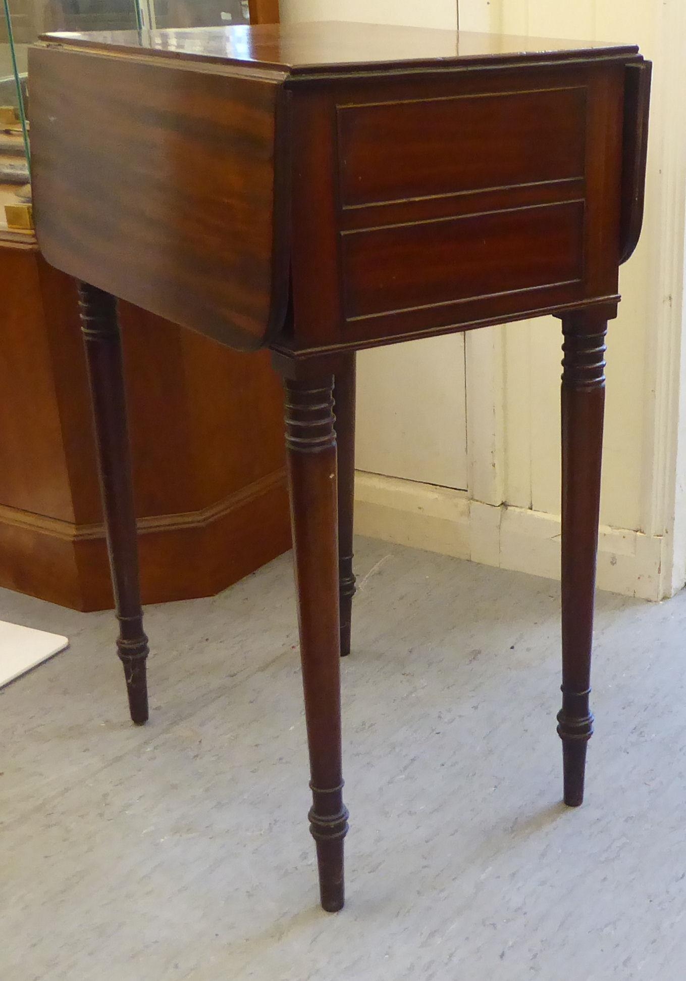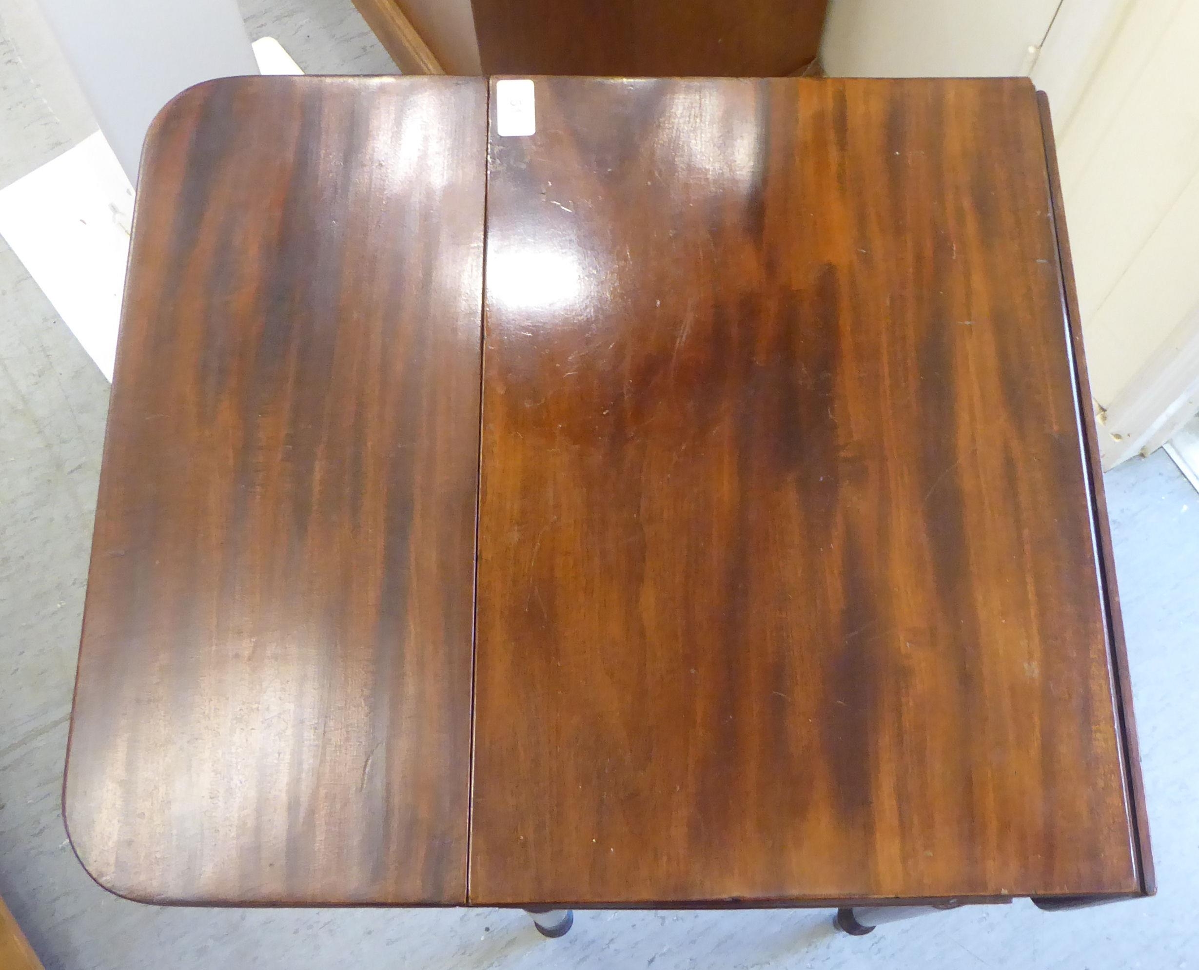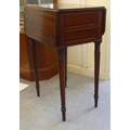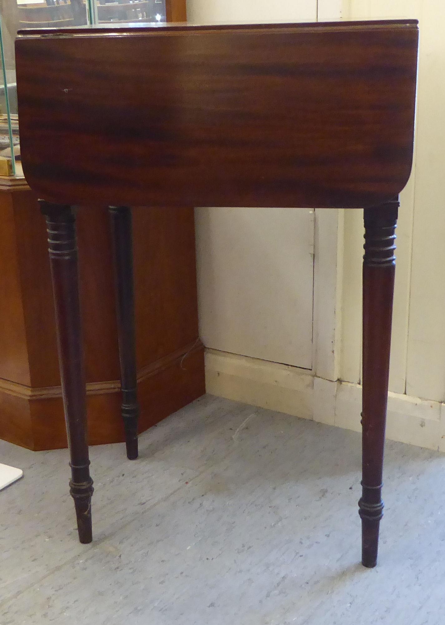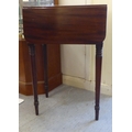 A mid Victorian mahogany Pembroke table with a hinged flap and a fall flap on the obverse, raised on ring turned kegs 29"h 19"w