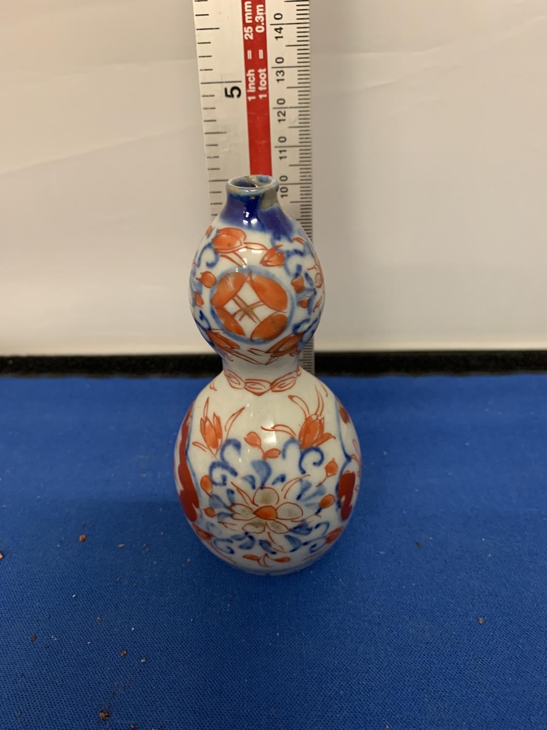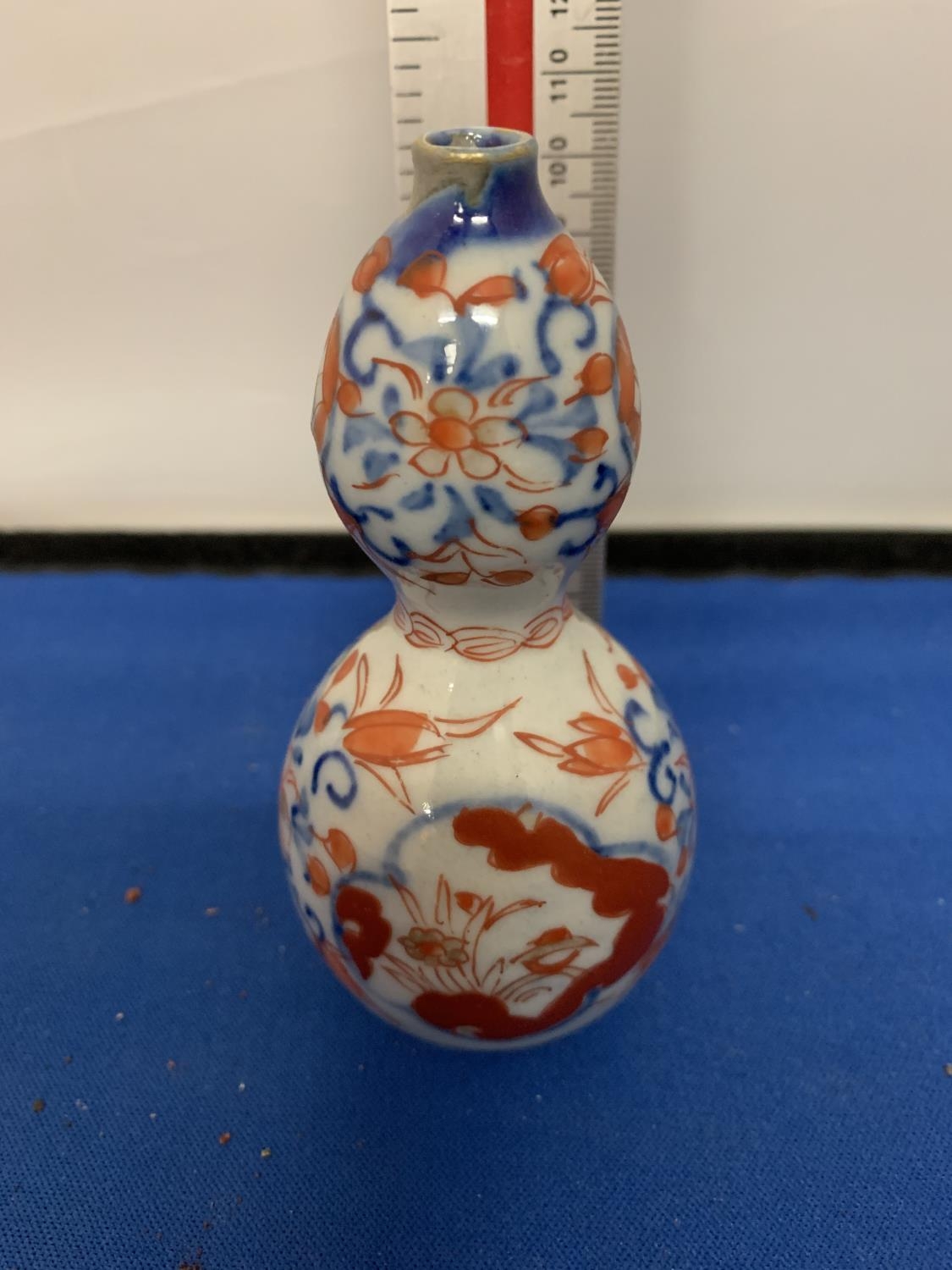 A MINIATURE JAPANESE IMARI DOUBLE GOURD SHAPE VASE, HEIGHT 11.5CM