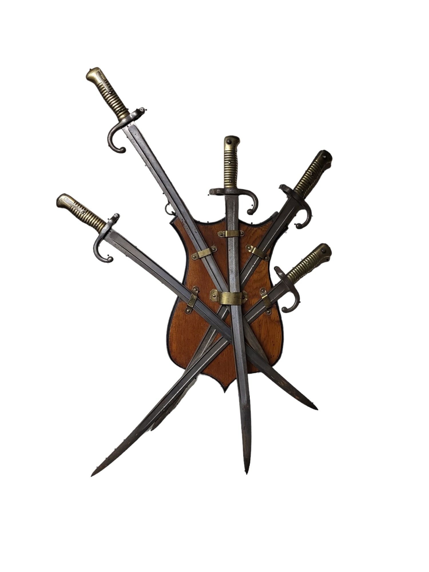Brass handles and inscribed blade edges including '1869, 1871, 1870’ and one undated bayonet, on oak and brass shield.