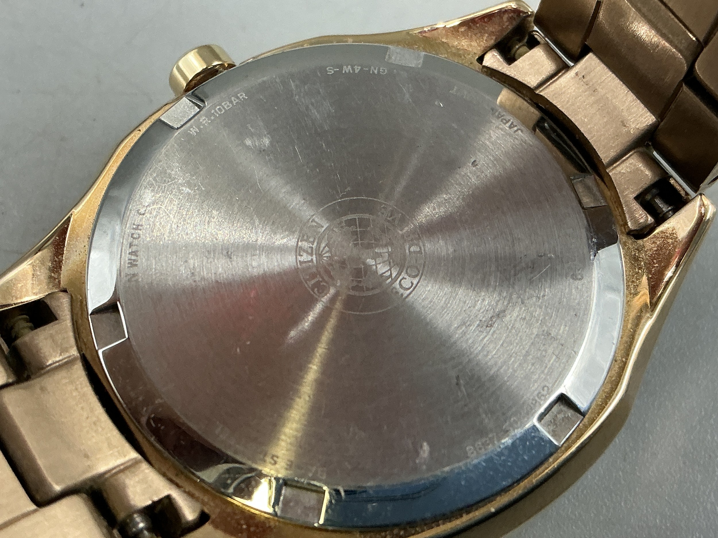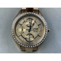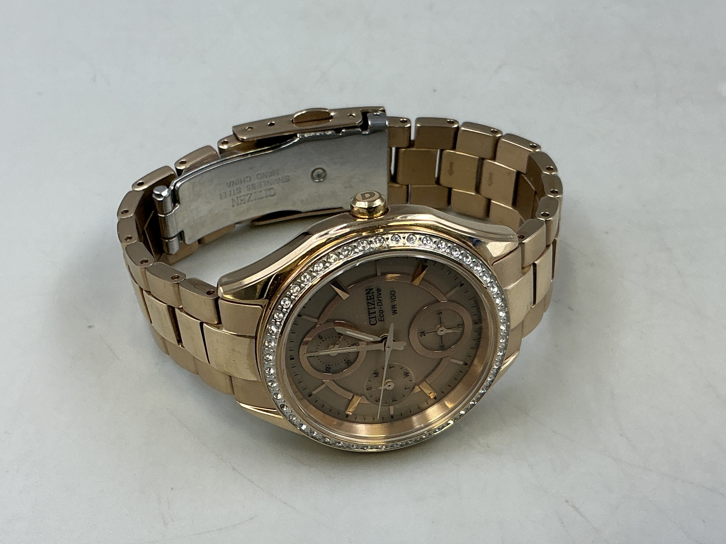 A Ladies Citizen Eco Drive (FD1063-57X) Watch - Gold Tone Accented Dial, Clear Stoned Bezel, And Gold Tone Strap. Working