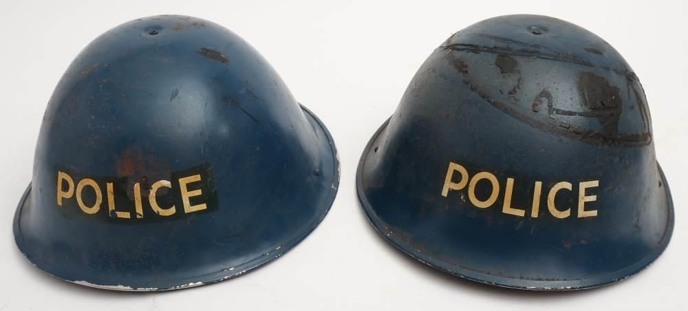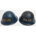 Two post War Police Mk III 'turtle' steel helmets: blue with transfer to front, both with original liners (2)