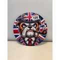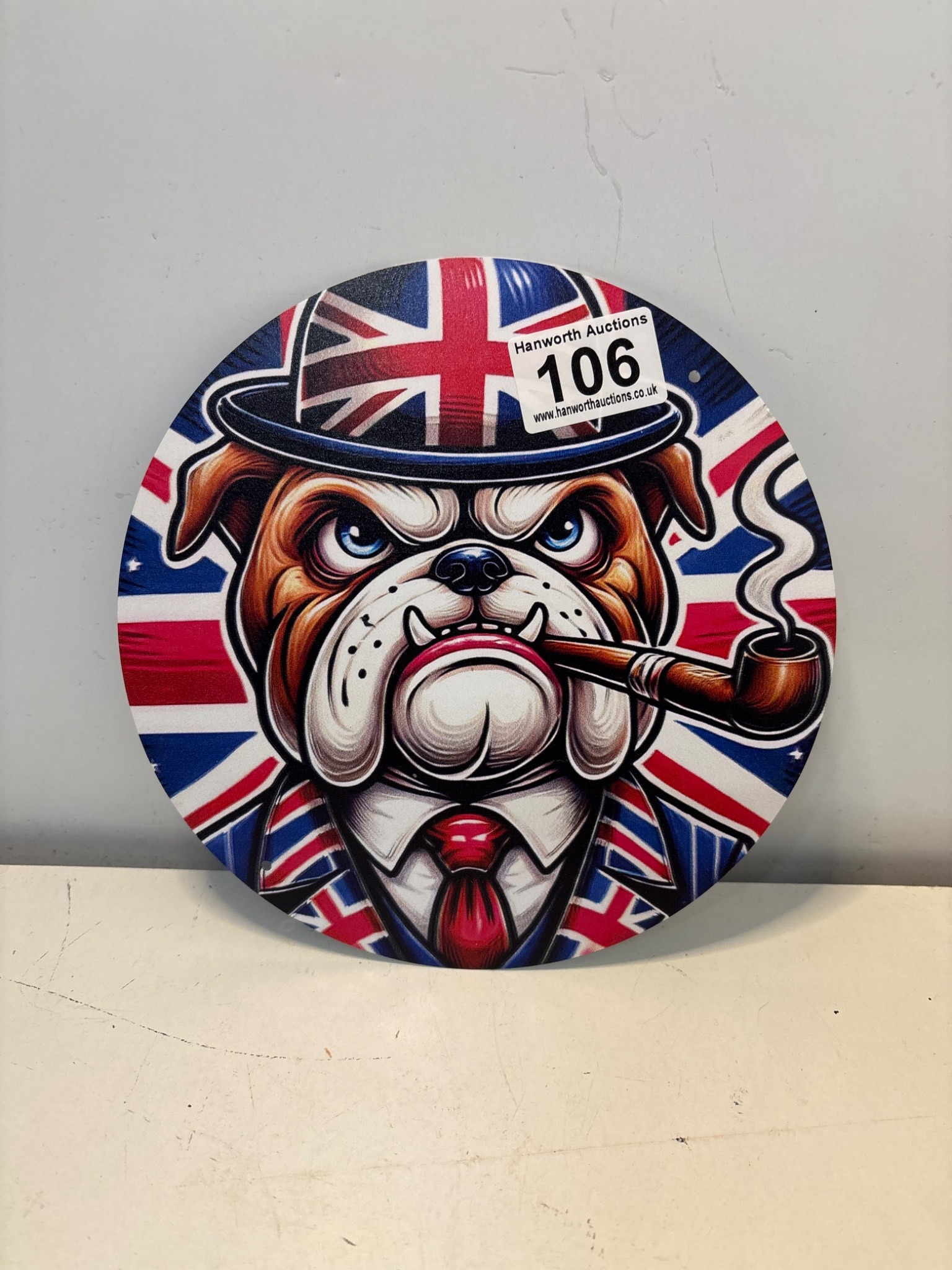 Round artwork featuring a bulldog smoking a pipe.