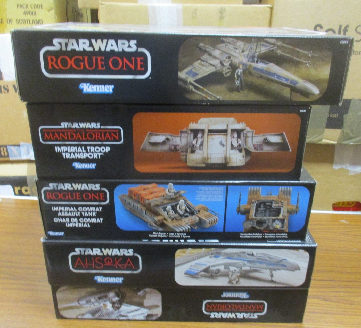 Star Wars. Hasbro. Range of The Vintage Collection vehicles, generally mint in near mint boxes, with Ahsoka New Republic E-Wing, Rogue One Antoc Merrick's X-Wing Fighter, Imperial Combat Assault Tank, The Mandalorian Imperial Troop Transport and N-1 Starfighter. Qty 5 (2B)