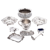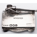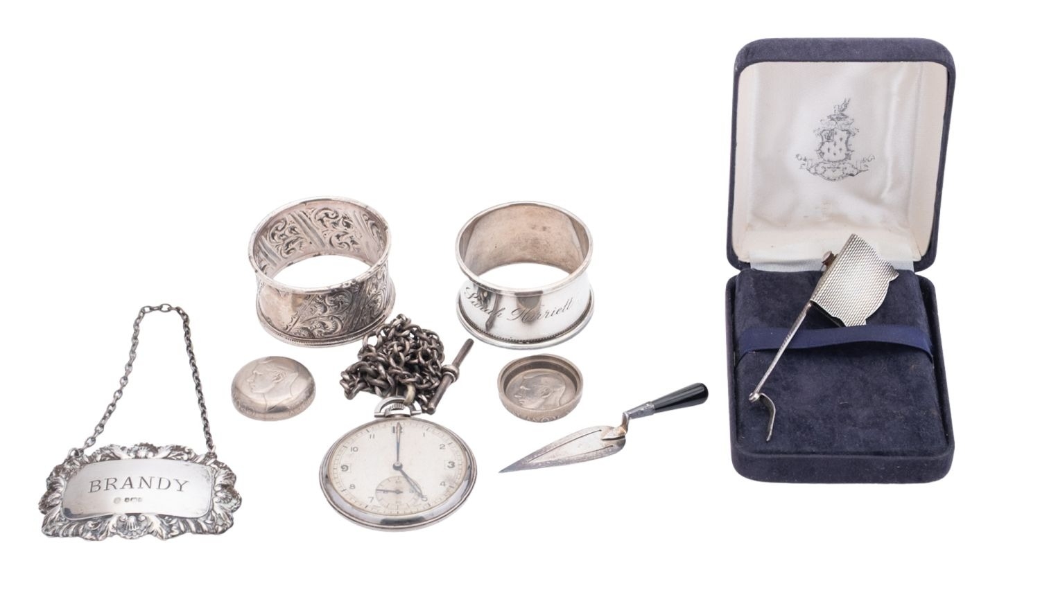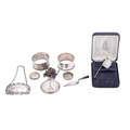 A George VI silver mechanical bookmark, by Asprey & Co Ltd, with engine-turned decoration and patent no., London 1946, together with a silver bookmark, a silver wine label 2 silver napkin rings (one inscribed), a white metal pocket watch and a coin box, mixed makers & dates; the bookmark 3.25'' (8.2cm) long; 2ozt weighable silver (7)