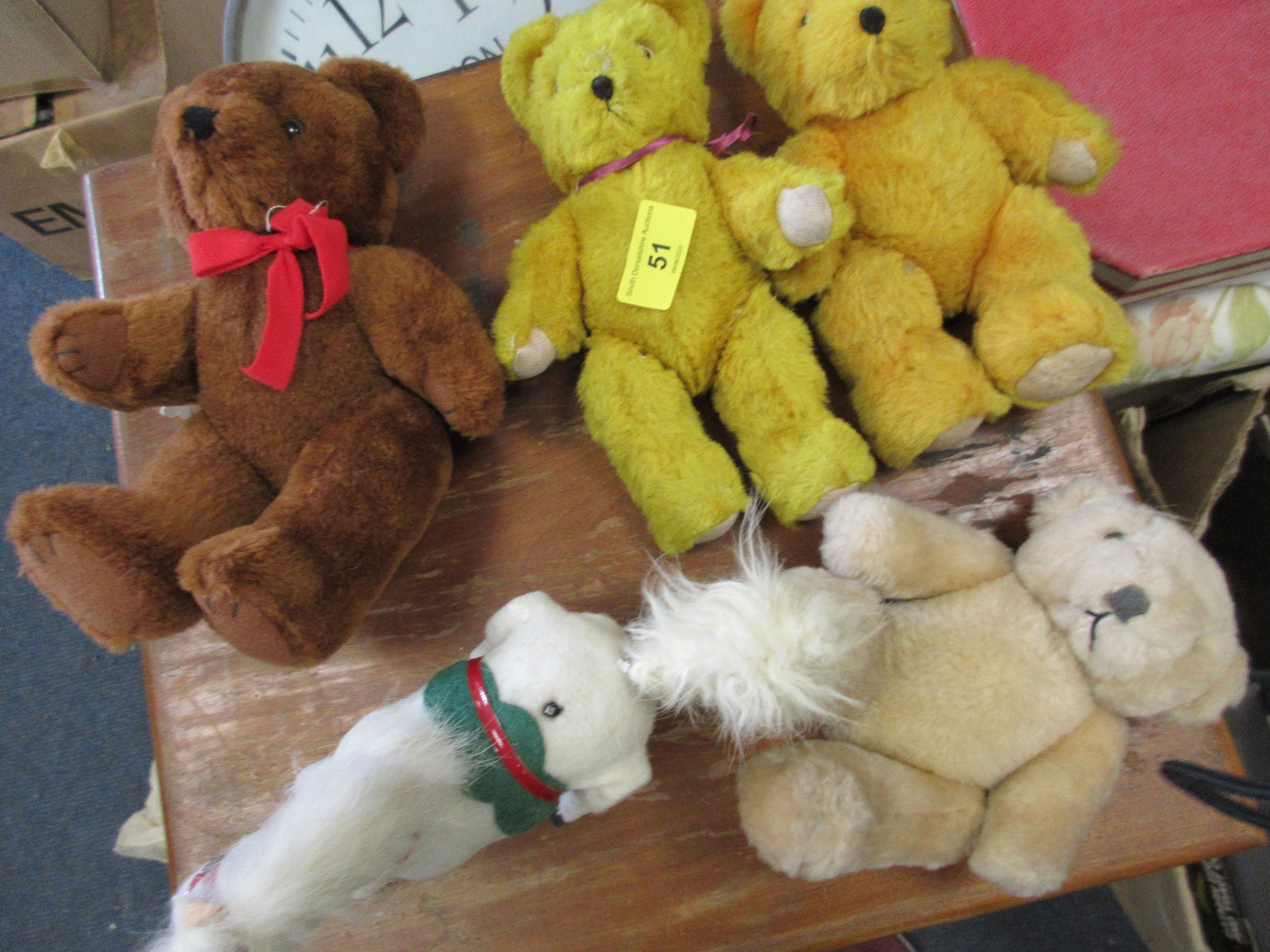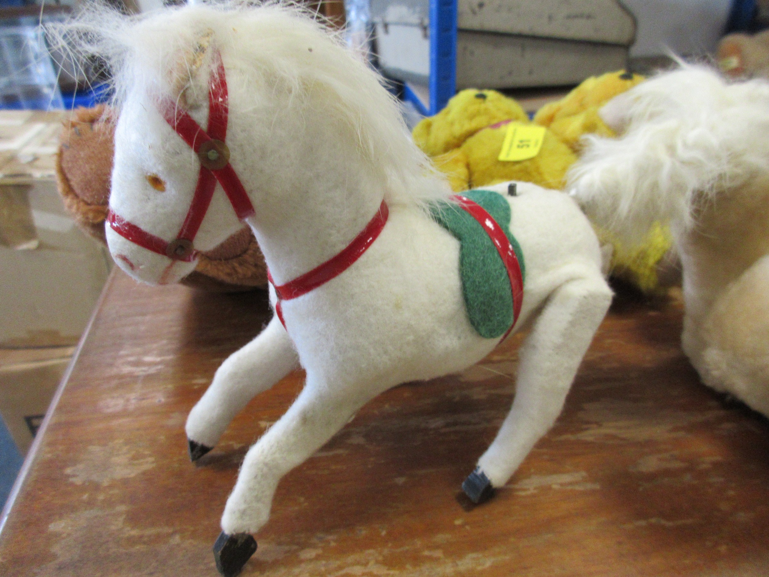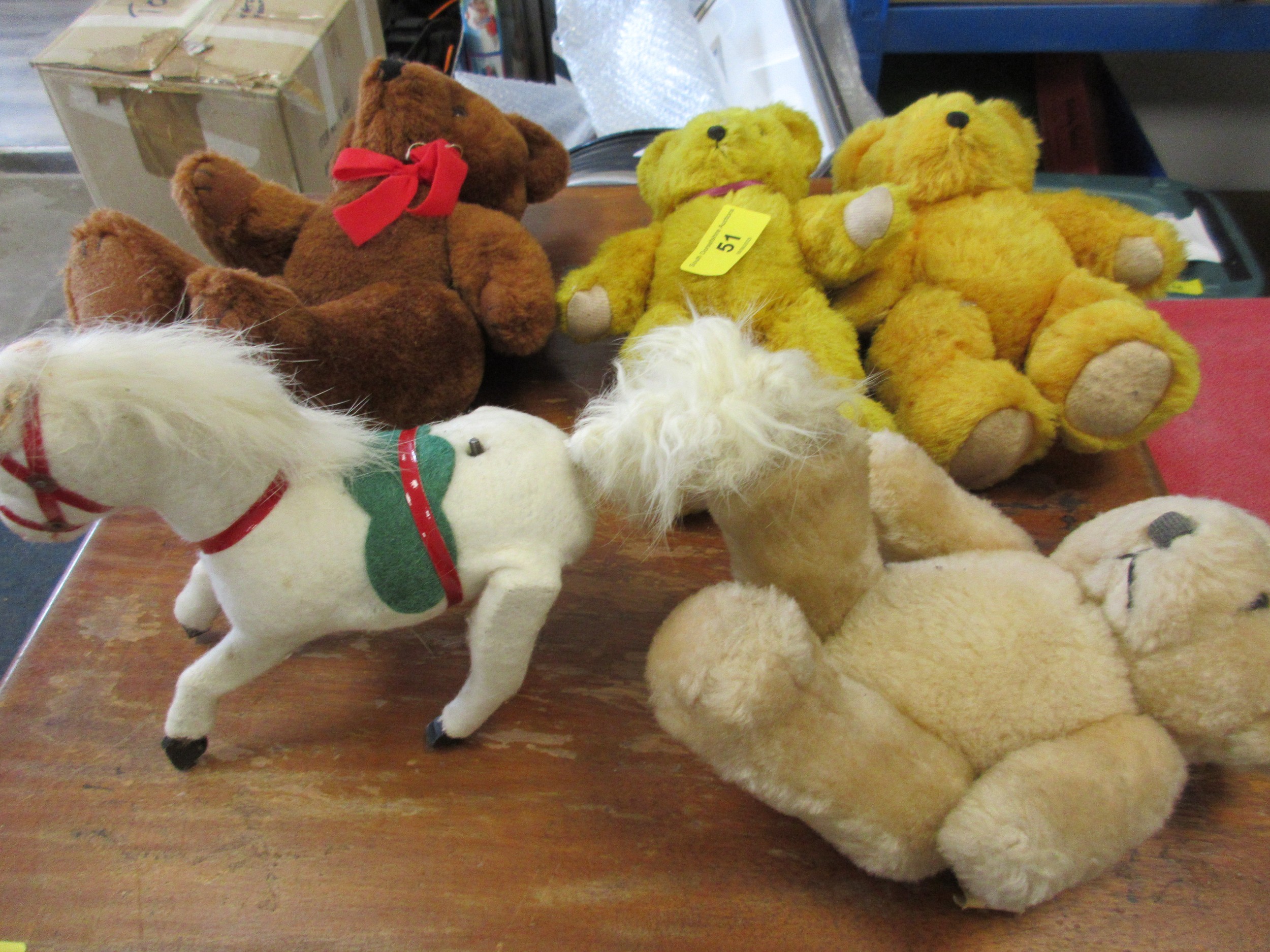Four Vintage Teddy Bears and Clockwork Wind-up Horse (no key)