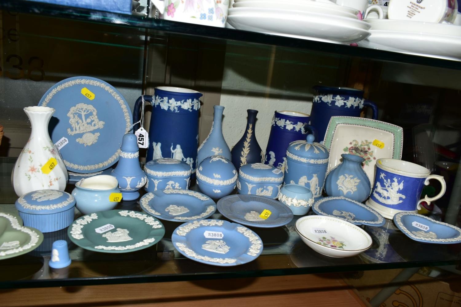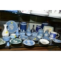 VARIOUS WEDGWOOD TRINKETS, JUGS, VASES, PLATES etc, mostly dark and light blue jasperwares, including graduating jug set, tallest height 19cm, green trinkets etc (28)