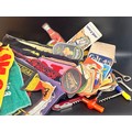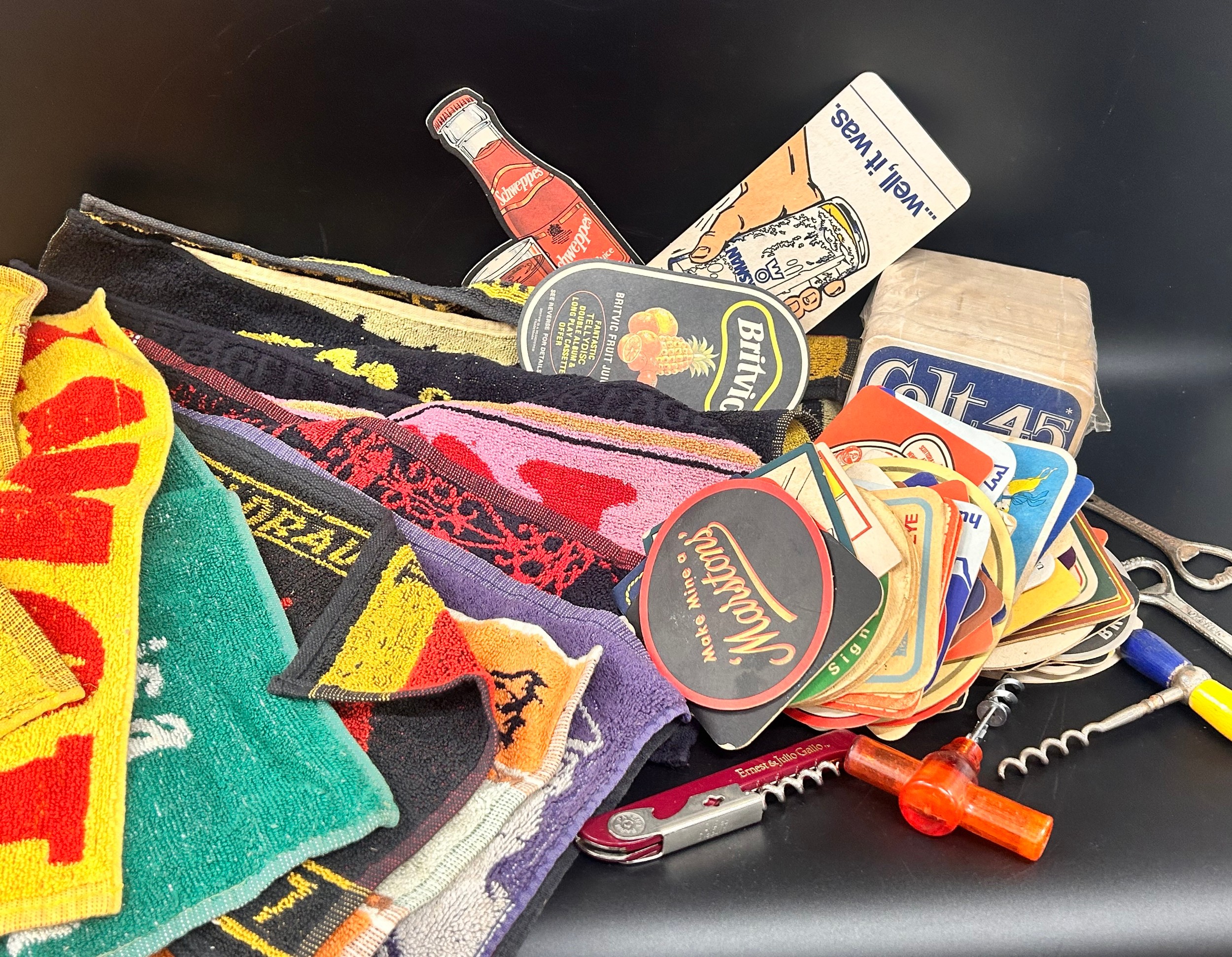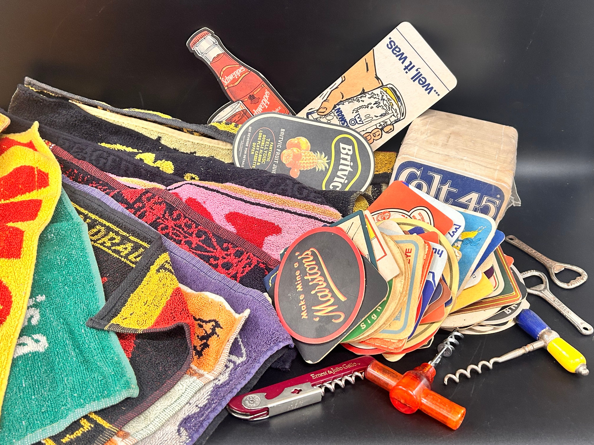 Breweriana; Ten vintage beer towels, unopened pack of beer mats and some loose, two metal bottle openers and four corkscrews