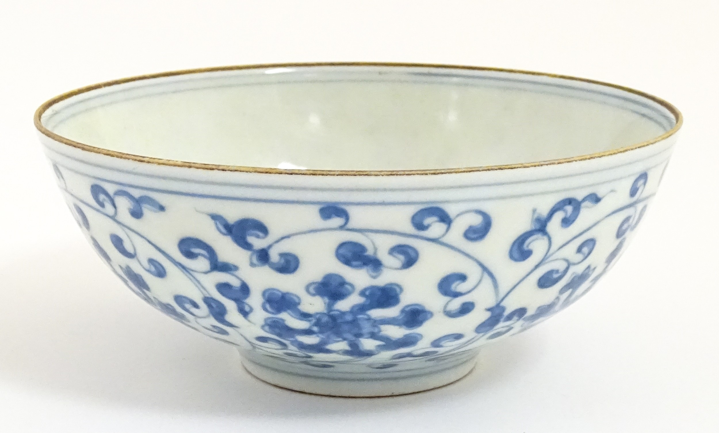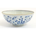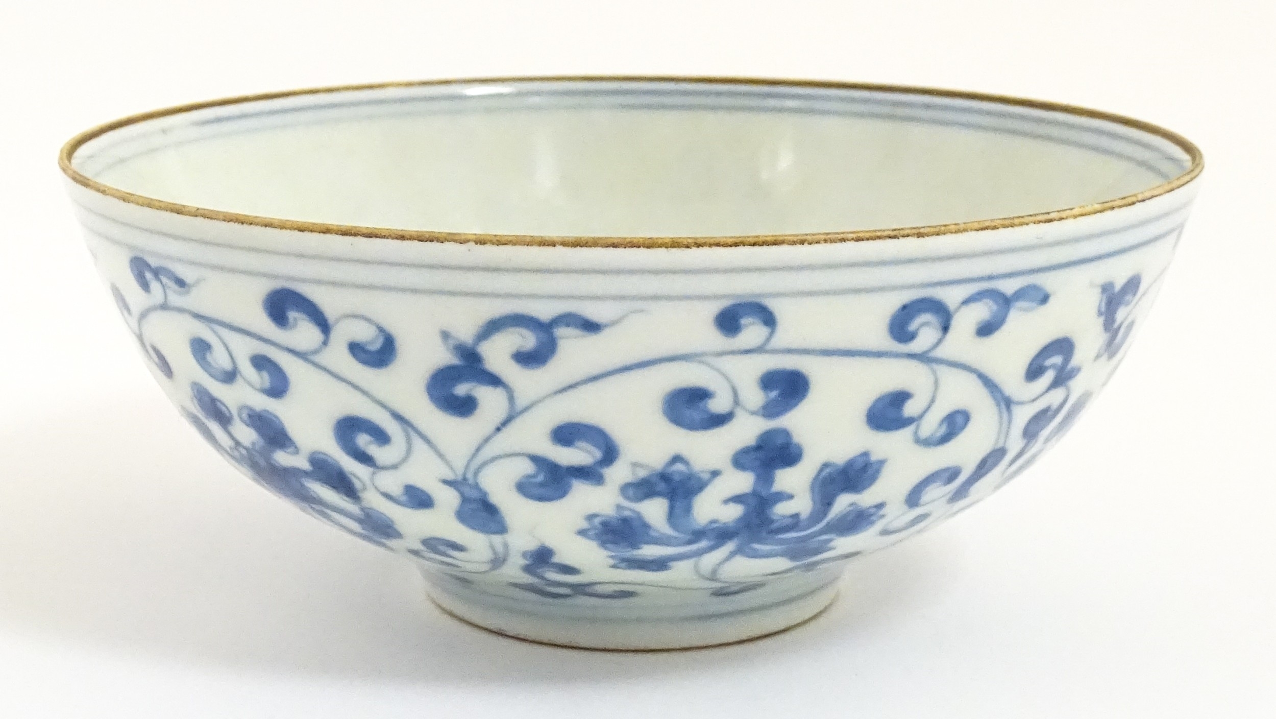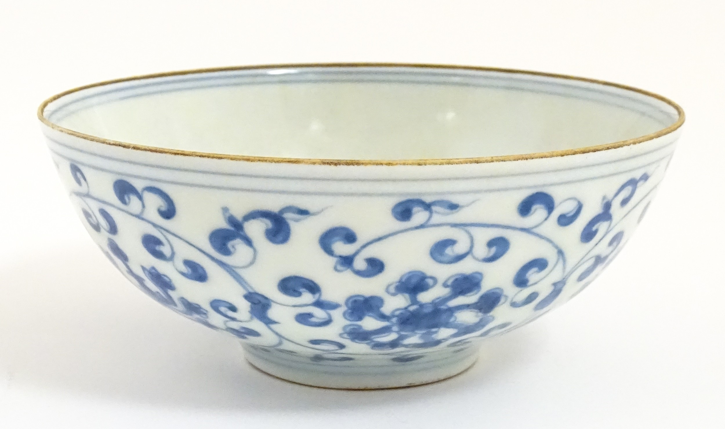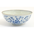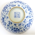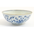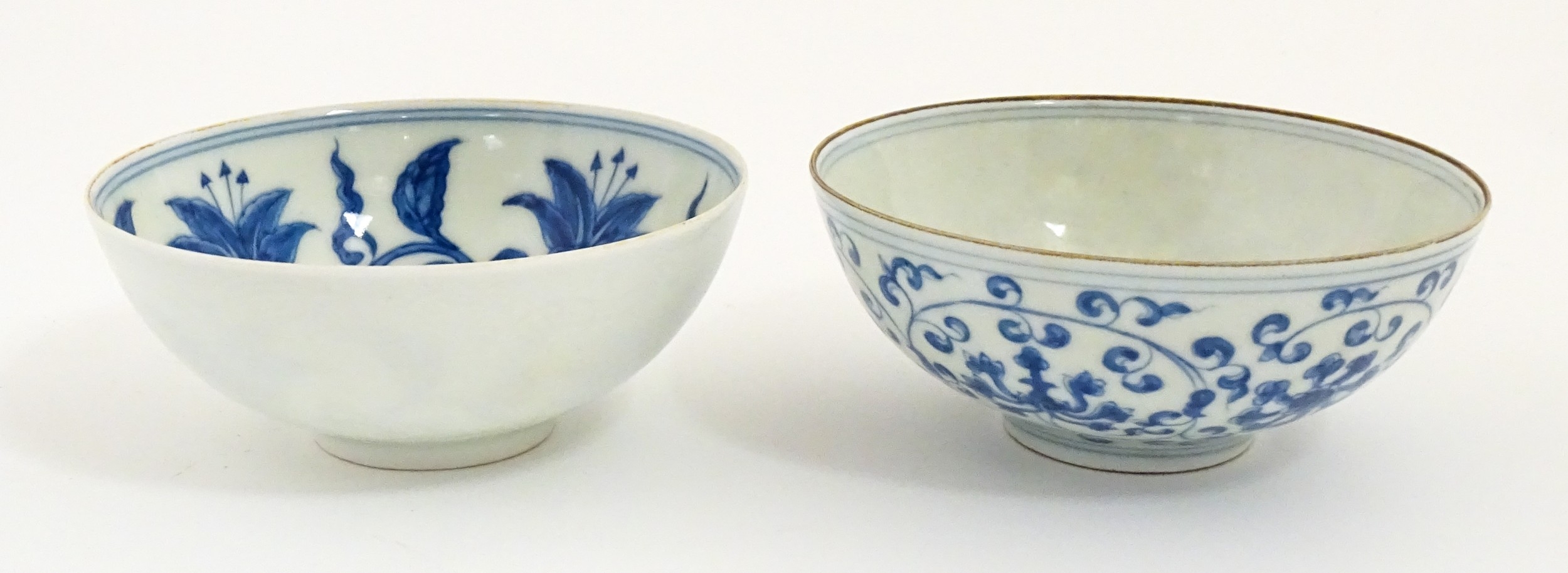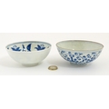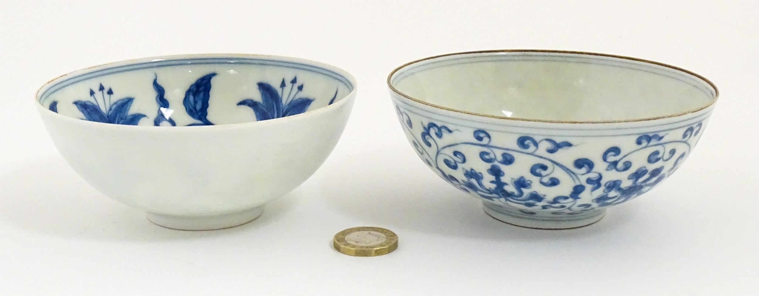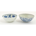 Two small Chinese blue and white bowls with scrolling floral decoration. Both with character marks under. Largest 4 3/4" wide (2)