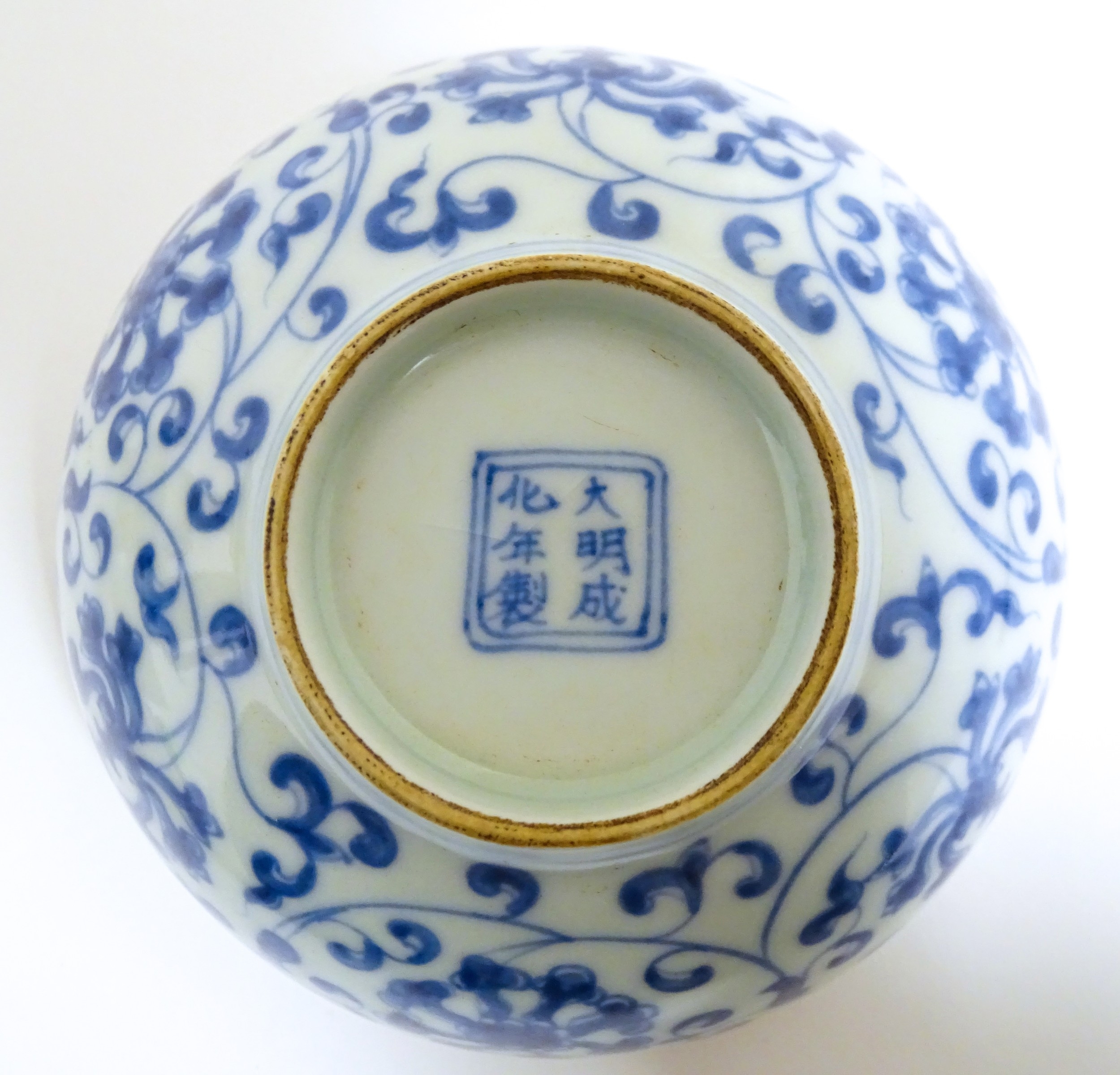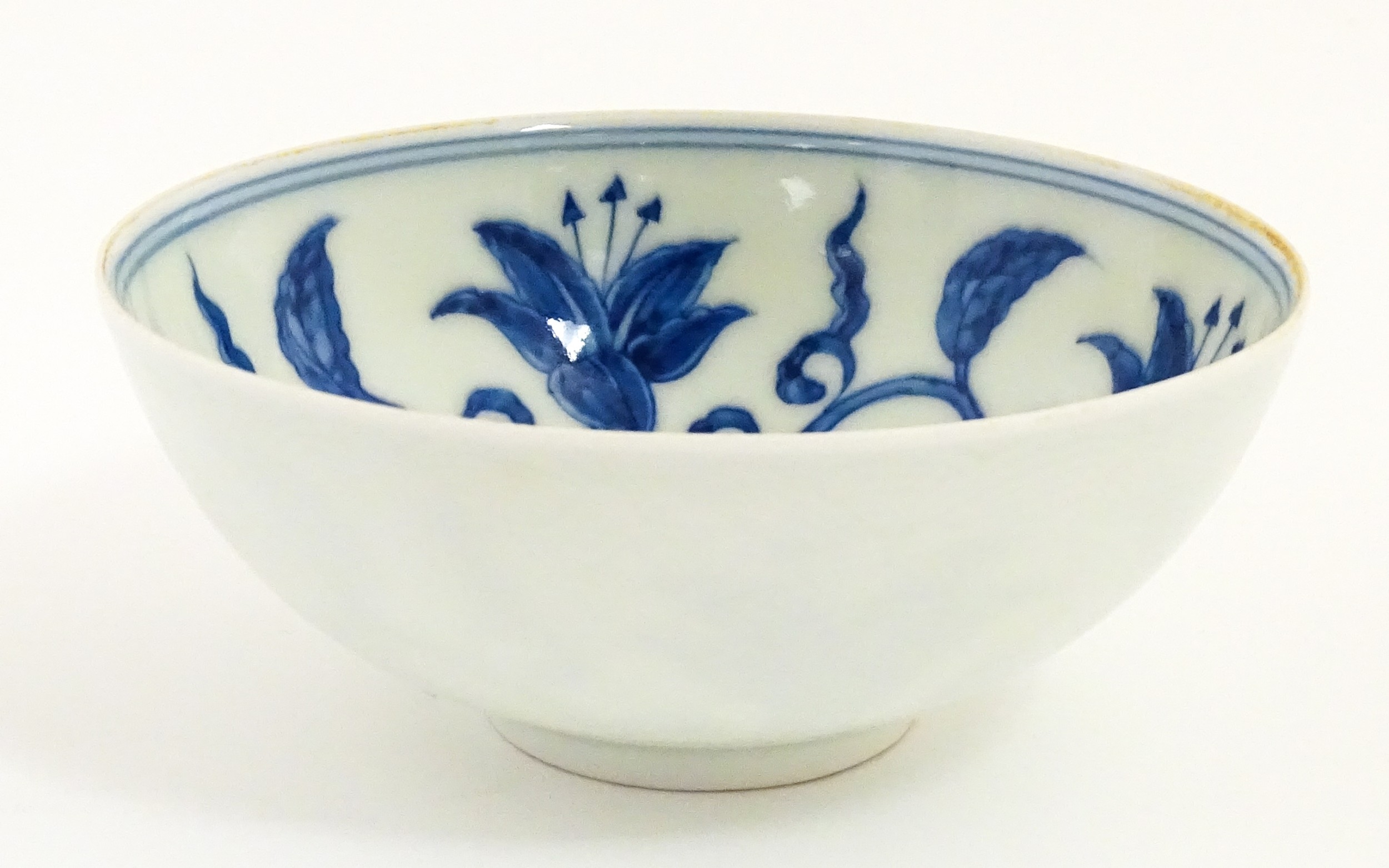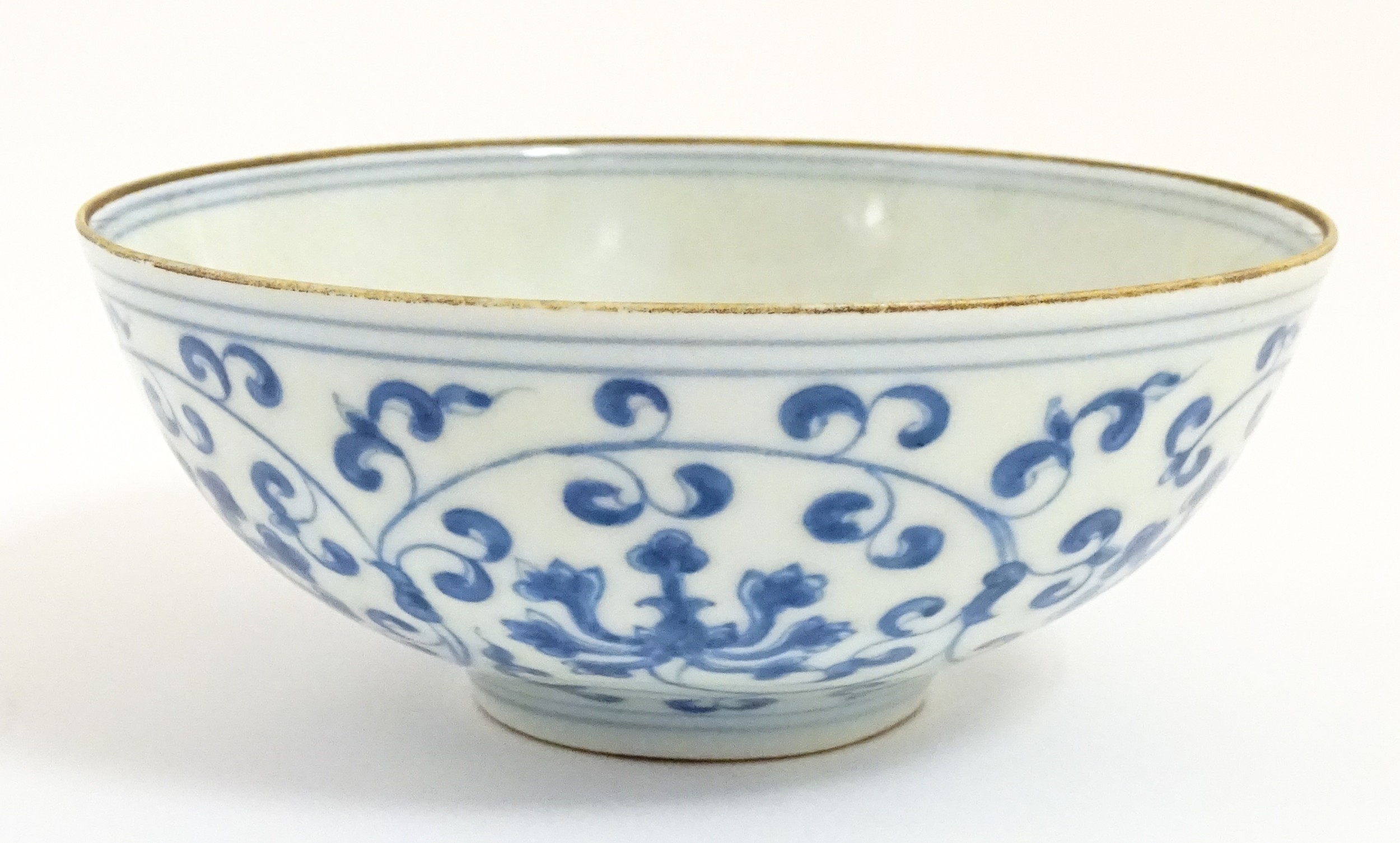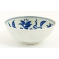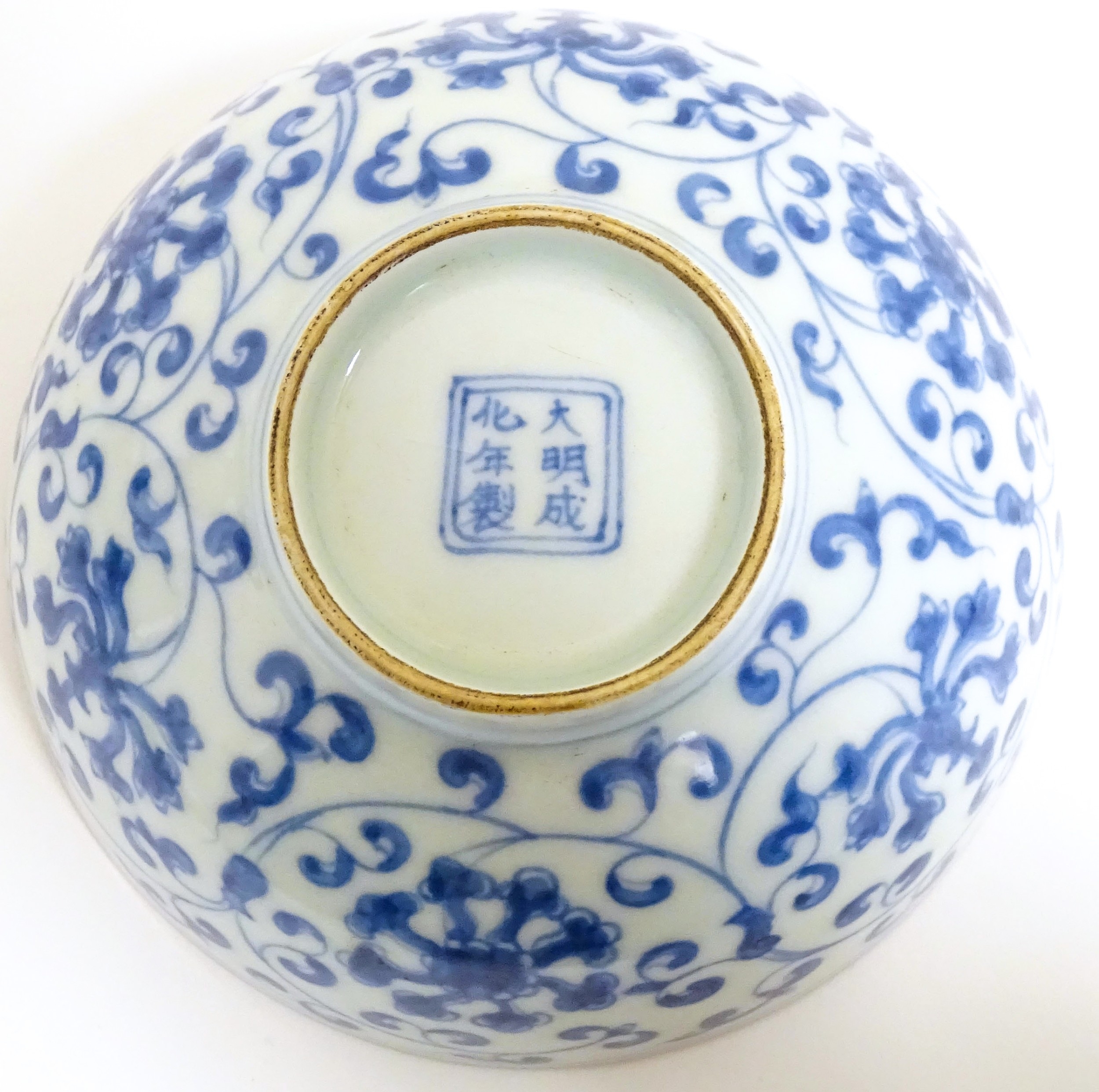 Two small Chinese blue and white bowls with scrolling floral decoration. Both with character marks under. Largest 4 3/4" wide (2)