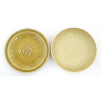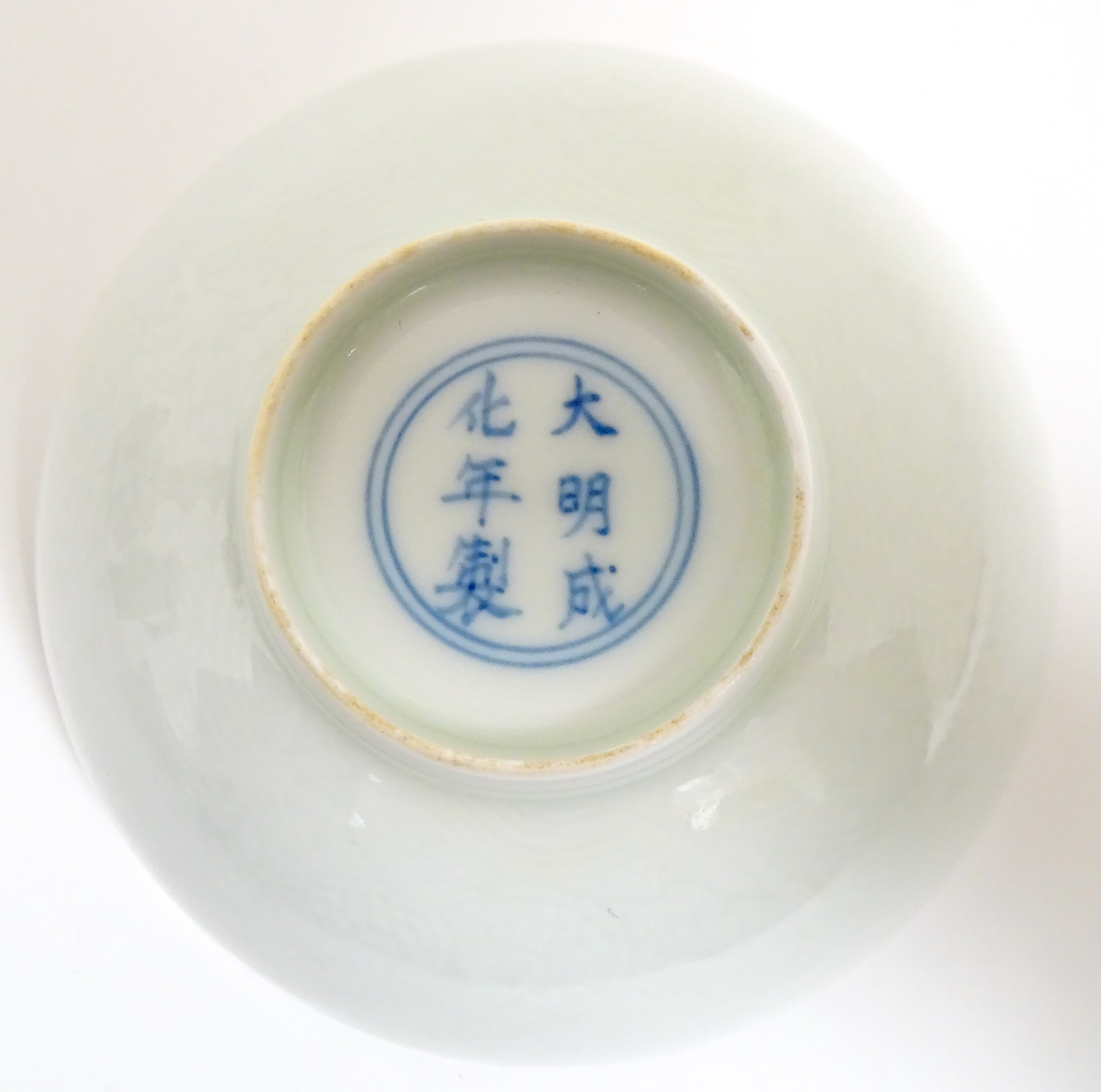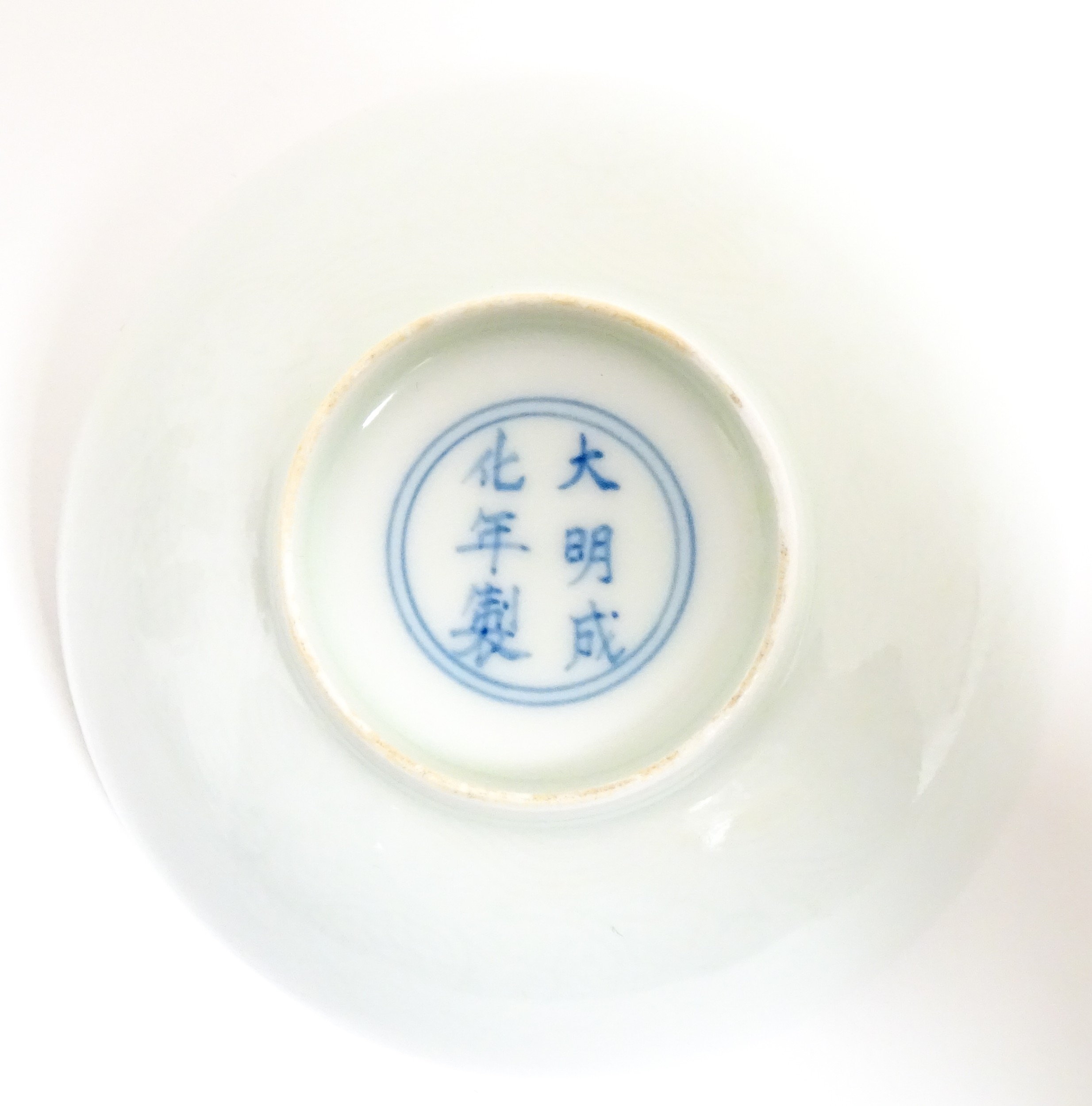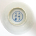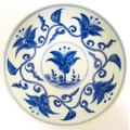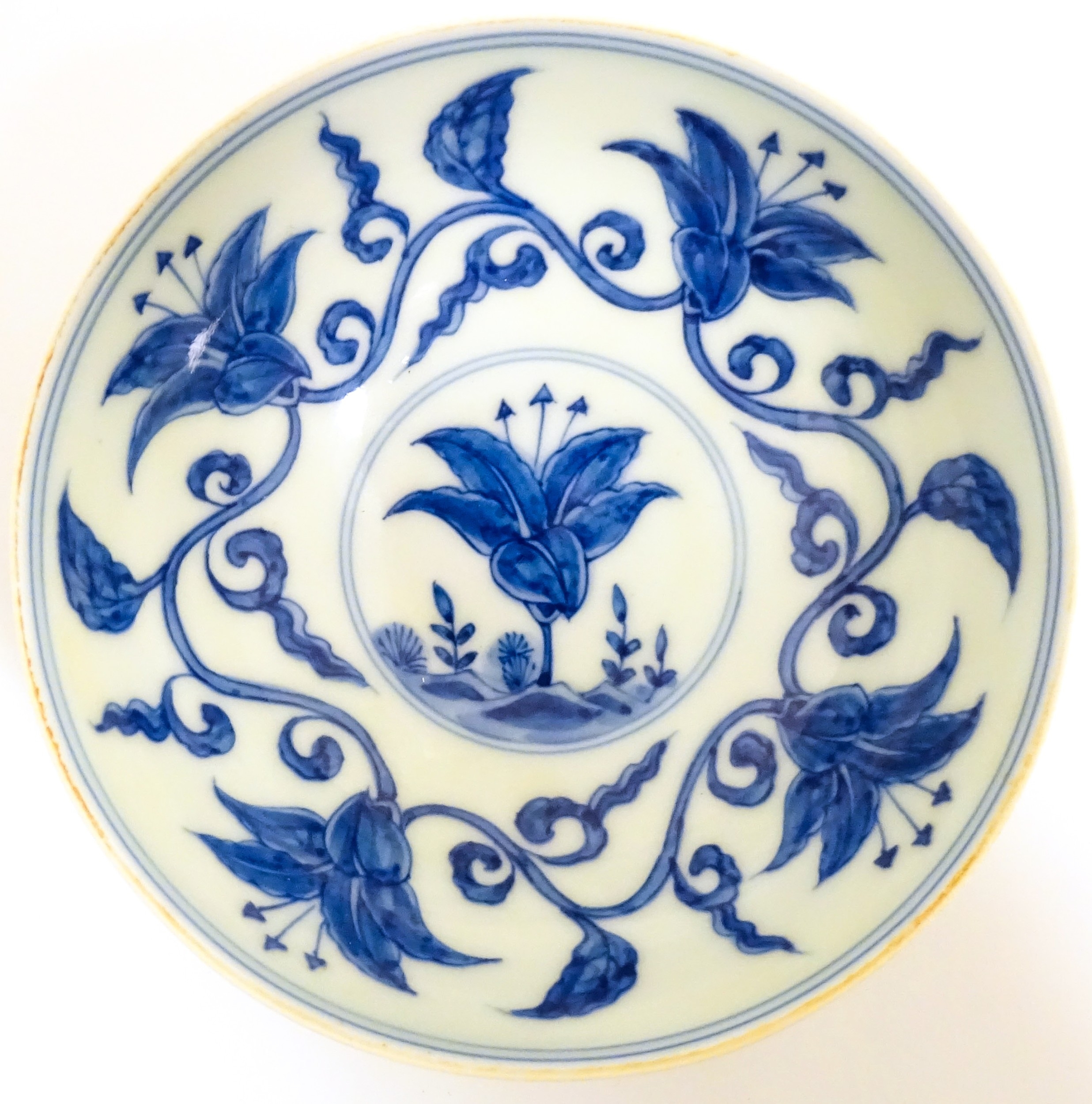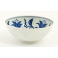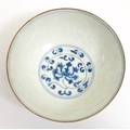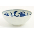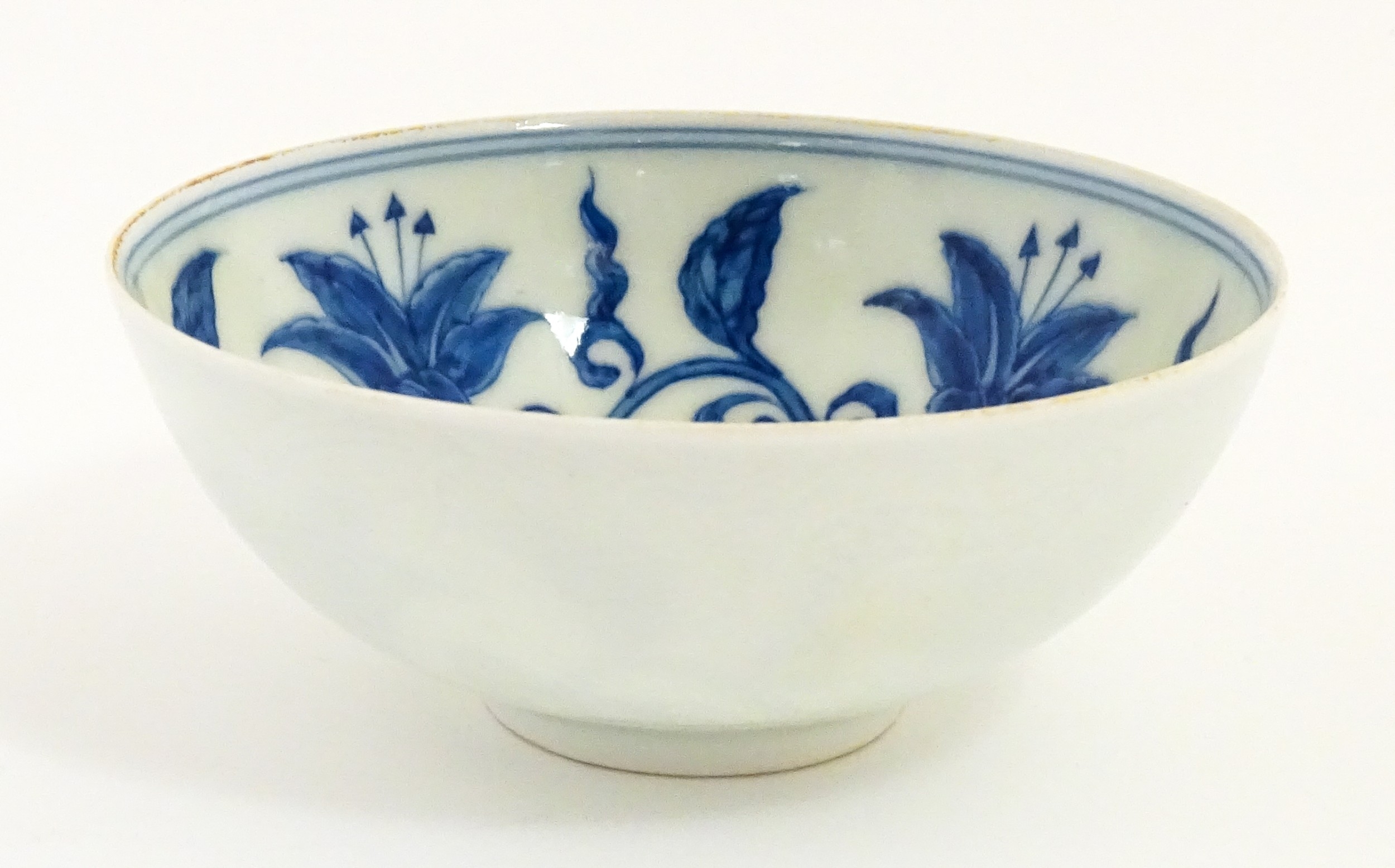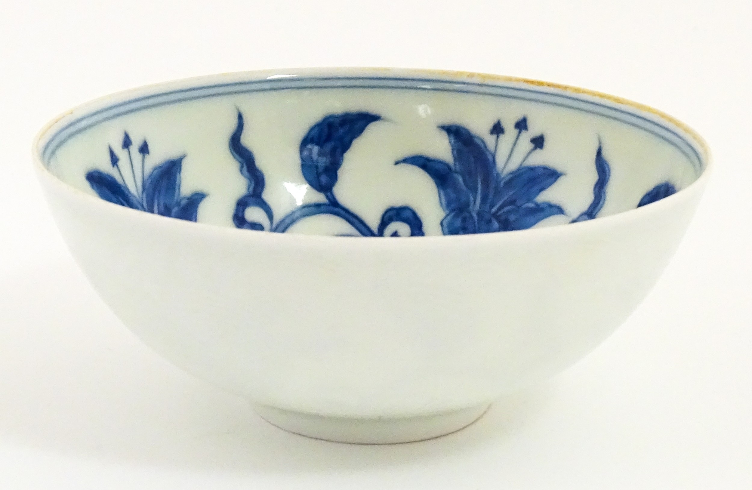 Two small Chinese blue and white bowls with scrolling floral decoration. Both with character marks under. Largest 4 3/4" wide (2)