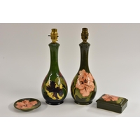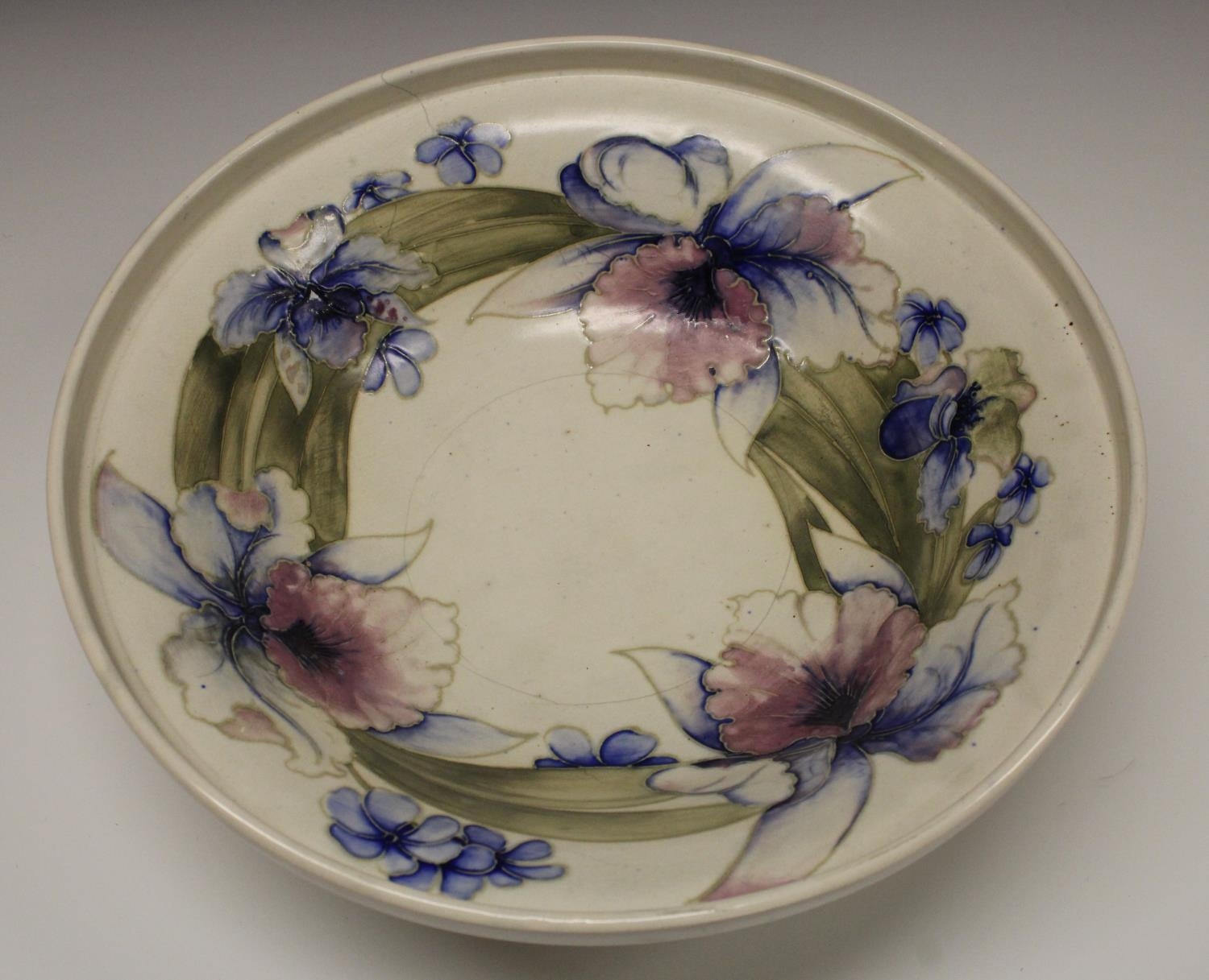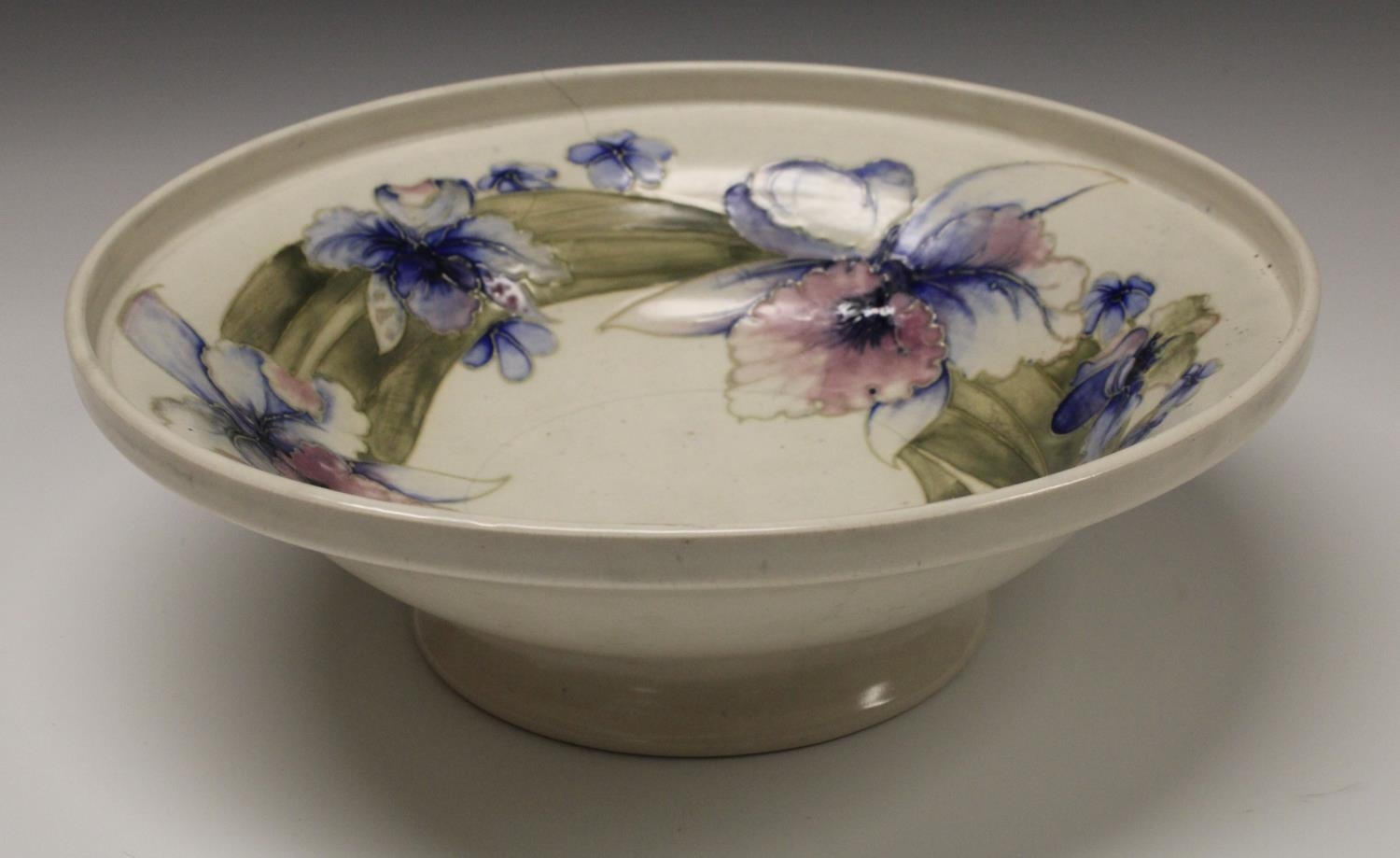 A Moorcroft Orchid pattern pedestal bowl, tube lined with large flowerheads on white ground, 31cm diam, impressed mark, signed in blue