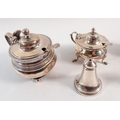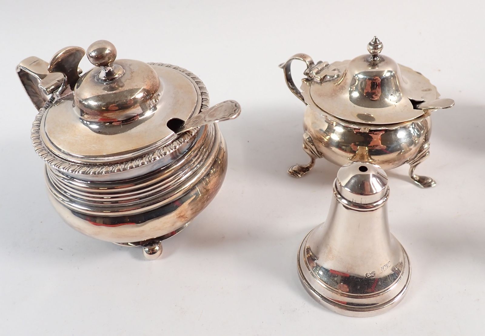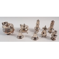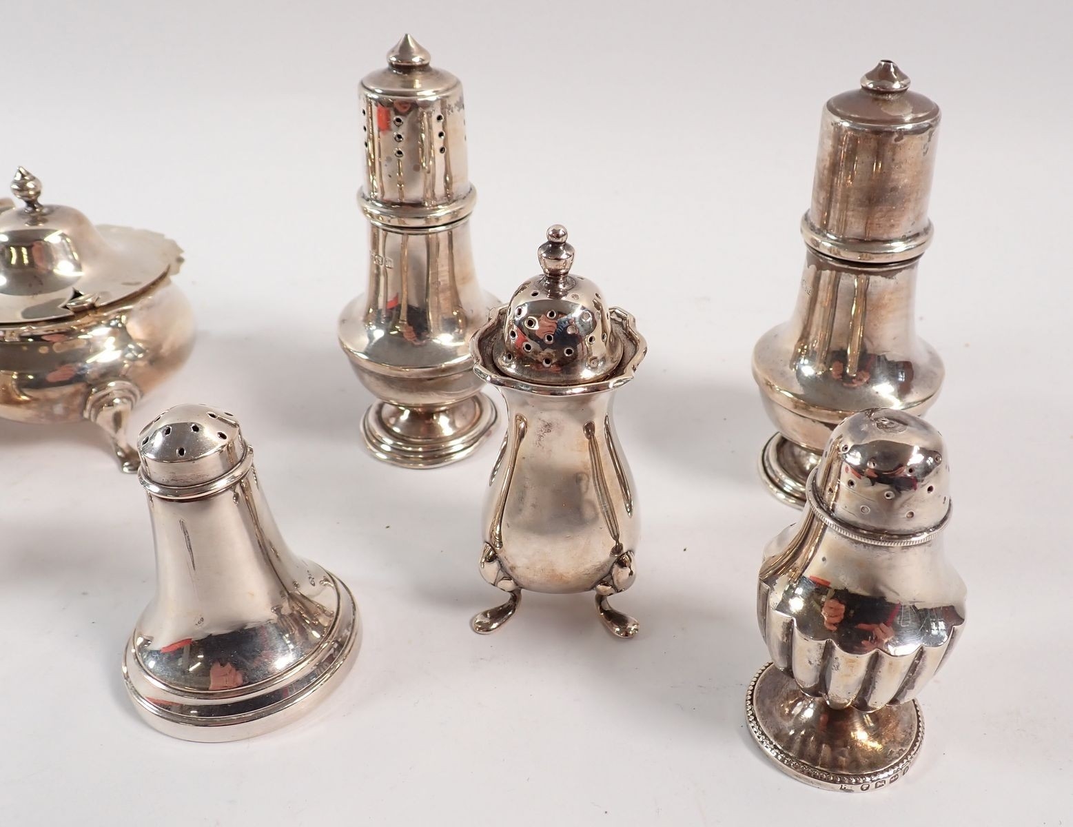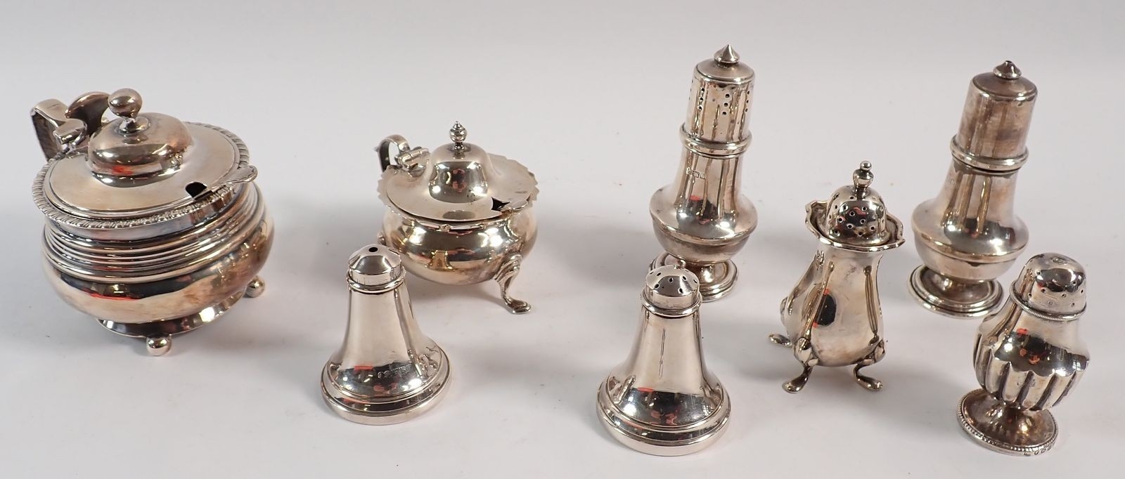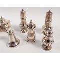 Two silver pairs of pepper pots and two single pepper pots plus two mustard pots, largest 9cm tall, 356g