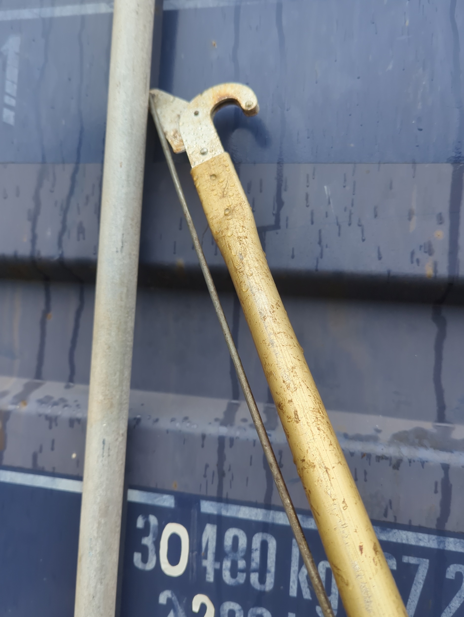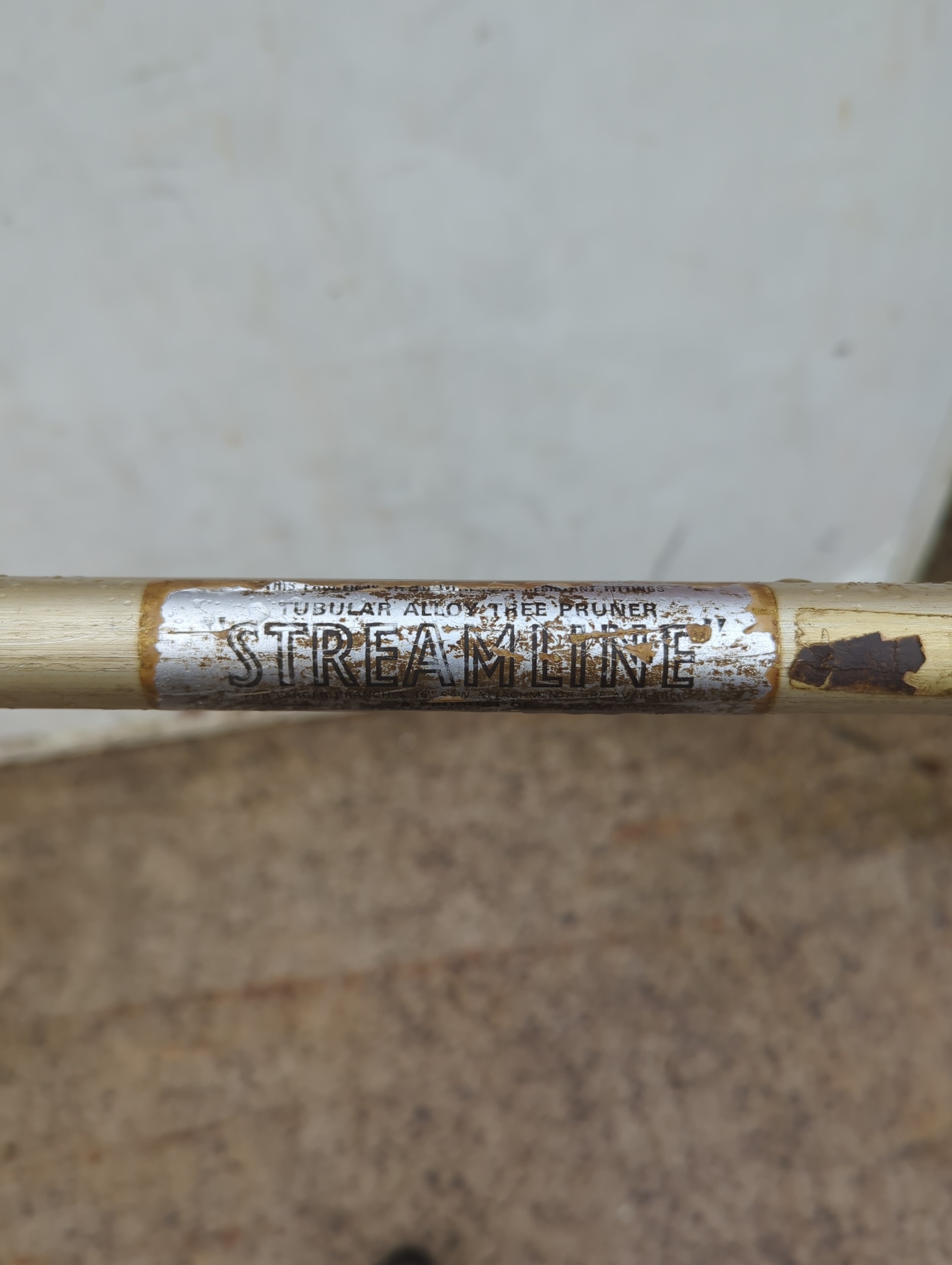 The item is a Streamline telescopic saw designed for outdoor use, featuring a long extendable pole with a hooked attachment for cutting branches. The saw includes a blade mechanism suitable for reaching high or difficult spots. It bears a metal tubular construction with a visible label featuring the brand name.